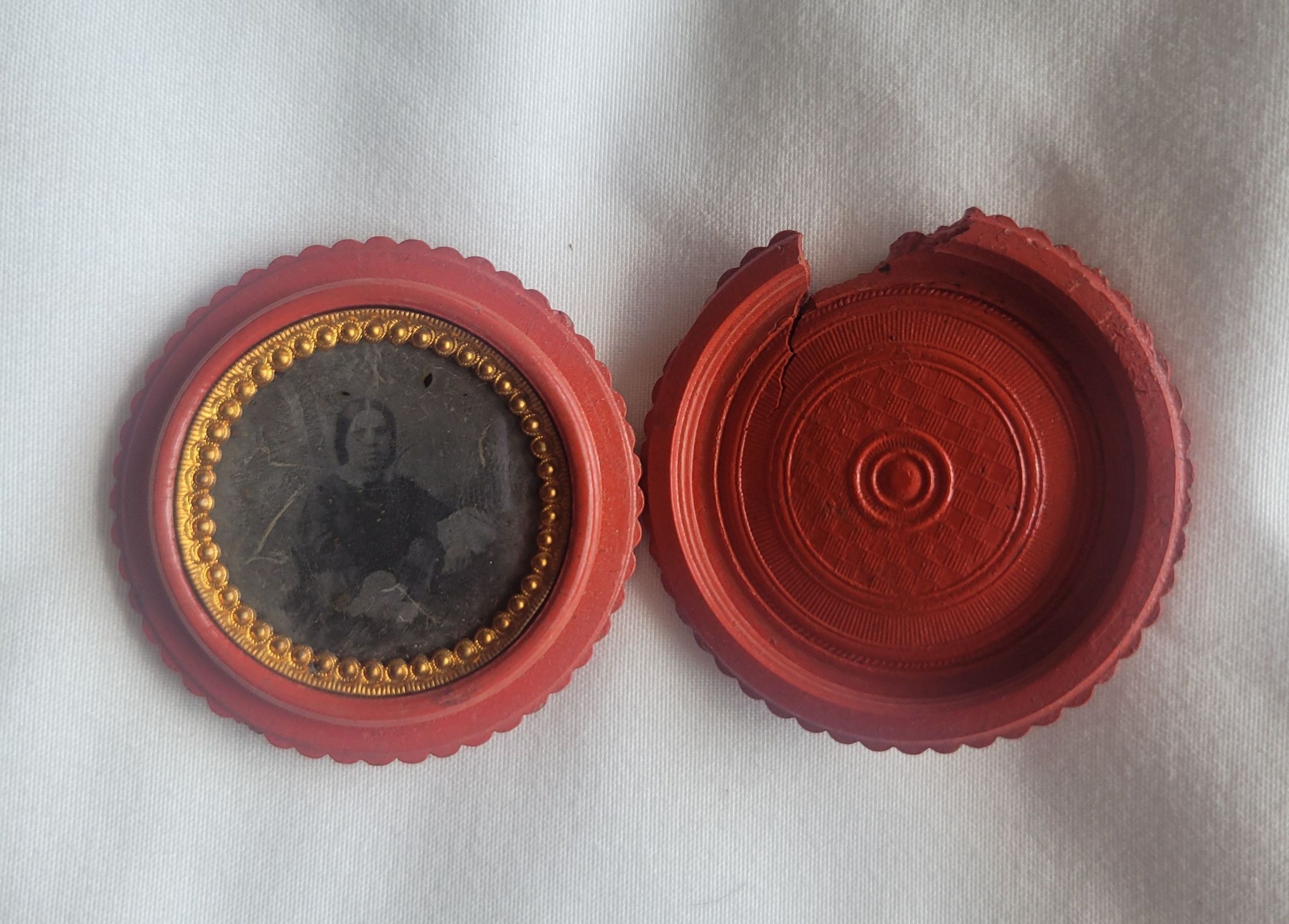 A tintype photograph in a red, round, 1.75" diameter case made of gutta-percha. Tintype photographs were patented in 1856 and were actually printed on iron rather than tin. They were durable and provided a clean and clear image. This photograph is of a white woman with dark hair in a dark dress with one hand in her lap and the other resting on something next to her. The photo is rimmed with a gold beaded border.