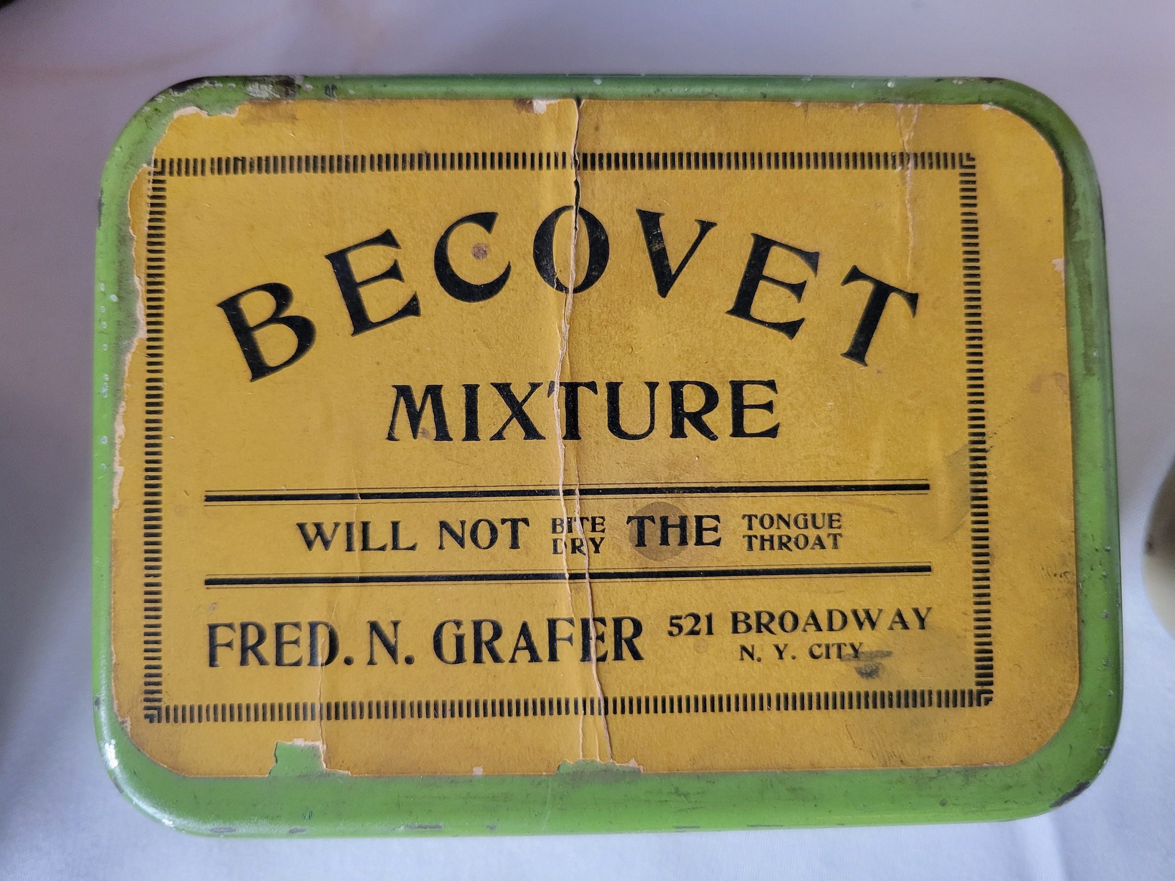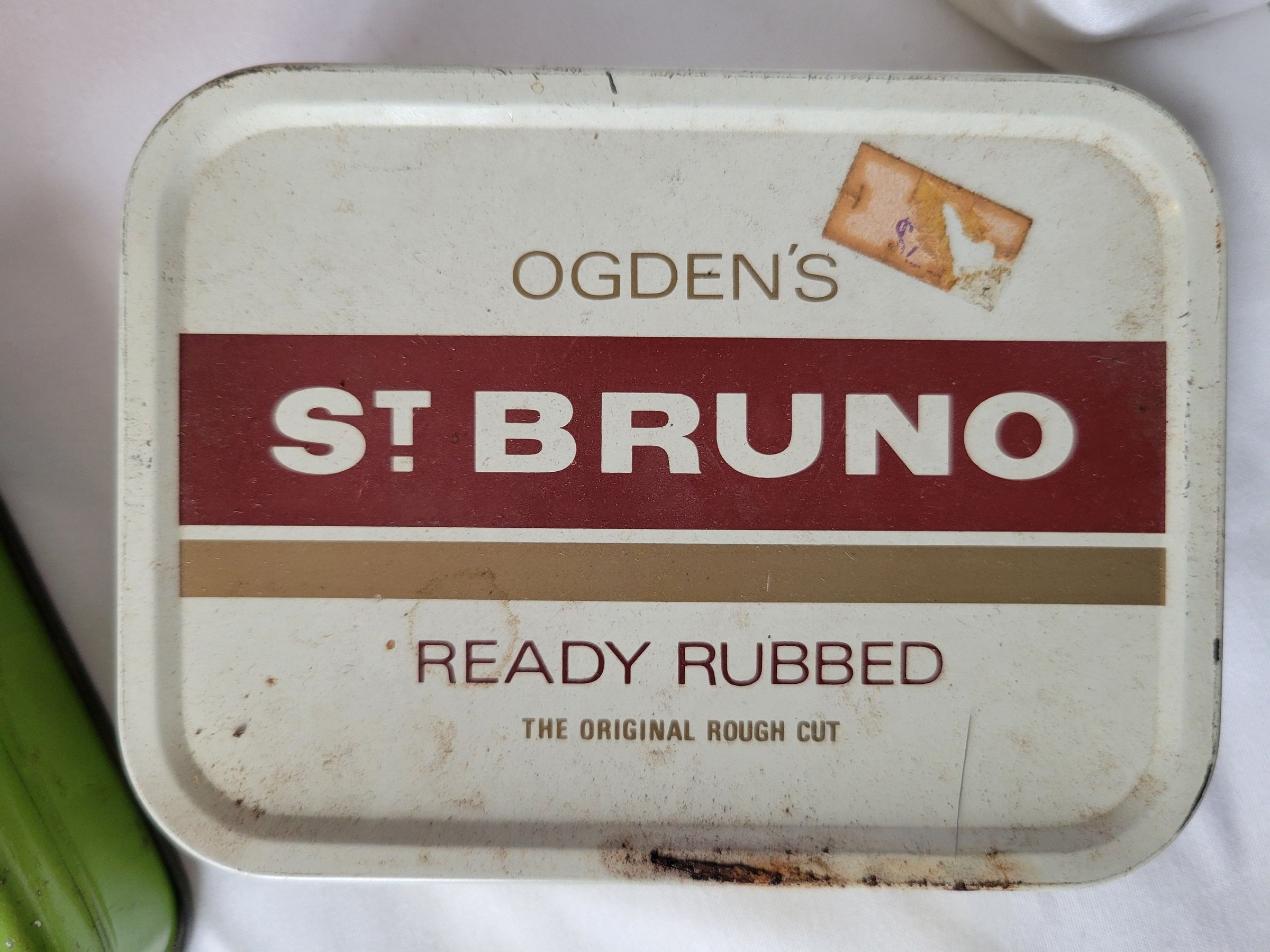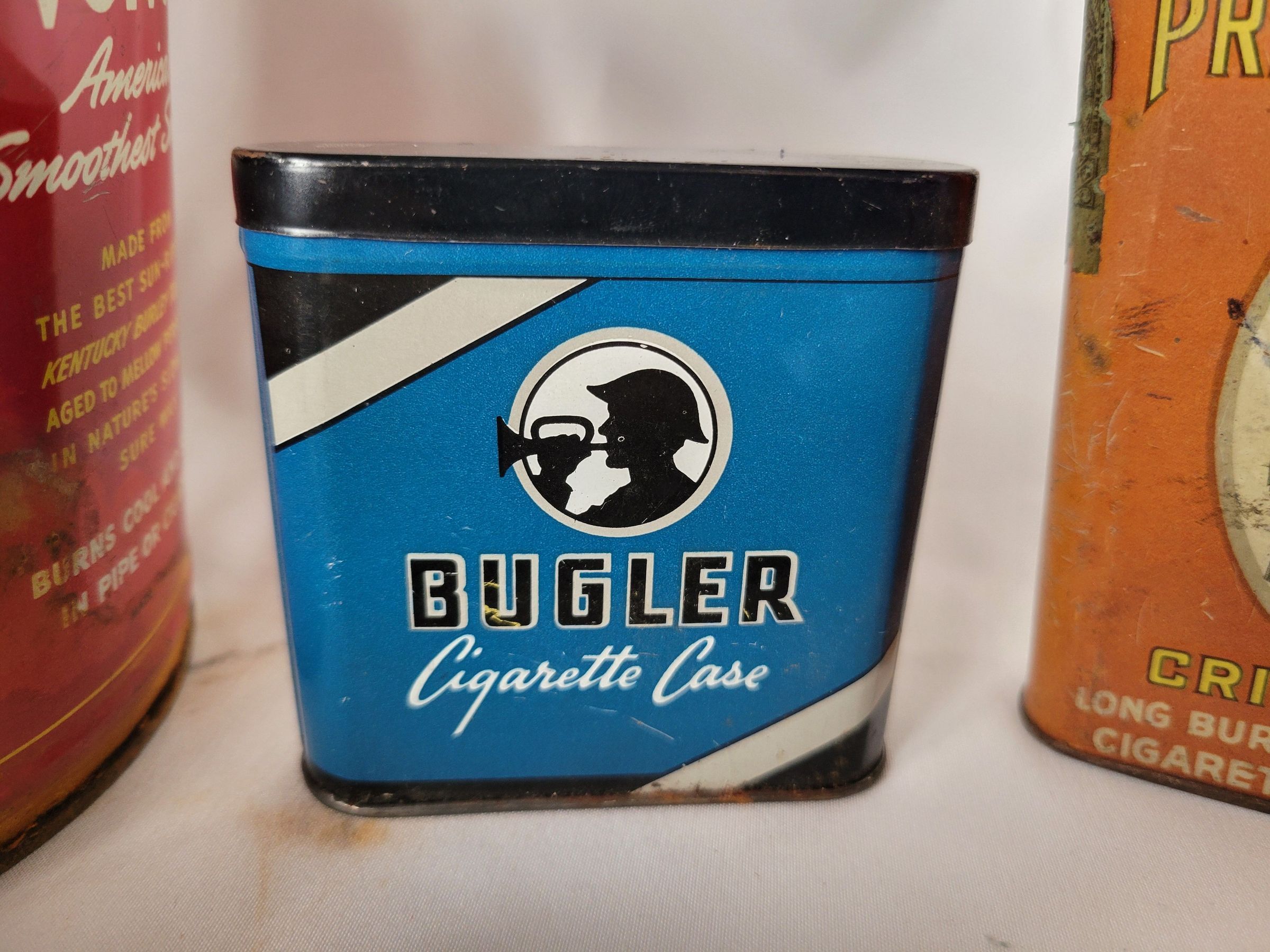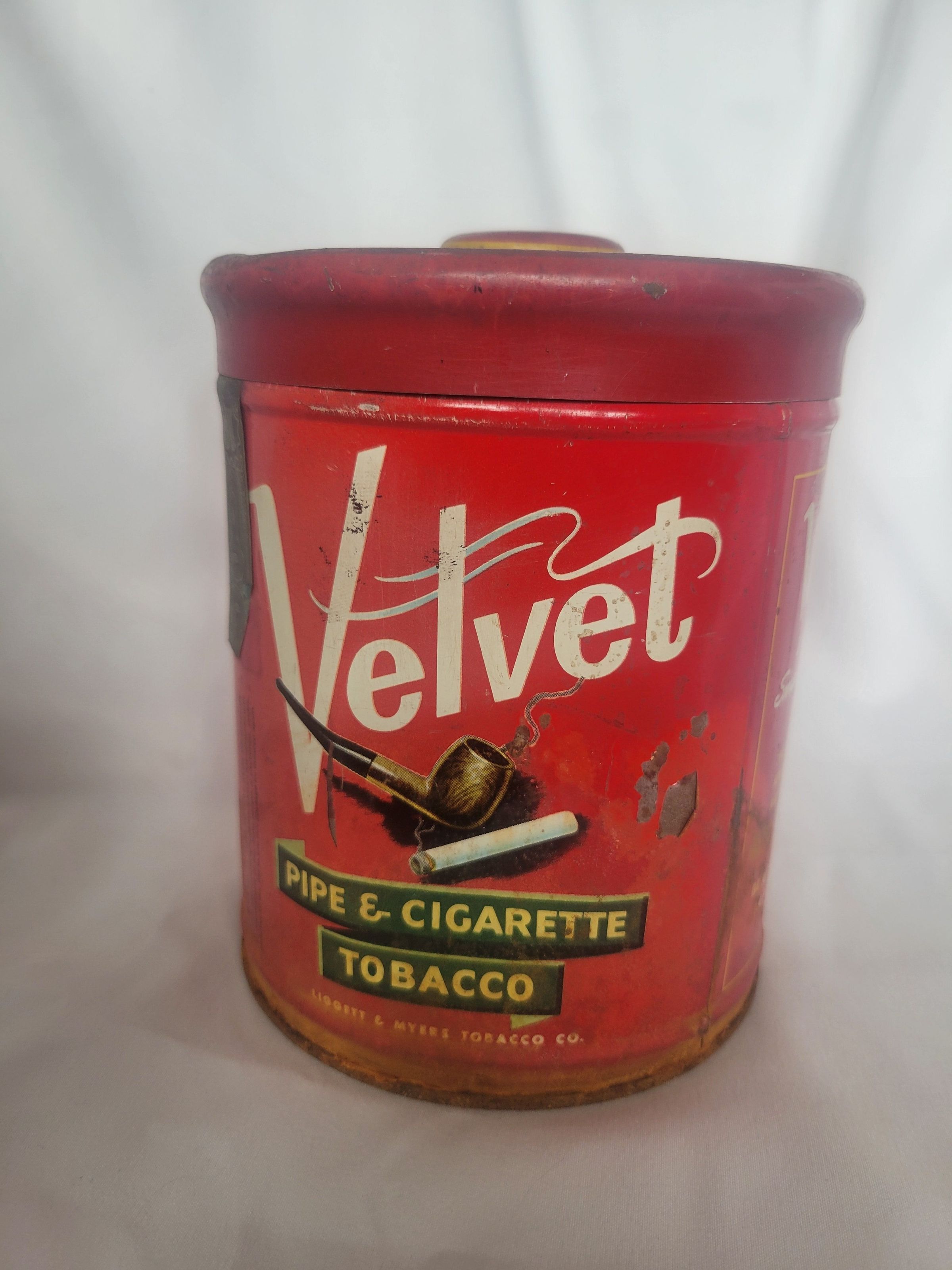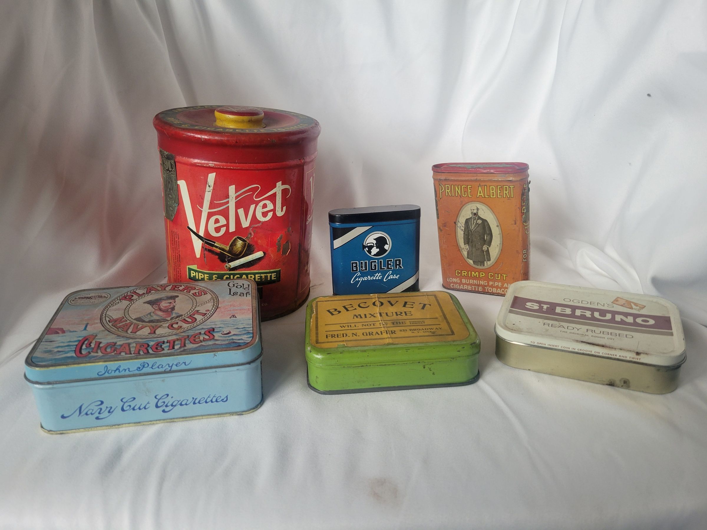 A collection of tin containers which once held tobacco and/or cigarettes. The tins are in fairly good shape with minimal rust, with the exception of the red "Velvet" tin whose bottom is entirely rusted. All the tins are circa 1950 except for the blue "Player's Navy Cut" and Prince Albert containers which are circa 1920.Collection