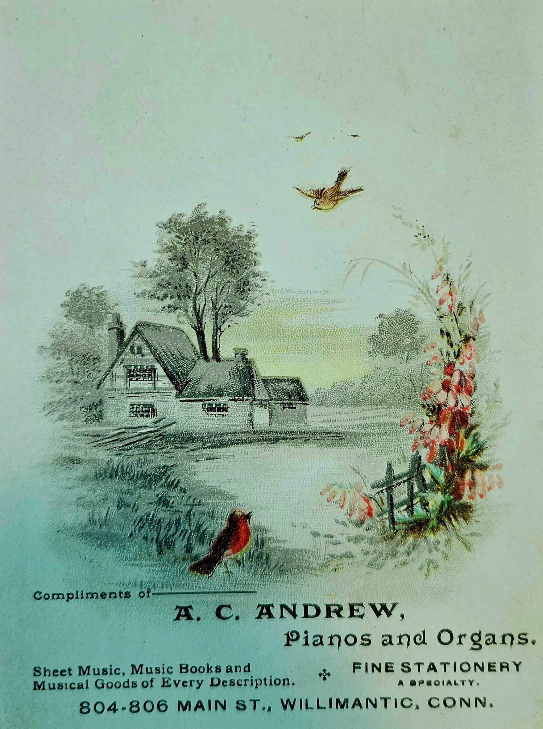 Trade card distributed by A. C. Andrews, Pianos and Organs. On front: "Compliments of A. C. Andrew, Pianos and Organs, Sheet Music, Music Books and Musical Goods of Every Description. Fine Stationery a Specialty. 804-806 Main St., Willimantic, Conn." Back: Blank. 804-806 was a brick building on the south side of Willimantic's Main Street, just west of the Franklin Block. (The Franklin Block today contains a bakery called A Cupcake for Later.) 804-806 was demolished in the 1990s and today is a small parking lot. The 1885 Willimantic Directory lists Andrew's business at 177 Main Street, but that was before Main Street addresses were renumbered and some of Willimantic streets were renamed. The 1896 directory lists Arthur C. Andrew as owning a business at 804 and 806 Main Street that sold "pianos, organs, and musical merchandise; also tuning, repairing, and stationery." Andrew boarded at 1464 Main Street. Charles H. Andrew had an insurance business at 806 Main Street.Collection