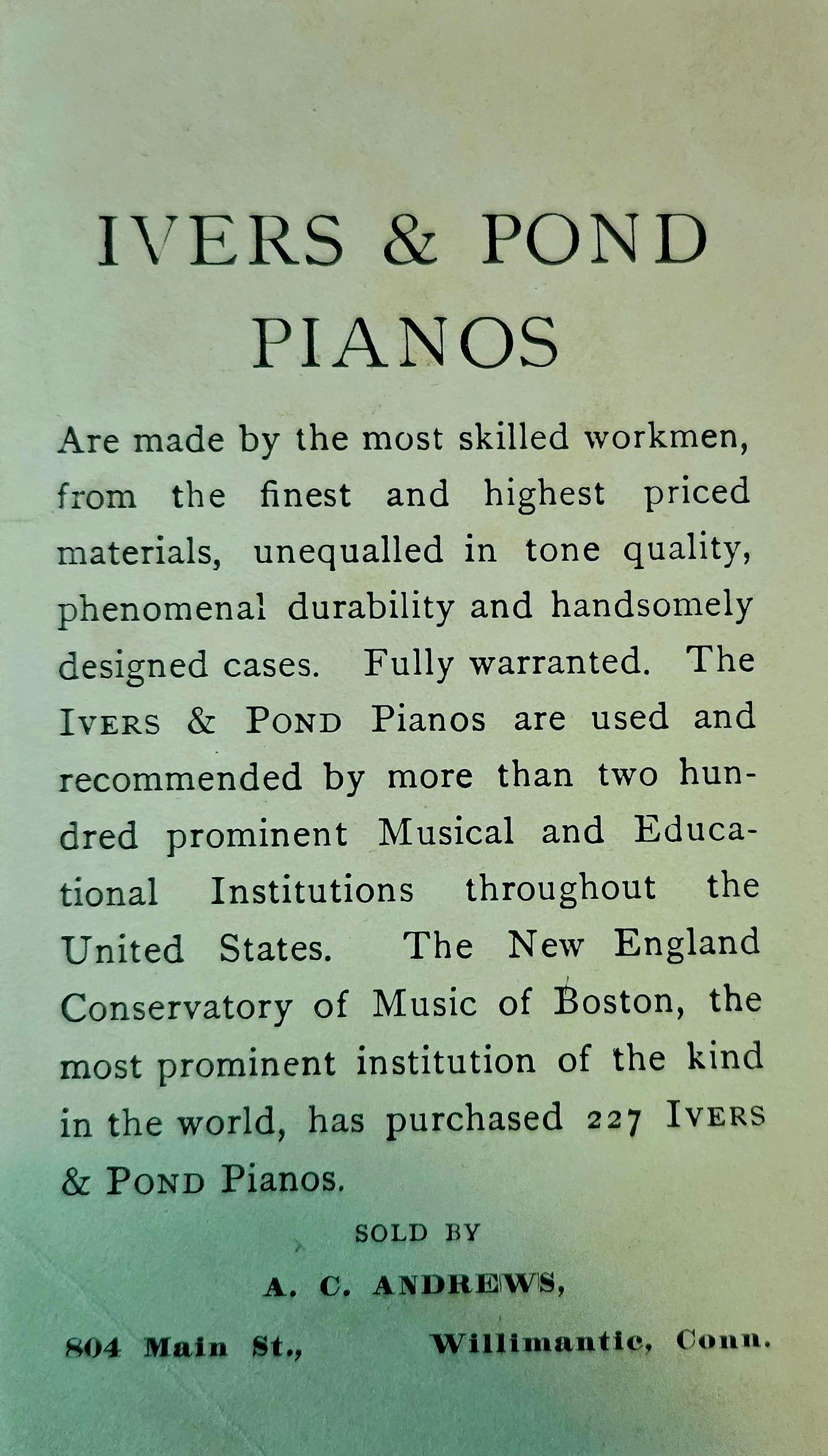 Trade card published by Ivers & Pond Pianos and distributed by A. C. Andrew pf Willimantic, CT. On front: "Compliments of Ivers & Pond Piano Co." On back: "Ivers & Pond Pianos are made by the most skilled workmen, from the finest anf highest priced materials, unequalled in tone quality, phenomenal durability and handsomely designed cases. Fully warranted. The Overs & Pond Pianos are used and recommended by more than two hundred prominent Musical and Educational Institutions throughput the United States. The New England Conservatory of Music of Boston, the most prominent institution of the kind in the world, has purchased 227 Ivers & Pond Pianos. Sold by A. C. Andres, 8-4 Main St., Willimantic, Conn." 804-806 was a brick building on the south side of Willimantic's Main Street, just west of the Franklin Block. (The Franklin Block today contains a bakery called A Cupcake for Later.) 804-806 was demolished in the 1990s and today is a small parking lot. The 1885 Willimantic Directory lists Andrew's business at 177 Main Street, but that was before Main Street addresses were renumbered and some of Willimantic streets were renamed. The 1896 directory lists Arthur C. Andrew as owning a business at 804 and 806 Main Street that sold "pianos, organs, and musical merchandise; also tuning, repairing, and stationery." Andrew boarded at 1464 Main Street. Charles H. Andrew had an insurance business at 806 Main Street.Collection