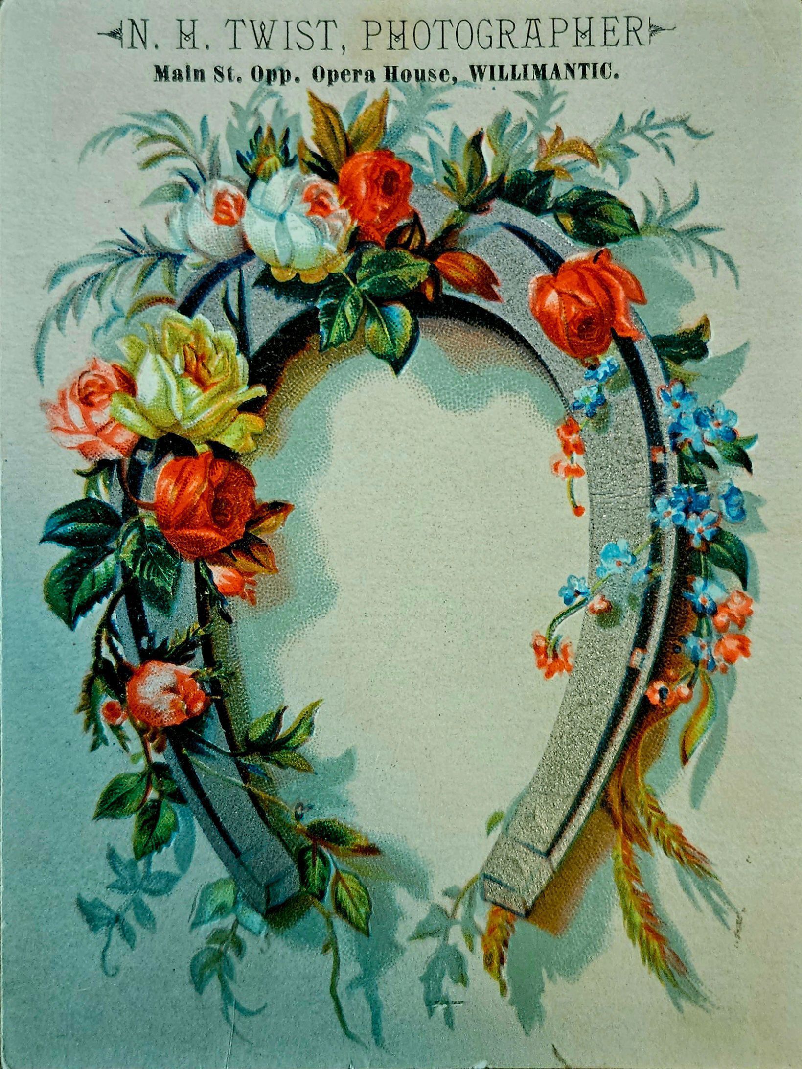 Trade card distributed by N. H. Twist, photographer, Main Street opposite the Opera House, Willimantic, CT, c. 1884. The front of the card reads: N. H. Twist, Photographer, Main St. Opp. Opera House, WILLIMANTIC. Back is blank, but handwritten in pencil is: Edith, Birthday present, Aug. 23 1884, Charley. There is no mention of Twist in the 1885 Willimantic Street Directory. The only photographers listed in the directory that year were Charles Ross and Charles H. Townshend, neither of whom had studios opposite the Loomer Opera House. Townshend was in the Basset's Block building at what was then the corner of Main and Railroad Streets, across from the Murray Block. The Basset Block was demolished in the 1970s, and the Advertiser building now occupies the space.Collection