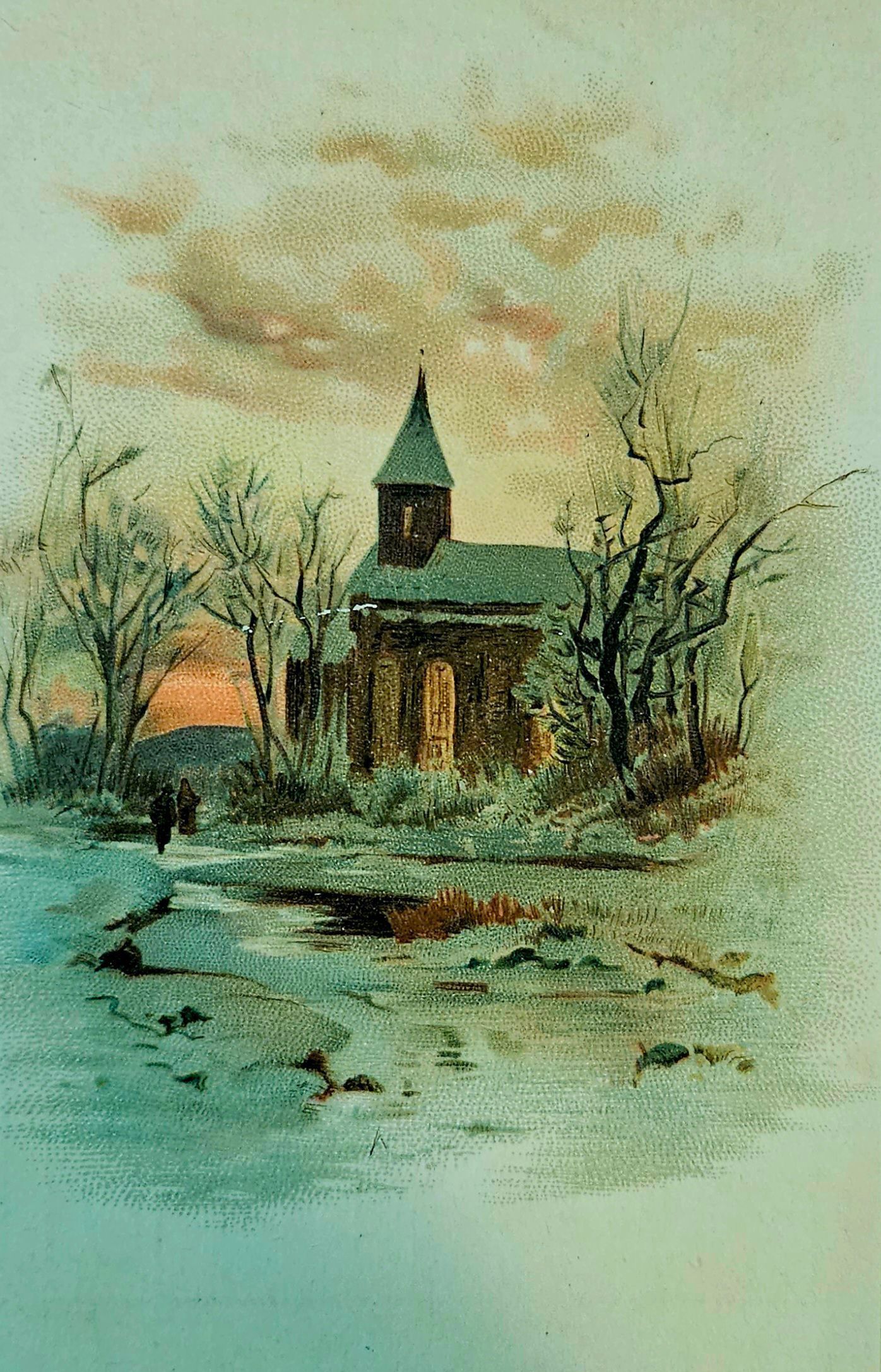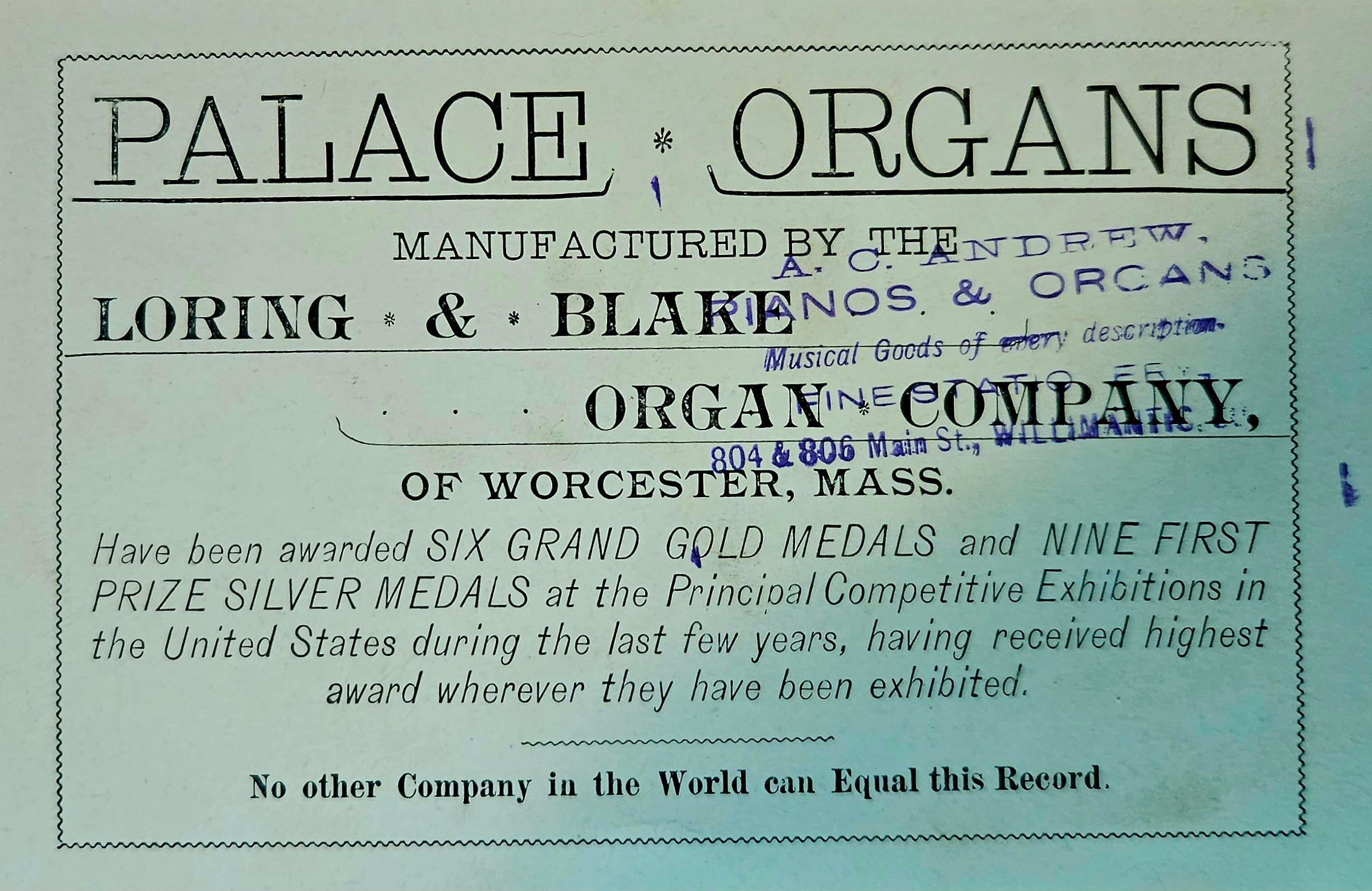 Two copies of a trade card for Palace Organs. On front: Only an image. On back: "Palace organs. Manufactured by the Loring & Blake Organ Company, of Worcester, Mass. Have been awarded six grand gold medals and nine first prize silver medals at the Principle Competitive Exhibitions in the United States during the last few years, having received highest award wherever they have been exhibited. No other company in the world can equal this record." Back is stamped: "A. C. Andrew, Pianos & Organs. Musical goods of every description. Fine stationery. 804 & 806 Main St., Willimantic, Conn." According to the 1885 Willimantic Street Directory, A. C. Andrew sold pianos, organs, musical merchandise, and tuning and repair services at 177 Main Street in Willimantic. Andrew resided on West Main Street.Collection