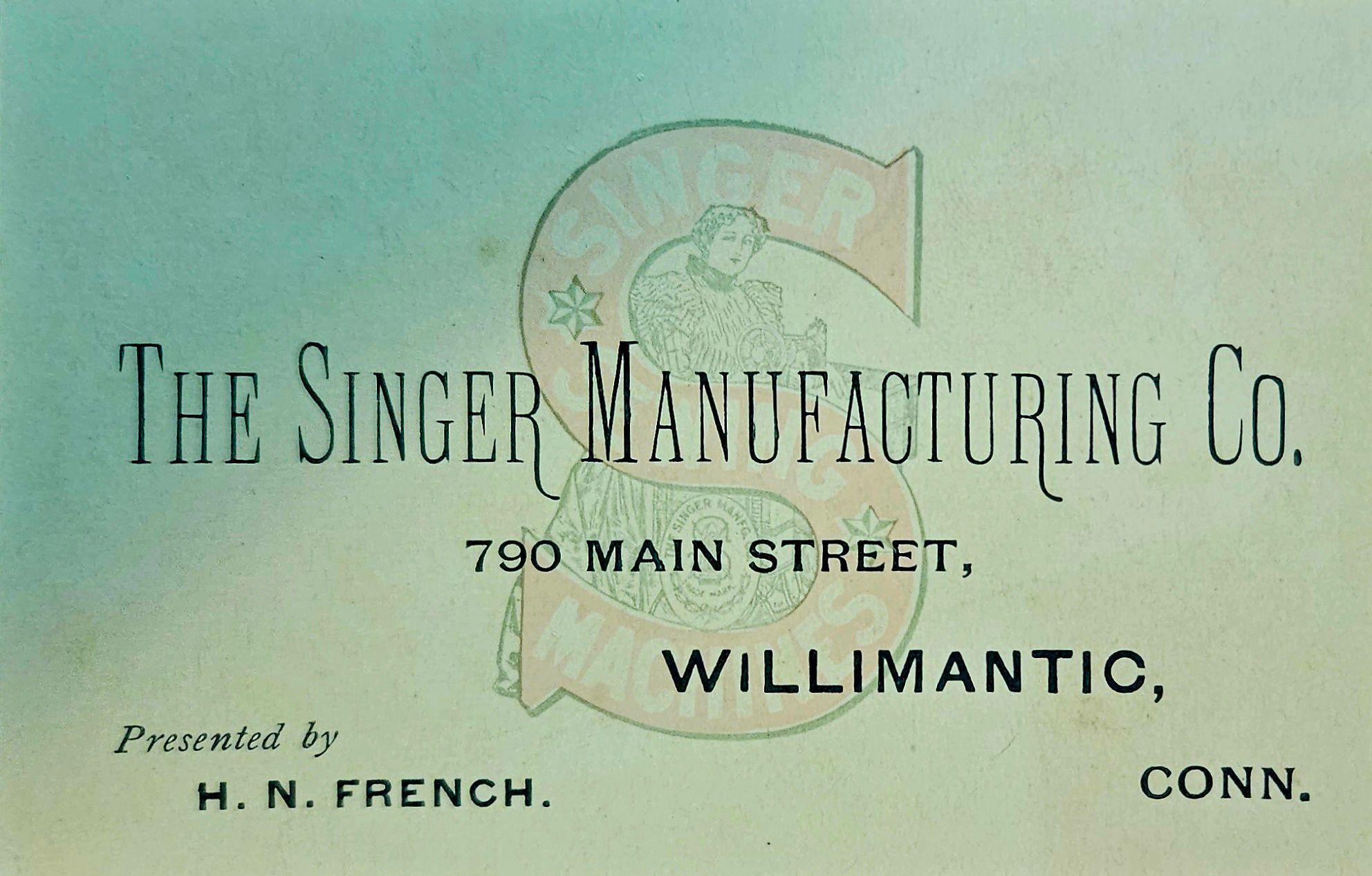 Trade card published by the Singer Manufacturing Company, manufacturer of sewing machines, c. 1880s. The card contains the name and address of Singer's local Willimantic, CT, agent, H. N. French, 790 Main Street, Willimantic, CT. It is printed on thin white cardboard and is 10 mm wide and 6.5 mm high.Context