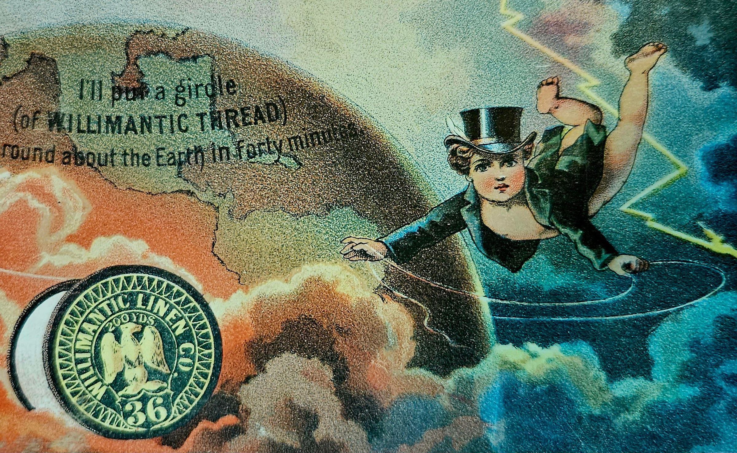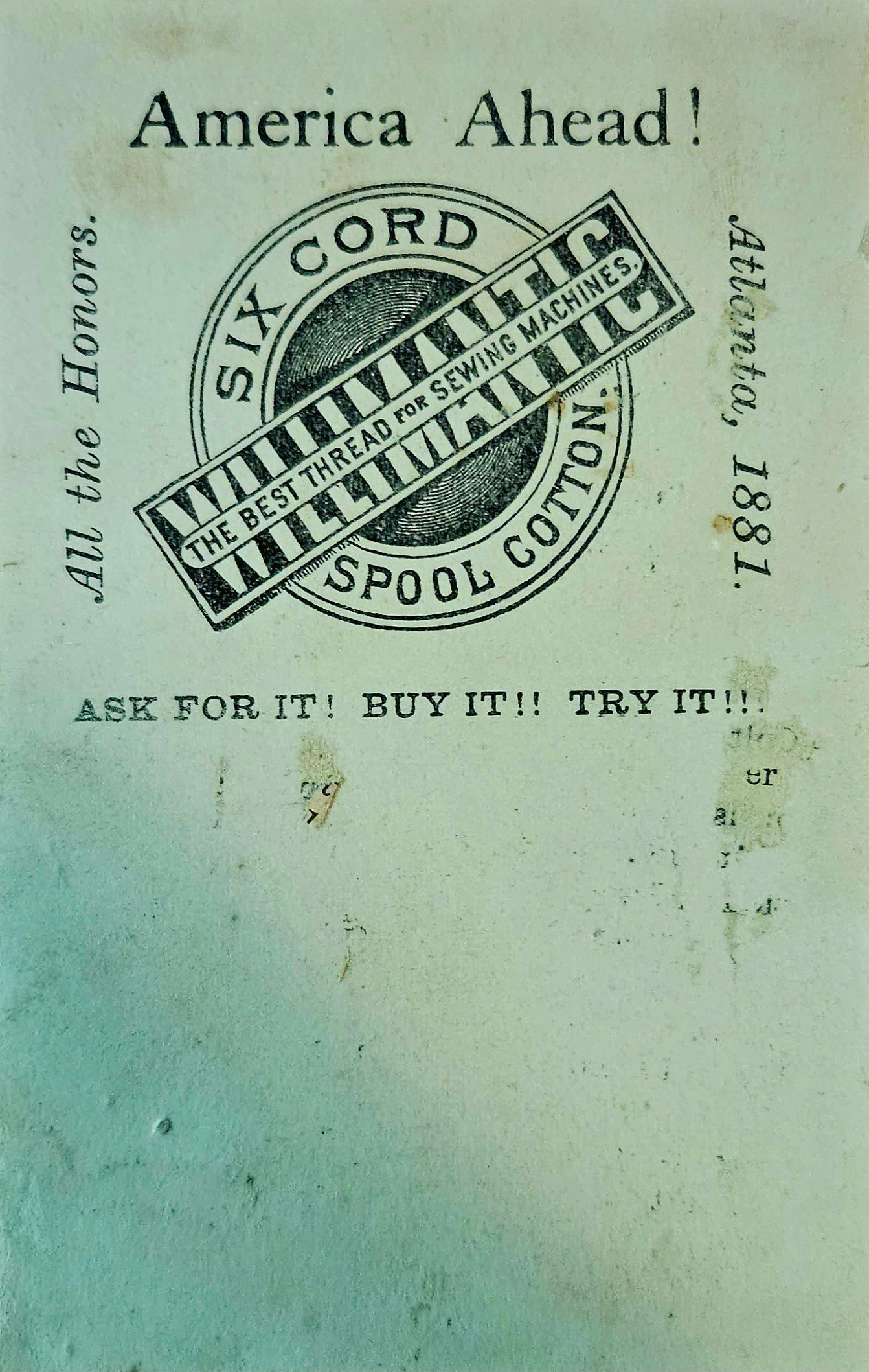 Trade card published by the Willimantic Linen Company of Willimantic, CT, advertising its six-cord spool cotton thread. The advertisement either notes that the product won "all the honors" at the 1881 International Cotton Exposition (I.C.E.) in Atlanta, Georgia (held Oct. 4 - Dec. 31), or was meant to be distributed at the I.C.E. The advertisement also notes that the WLC produced enough thread to "put a girdle" of its thread "round the Earth in forty minutes." The trade card is printed on thin white cardboard and measures 11.4 mm wide by 7.2 mm high.Context