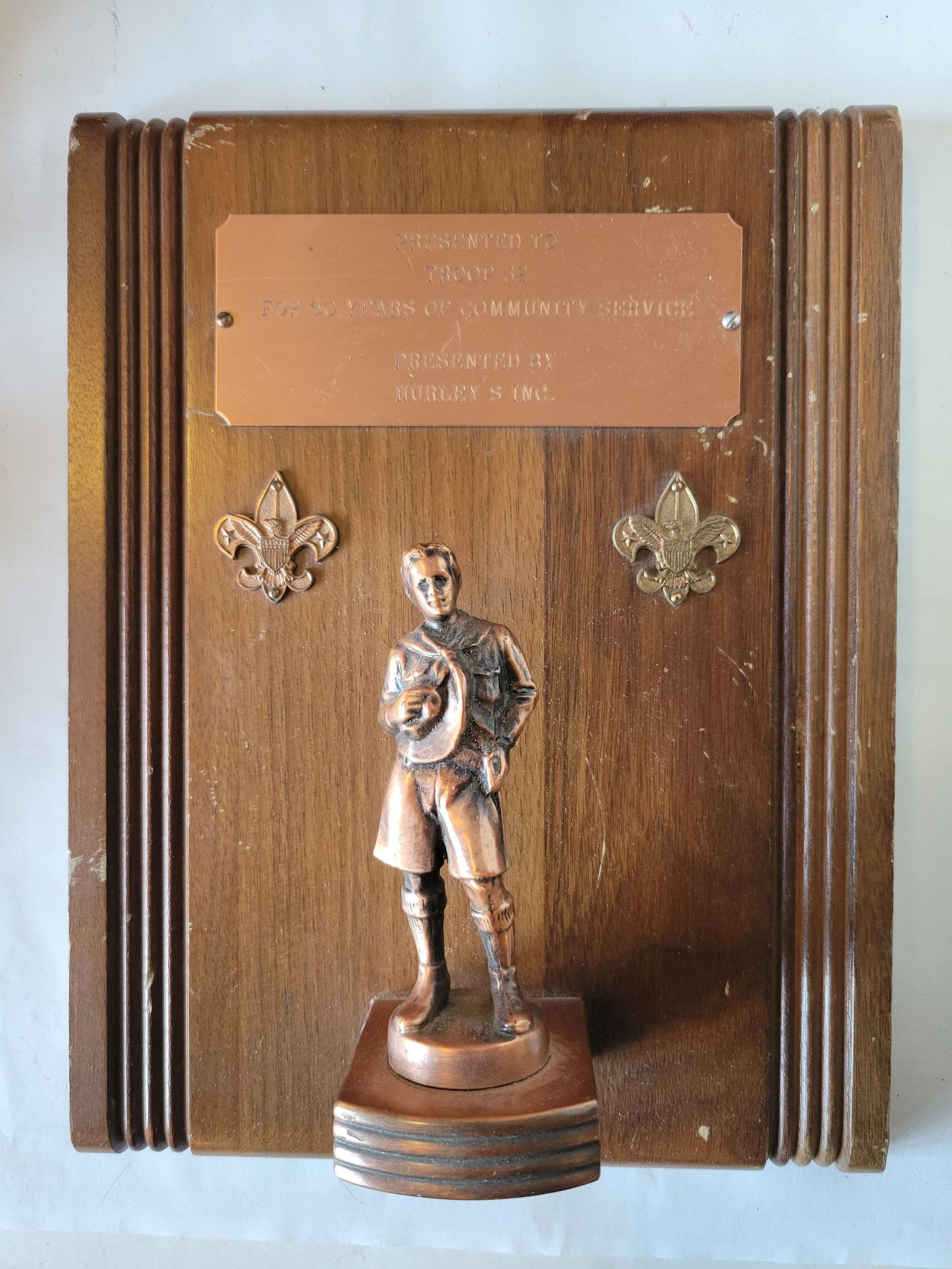 An award presented to BSA Troop 32 "For 50 Years of Community Service". It was presented to them by Hurley's Inc. The rectangular plaque is wooden with a flat bronze name plate, two bronze fleur de lis, and a bronze outcropping where stands the statuette of a boy scout with his hat over his chest. The wood is dinged in several places but the plaque is otherwise in good condition.Collection