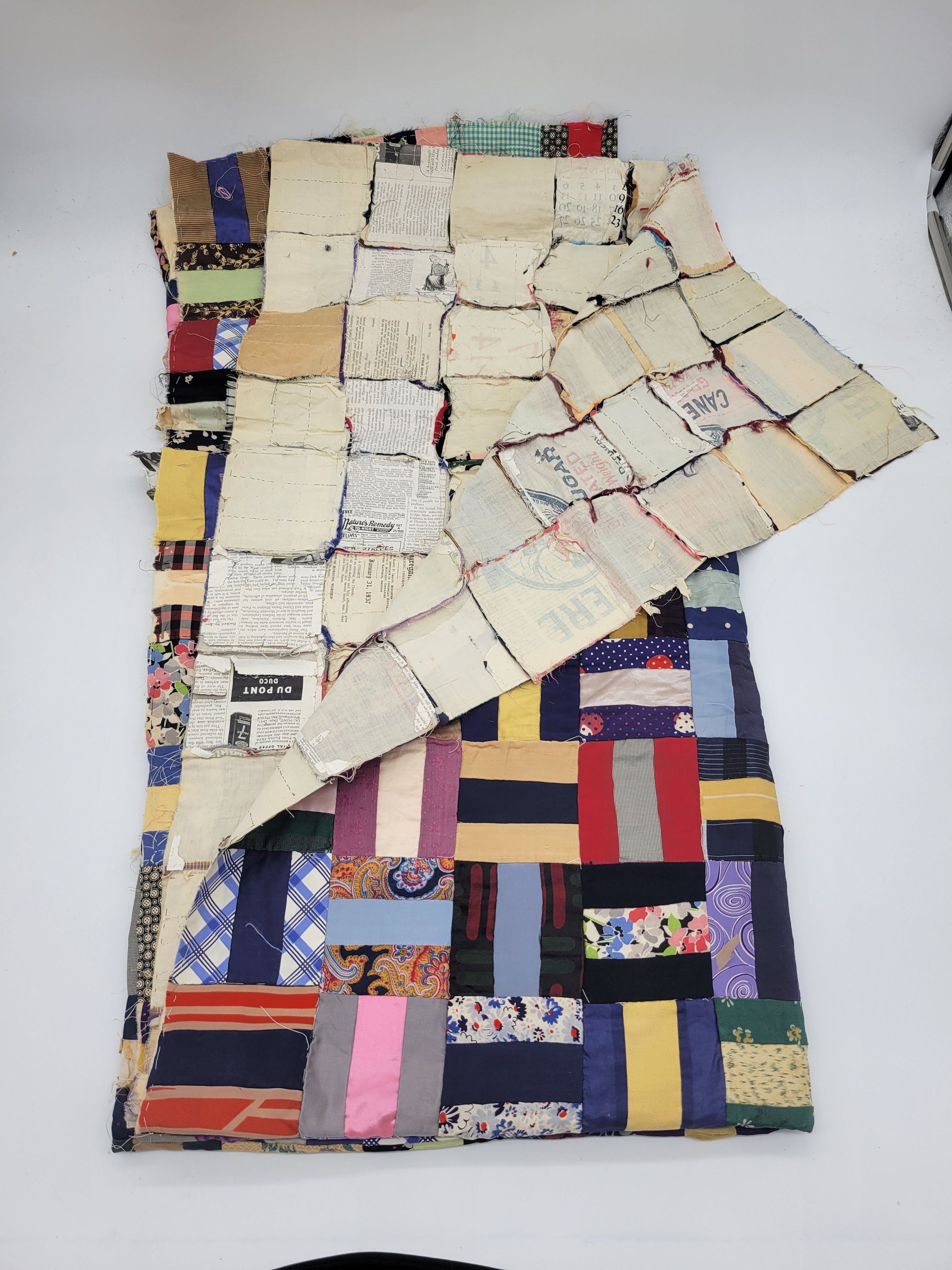 An unfinished quilt made by Hatrie E Fuller Johnson of Columbia, CT. The quilt features a paper piecing technique where paper is tacked to the back of the fabric to stabilize it during the sewing process and it afterward removed. In this case blank as well as printed paper was used, some from local newspapers of the time.Textile Type