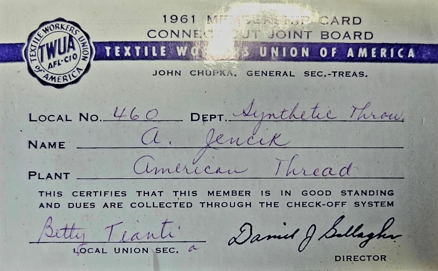 Union card of Anna Jecik, an employee of the American Thread Company in Willimantic, CT. Jencik worked in the Synthetic Throw Department. The card is dated 1961. Jencik was a member of the Textile Workers Union of America (TWUA) Local #460, which was affiliated with the AFL-CIO. The card is signed by Betty Tianti, the Local Secretary. The handwriting on the card appears to be Tianti's as well.Context
