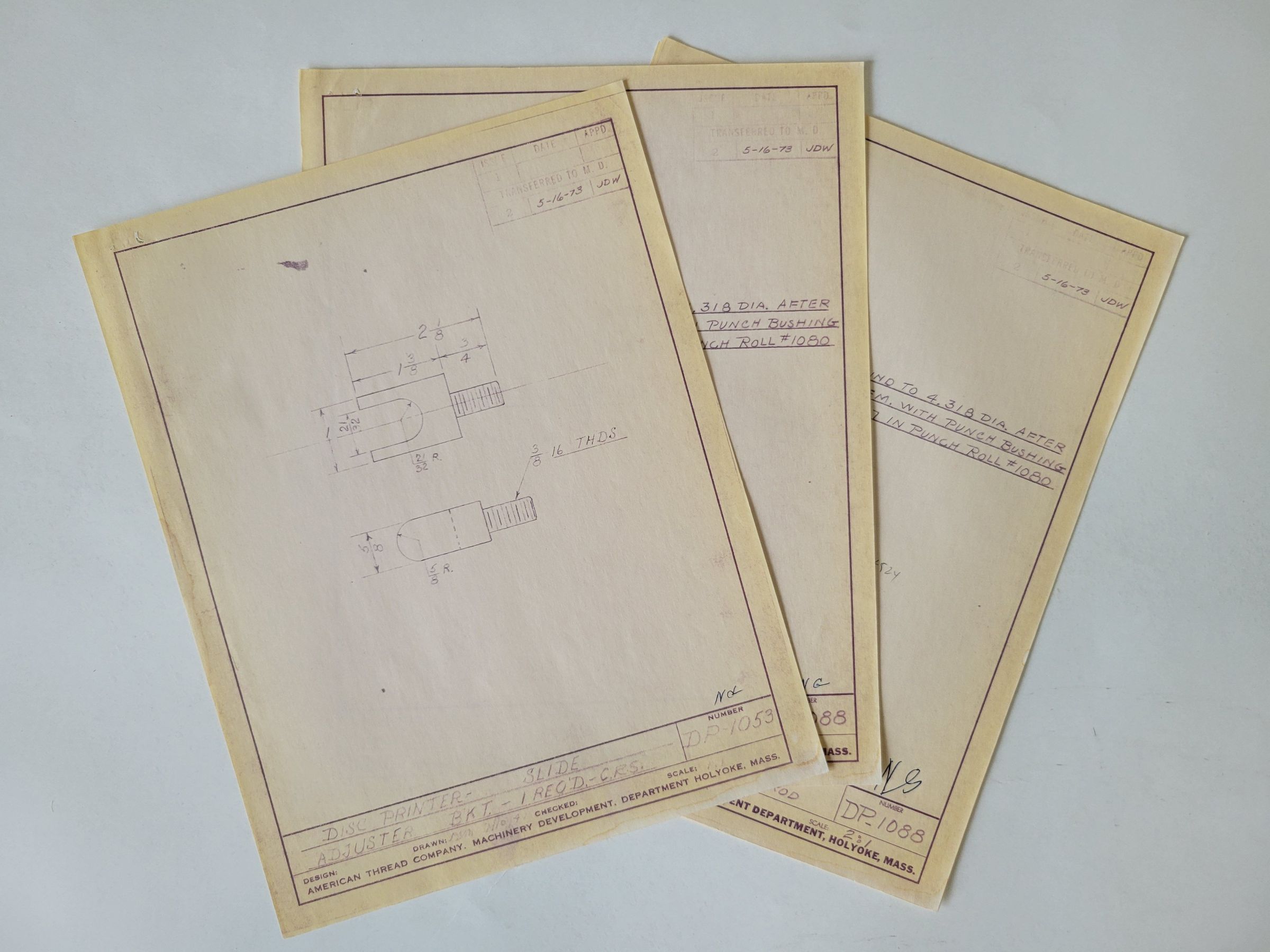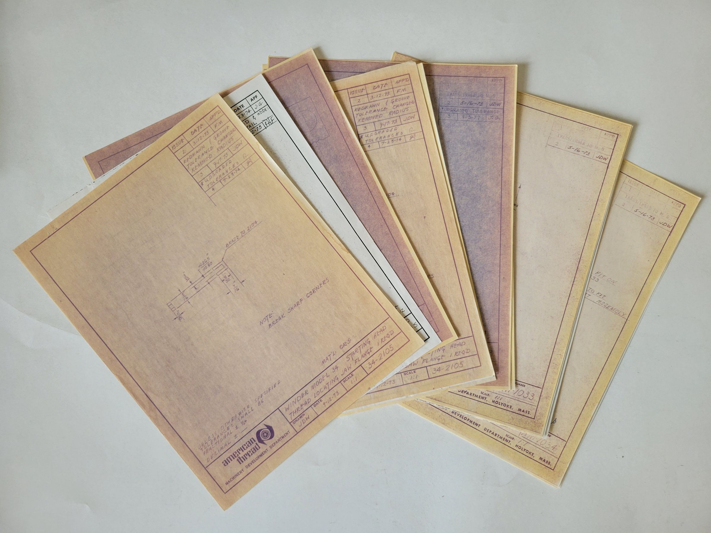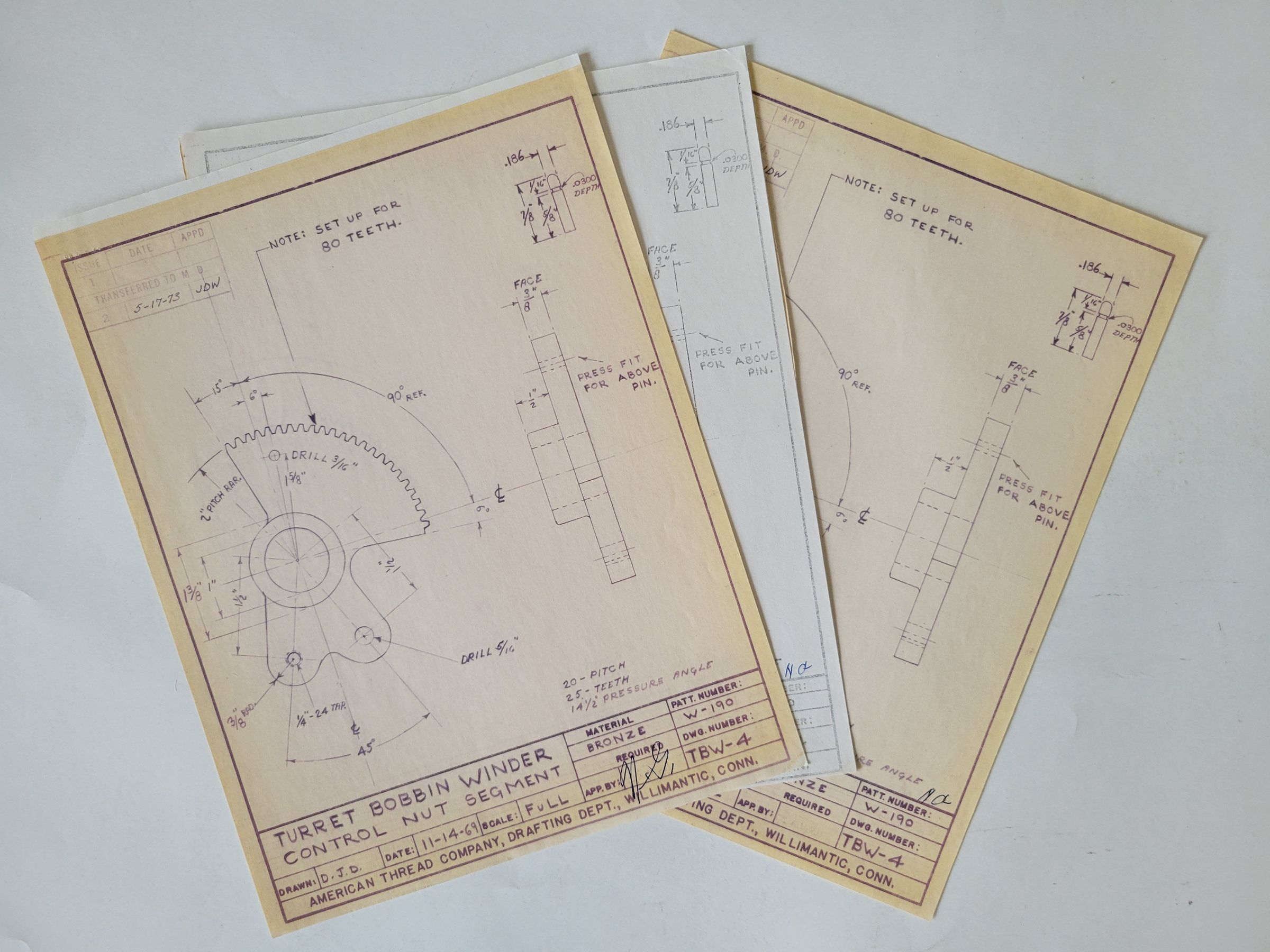 Blueprints drawn for the American Thread Company for various machine parts. Prints are dated 1941 or 1973. The 1941 drawings are marked as being moved in 1973.Collection