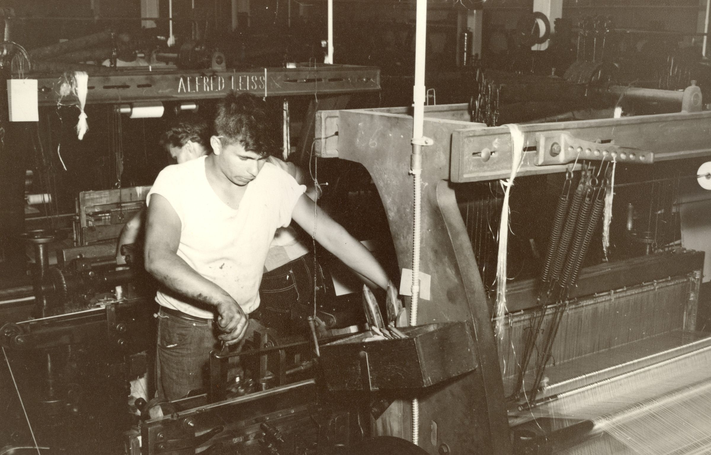 Digital copy of a black-and-white print of a photograph of an unidentified worker at the Leiss Velvet Company's factory on Birch Street in Willimantic, CT, c. 1952. The Museum does not own the original print, which was loaned to us for the purposes of making a digital copy.Photograph Details