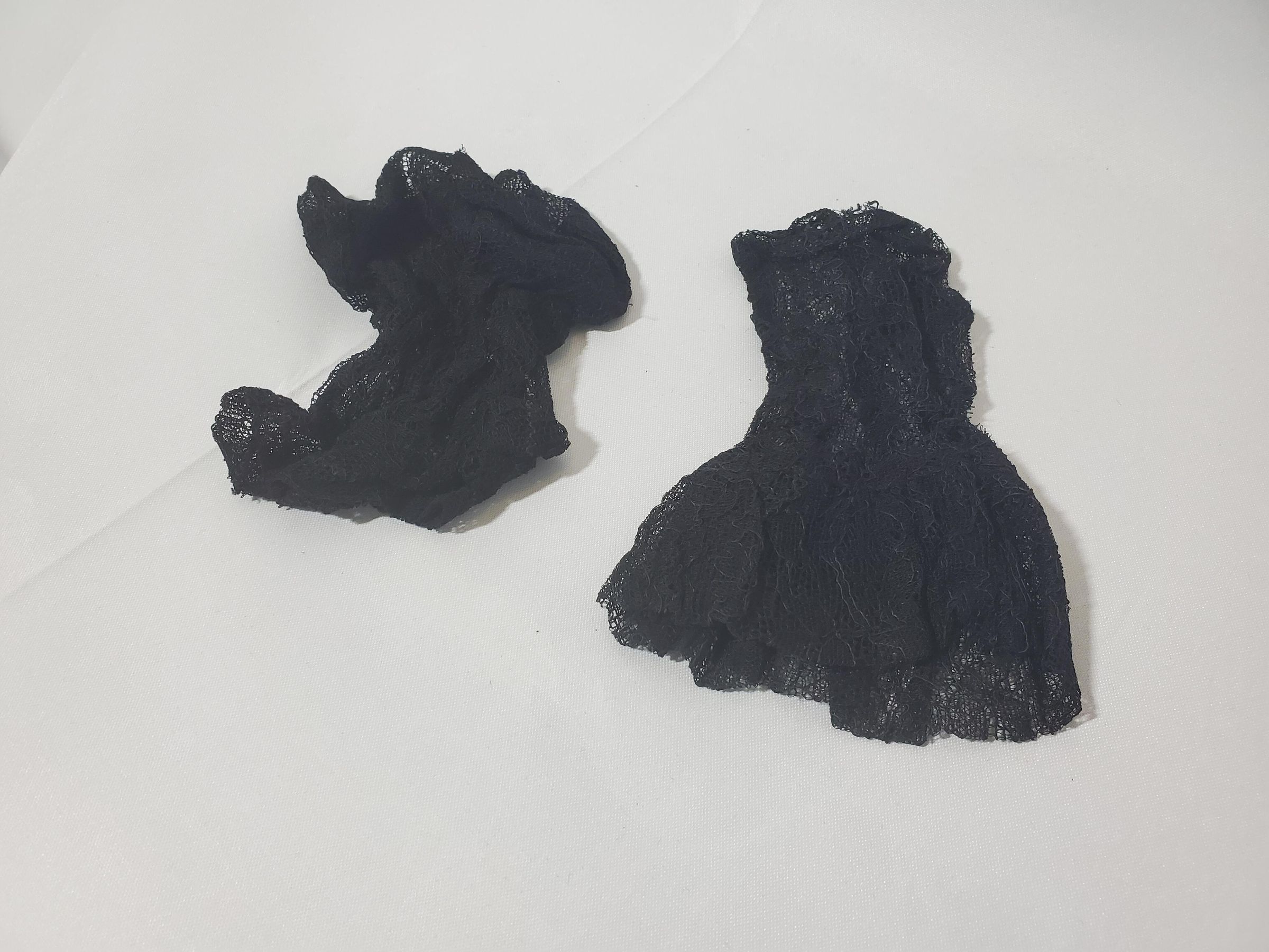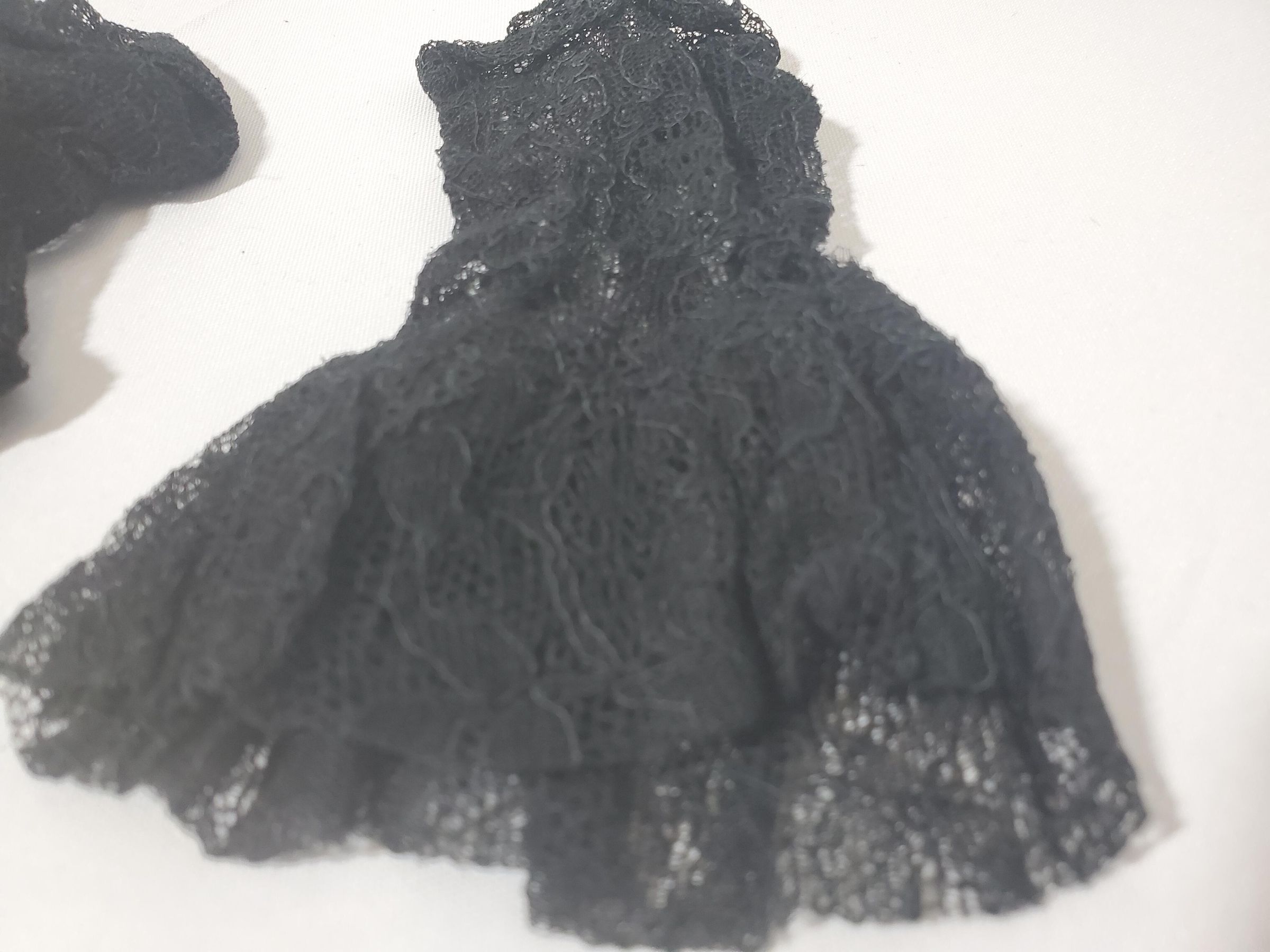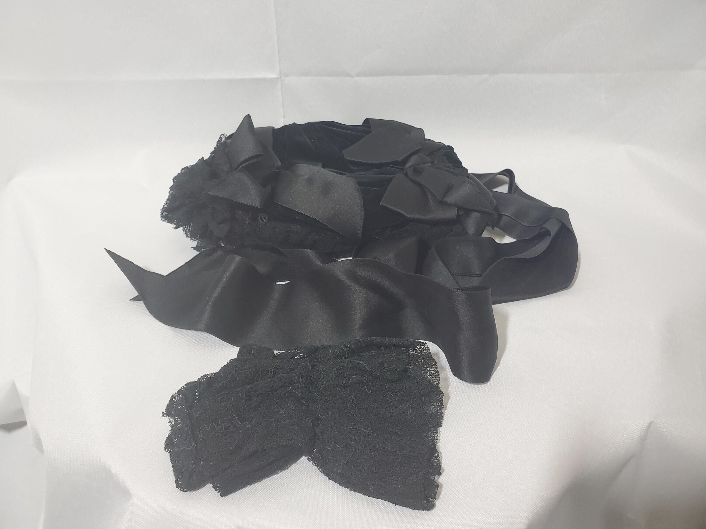 Velvet Victorian styled small hat with silk ribbons and netted lining. Waxed cotton is also stitched along the inside. Gloves are small and made out of lace.Use