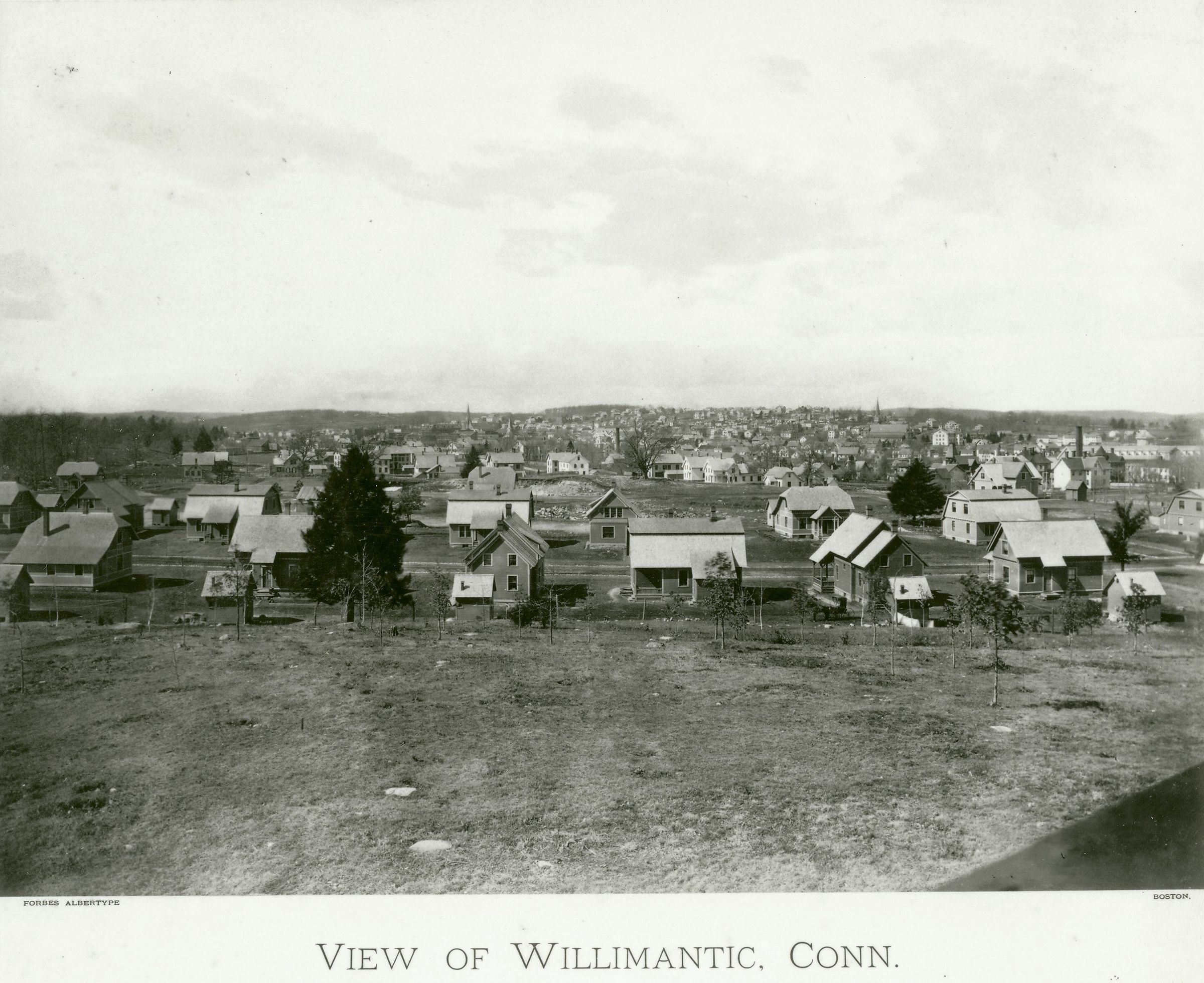 Copy of black and white photographic print of Willimantic, CT, viewed from the south. The Oaks worker housing (single-family cottages) is in the foreground. The cottages' privies are shown, indicating that the photo was taken before the the installation of sewer lines in the 1890s. The cottages were constructed by the Willimantic Linen Company in 1880. The photo is captioned, and so appears to have been copied from a publication. The captions read "View of Willimantic, Conn.," "Forbes Albertype," and "Boston." The Forbes Albertype Co. was located in Boston, MA, and flourished between 1856 and 1901, specializing in both albertype photographic prints and lithographs, in the form of art prints, maps, guidebooks, and trade cards. This photographic print is probably from c. 1881, a peak year for the Forbes Company.Photograph Details