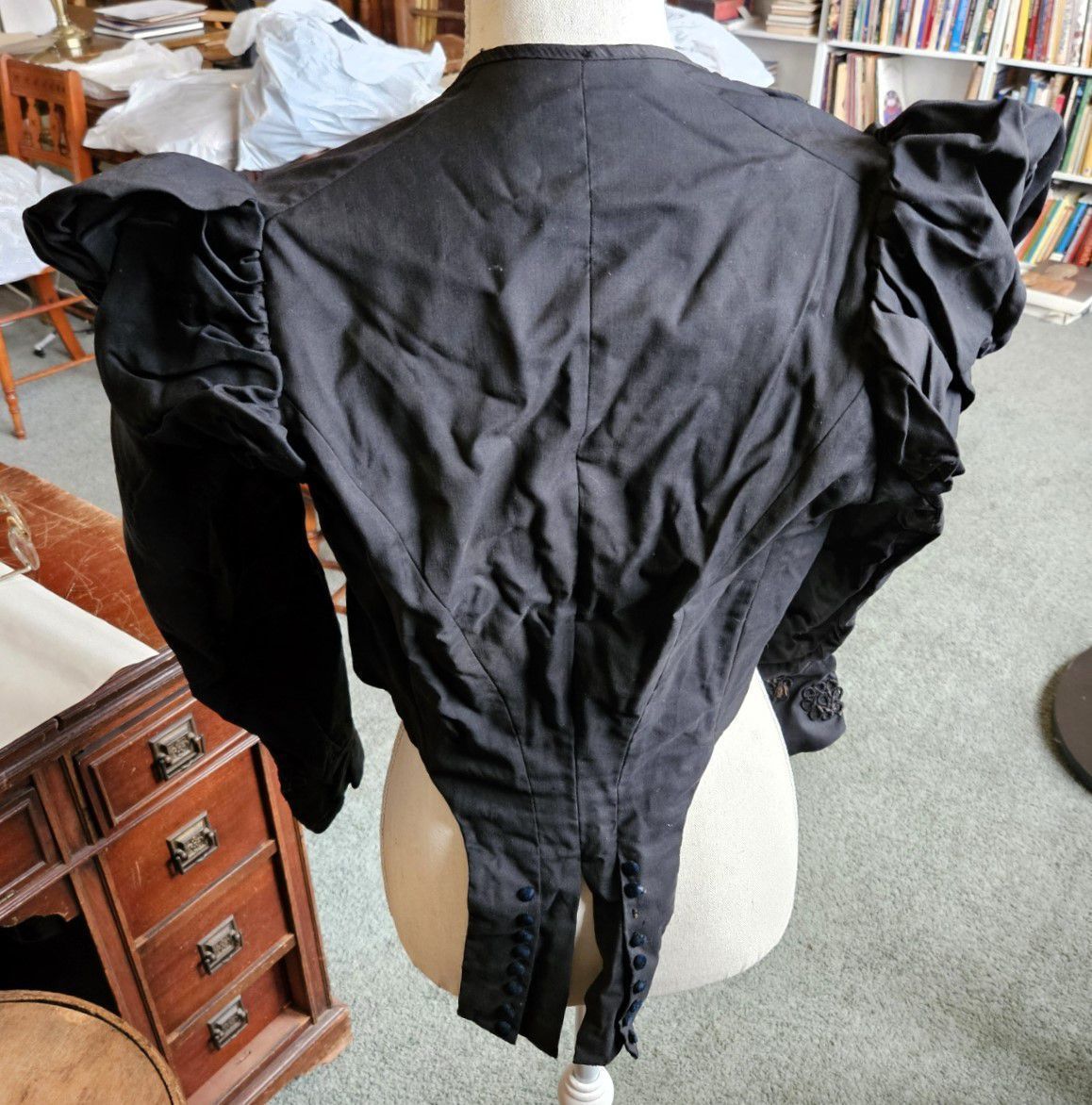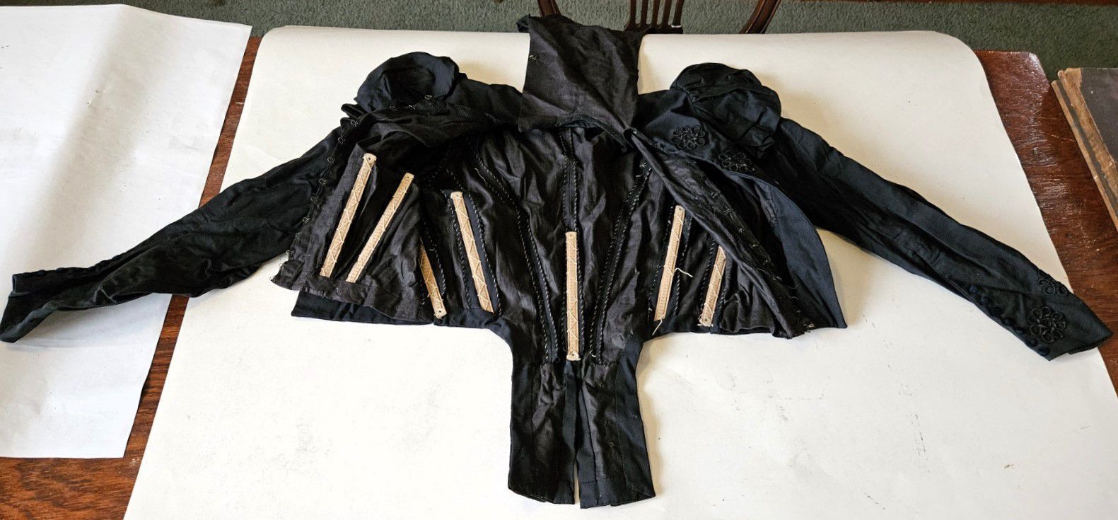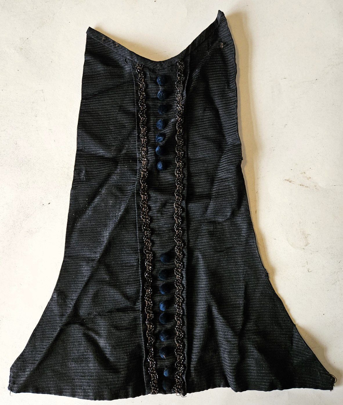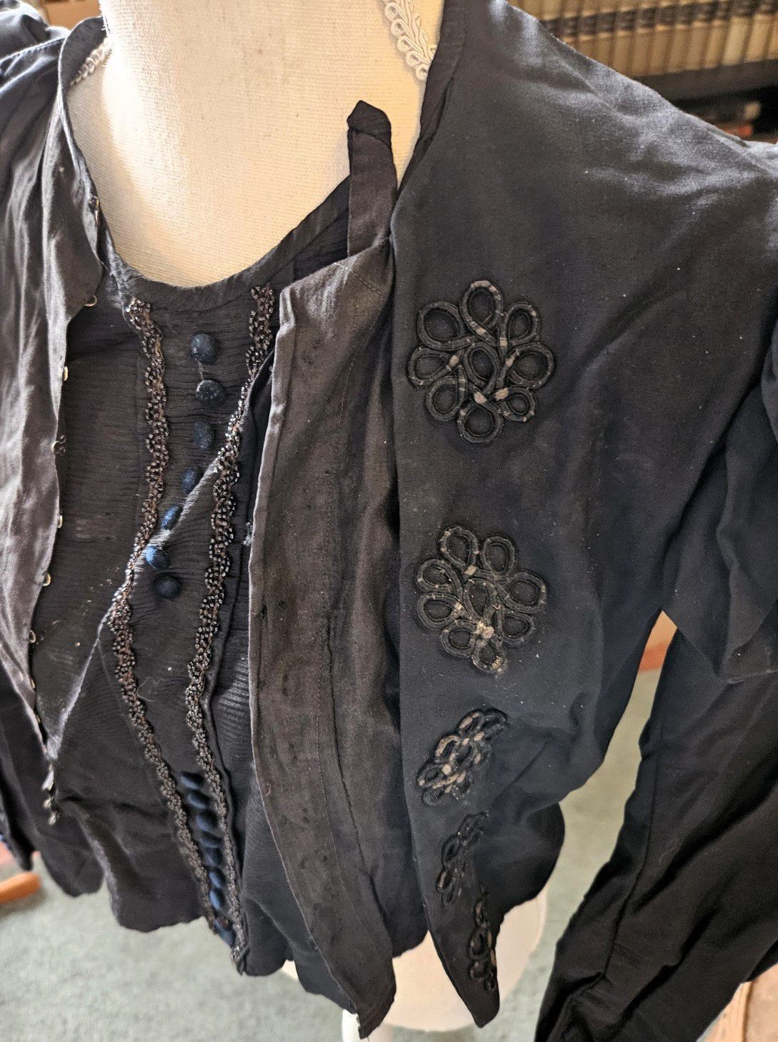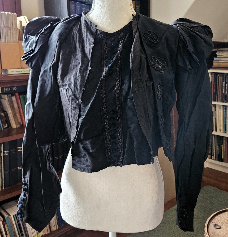 Vintage black silk woman's blouse/bodice with a detachable bib/stomacher held by pins. (Museum staff removed the pins when the garment was being processed.) Puffy shoulders. Fasteners are hooks instead of buttons. (Hooks reached a height of popularity in the late 1800s and early 1900s.) The bib is resembles a triangular black crepe stomacher, except that the triangle is inverted (the point is at the bottom) and it rises all the way up to the collar. Decorative, non-functional black (jet?) buttons on the bib/stomacher. Black buttons on cuffs. Long sleeves. Decorative lacework, beadwork, and buttons. Corset stays were sewn into the inside of the waist. There are two tails in the back, decorated with non-functional buttons. Fair condition. Possibly handmade -- there is no label. Found with other garments in cellar of 151-F Pond Road in Franklin, CT. Some garments are marked RR. Donor believes the garments had belonged to Marjorie Burnham Ayer Robbins, born 1897, in whose home the garments were found, and/or the Robbins family into which she she married. RR could have been Marjorie's second husband, Roger Robbins. The black clothing fits with the fact that Marjorie was a widow for many years before she remarried -- these may be mourning clothes.