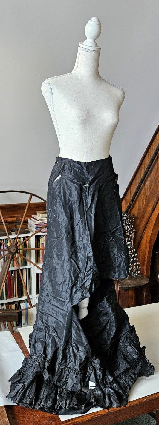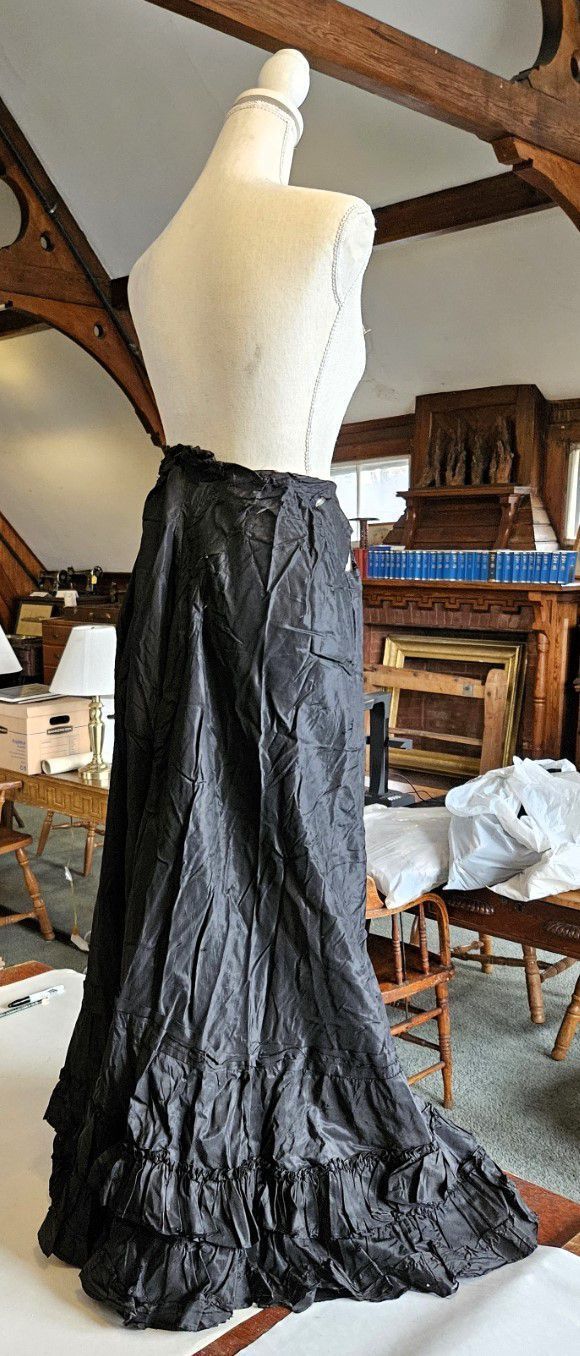 Vintage black silk skirt. Probably handmade. Very poor condition. Black lace trim along hem. Closes with hooks, not buttons. Found with other garments in cellar of 151-F Pond Road in Franklin, CT. Some garments are marked RR. Donor believes the garments had belonged to Marjorie Burnham Ayer Robbins, born 1897, in whose home the garments were found, and/or the Robbins family into which she she married. RR could have been Marjorie's second husband, Roger Robbins. The black clothing fits with the fact that Marjorie was a widow for many years before she remarried.