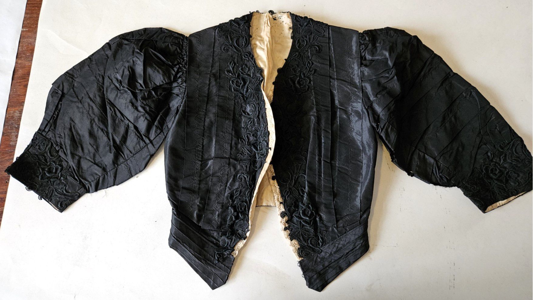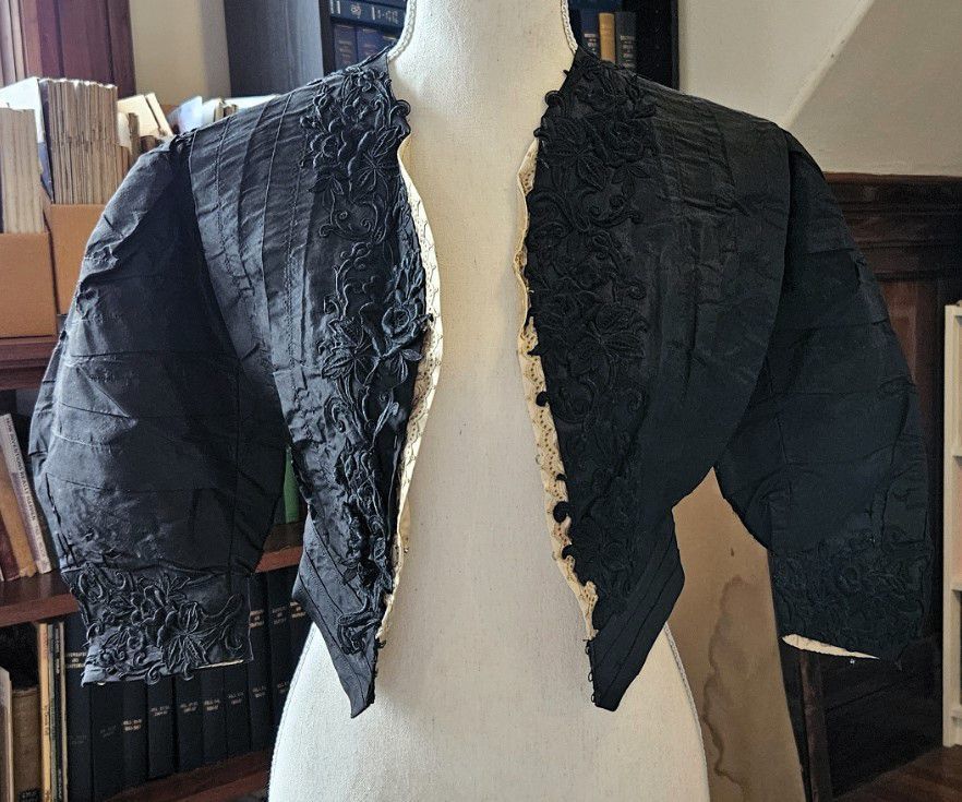Vintage black woman's jacket. Lined with cream-colored cloth. Fastens in front with metal hooks, rather than with buttons. Decorated with black lace on sleeves, bodice, collar, and waist. Mutton-chop sleeves. Very good condition. Possibly handmade -- there is no label. Found with other garments in cellar of 151-F Pond Road in Franklin, CT. Some garments are marked RR. Donor believes the garments had belonged to Marjorie Burnham Ayer Robbins, born 1897, in whose home the garments were found, and/or the Robbins family into which she she married. RR could have been Marjorie's second husband, Roger Robbins. The black clothing fits with the fact that Marjorie was a widow for many years before she remarried.