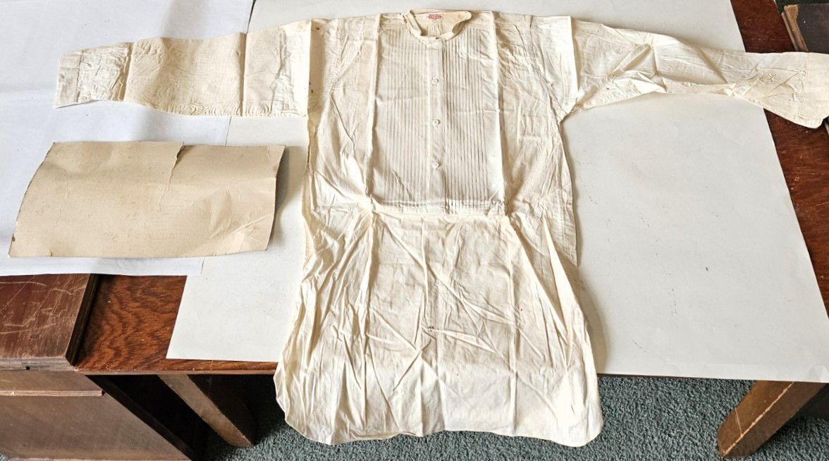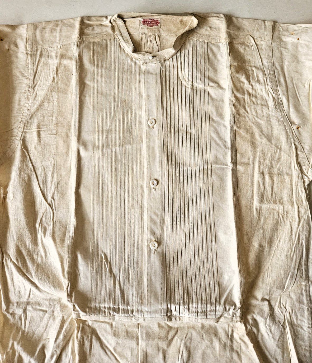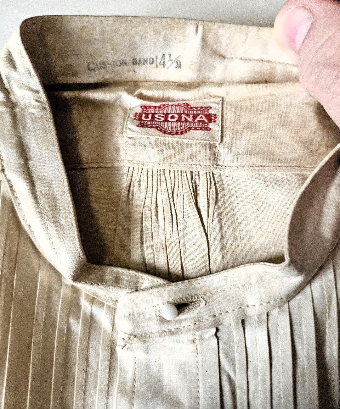 Vintage men's linen shirt. Fair condition. Was pinned around cardboard, probably by a professional launderer. Rust spots where pins were located. Cardboard removed. Short collar. White buttons down front and on cuffs. Decorative ribbing on breast. Long tails. Manufactured by the Usona Shirt Co. Size 14 1/4 in. The Usona Shirt Co. was located in New York City and existed from at least 1909 until at least 1939. The word "Usona" was invented around the turn of the century as an alternative to the word "America" as a short form of the United States of America, and is an acronym for United States of North America. The word was incorporated into the artificial language Esperanto. The shirt was found with other garments in cellar of 151-F Pond Road in Franklin, CT. Some garments are marked RR. Donor believes the garments had belonged to Marjorie Burnham Ayer Robbins, born 1897, in whose home the garments were found, and/or the Robbins family into which she she married. RR could have been Marjorie's second husband, Roger Robbins.
