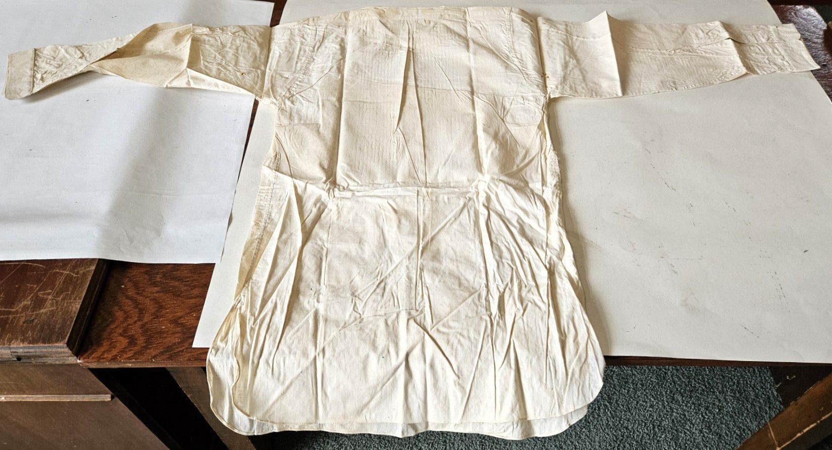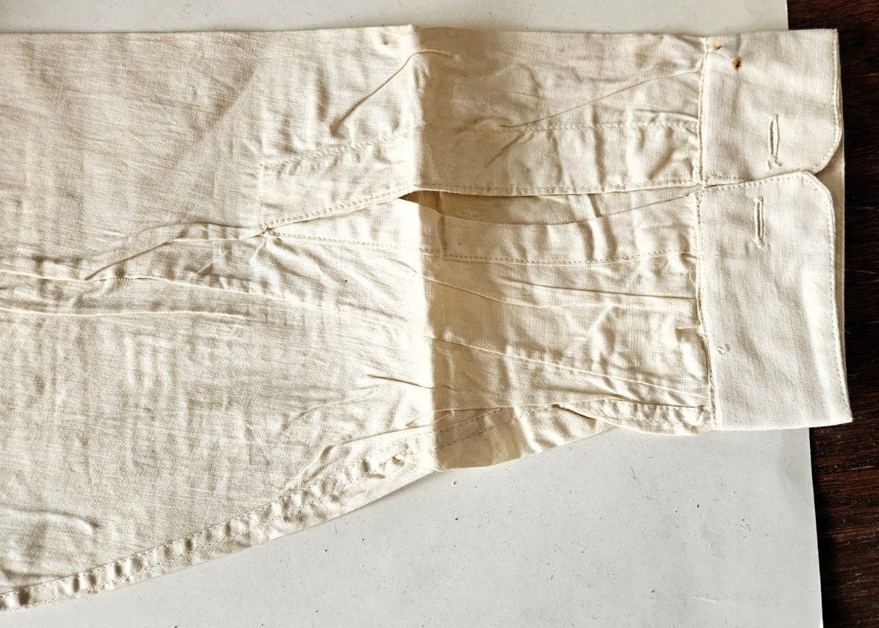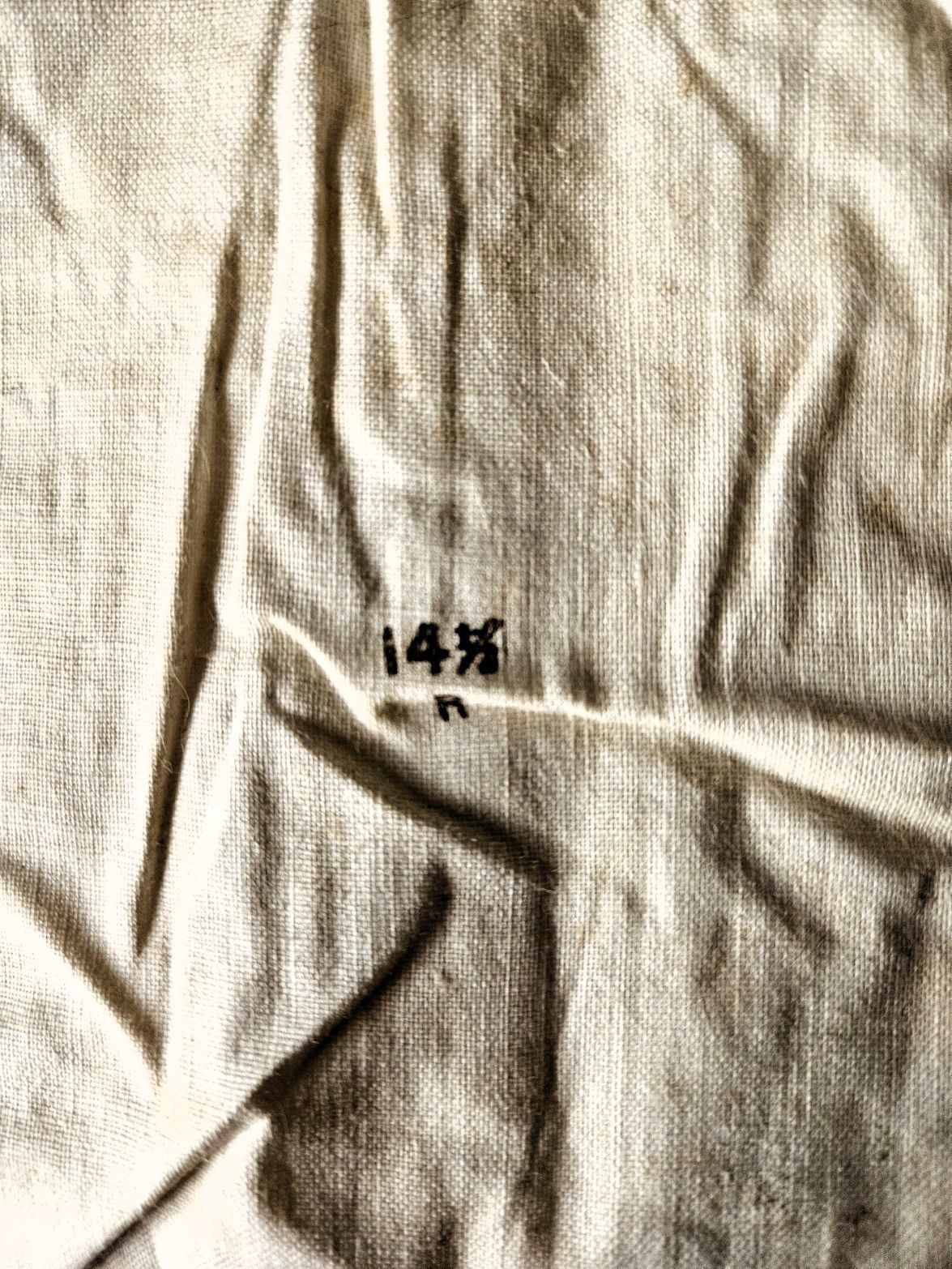 Vintage men's linen shirt. Fair condition. Was pinned around cardboard, probably by a professional launderer. Rust spots where pins were located. Cardboard removed. Short collar. White buttons down front and on cuffs. Decorative ribbing on breast. Long tails. Manufactured by the Usona Shirt Co. Size 14 1/4 in. The Usona Shirt Co. was located in New York City and existed from at least 1909 until at least 1939. The word "Usona" was invented around the turn of the century as an alternative to the word "America" as a short form of the United States of America, and is an acronym for United States of North America. The word was incorporated into the artificial language Esperanto. The shirt was found with other garments in cellar of 151-F Pond Road in Franklin, CT. Some garments are marked RR. Donor believes the garments had belonged to Marjorie Burnham Ayer Robbins, born 1897, in whose home the garments were found, and/or the Robbins family into which she she married. RR could have been Marjorie's second husband, Roger Robbins.