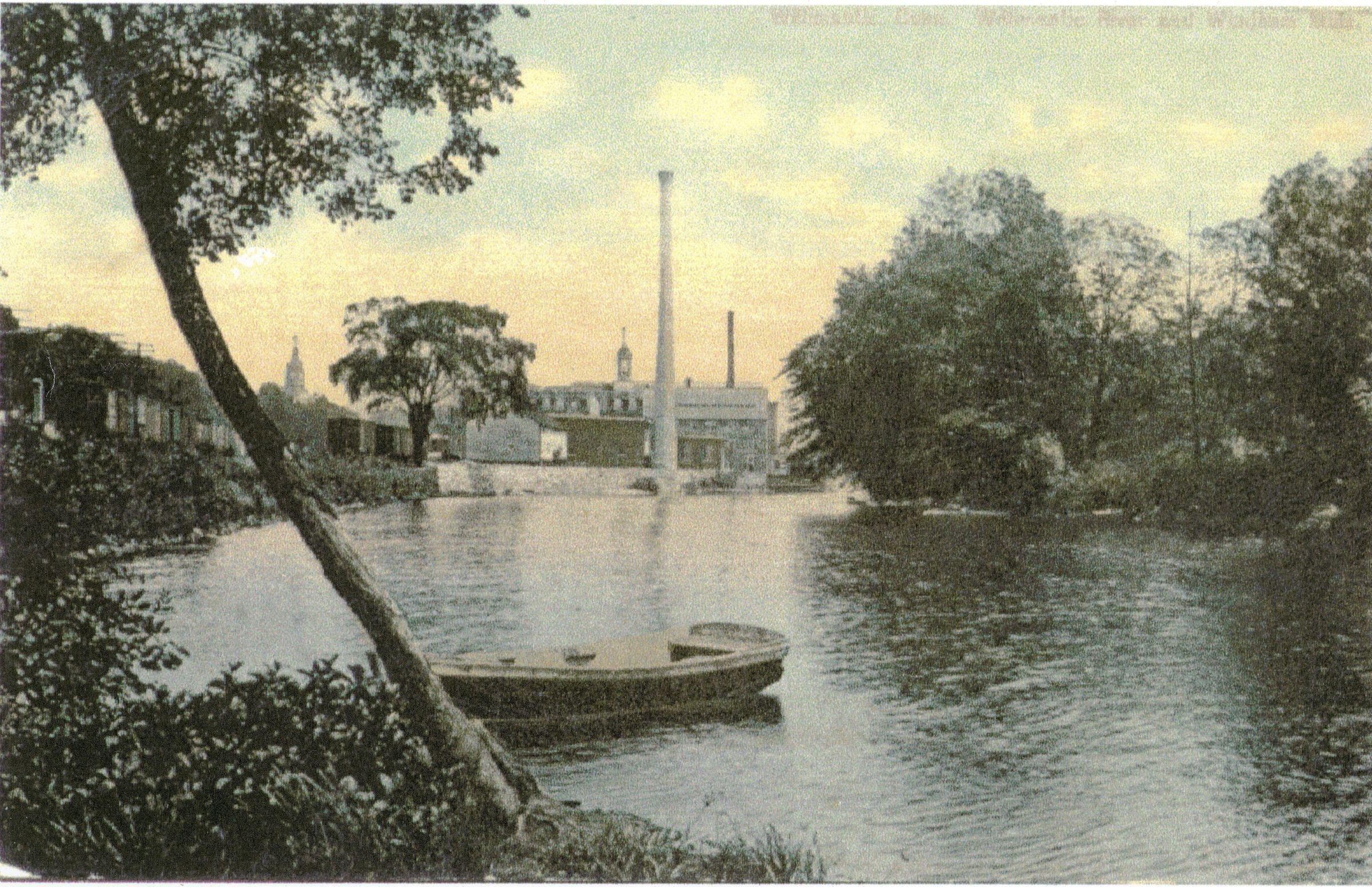 Enlargement (color) of an image from a picture postcard. The mill pond above the Wauregan cotton mill in the village of Wauregan in the town of Plainfield, CT. Unknown photographer. C. 1910.Photograph Details