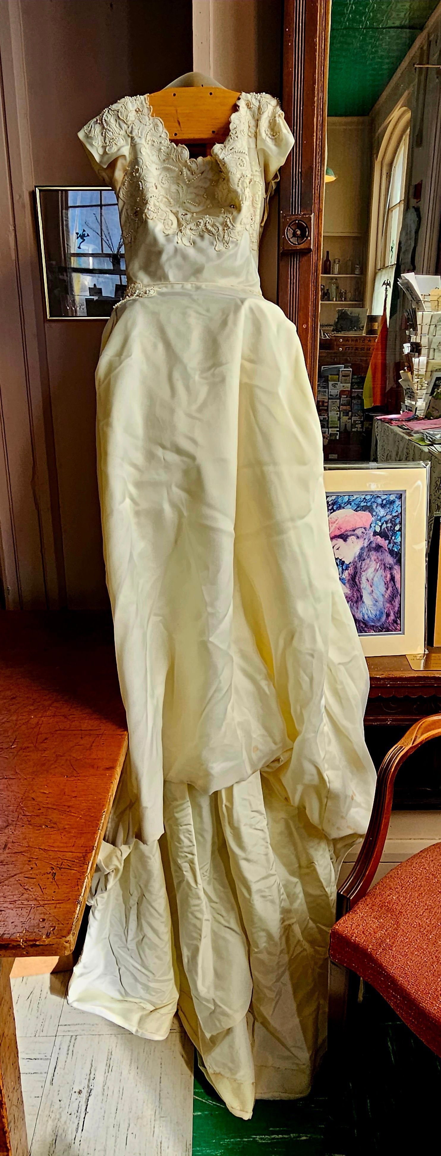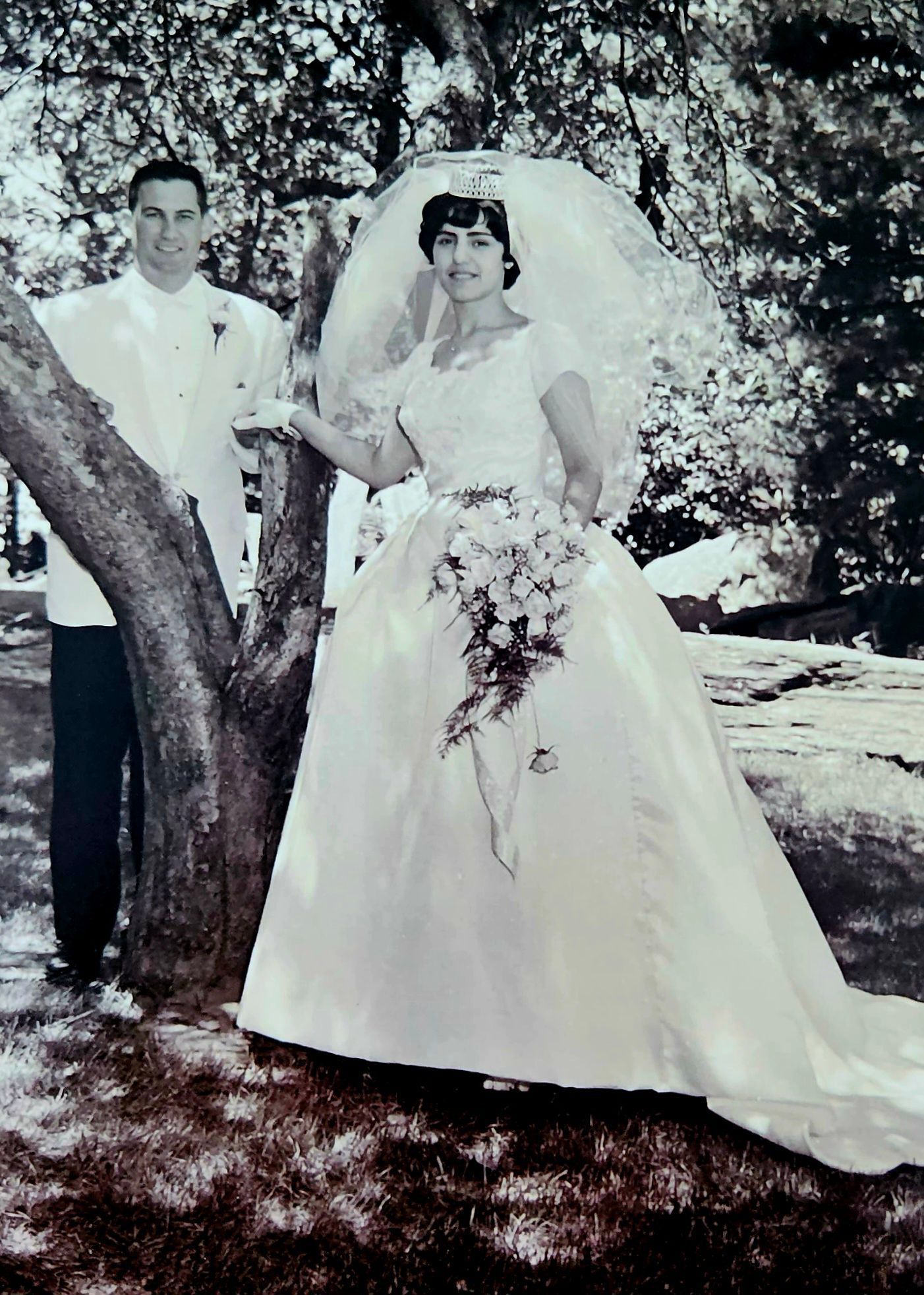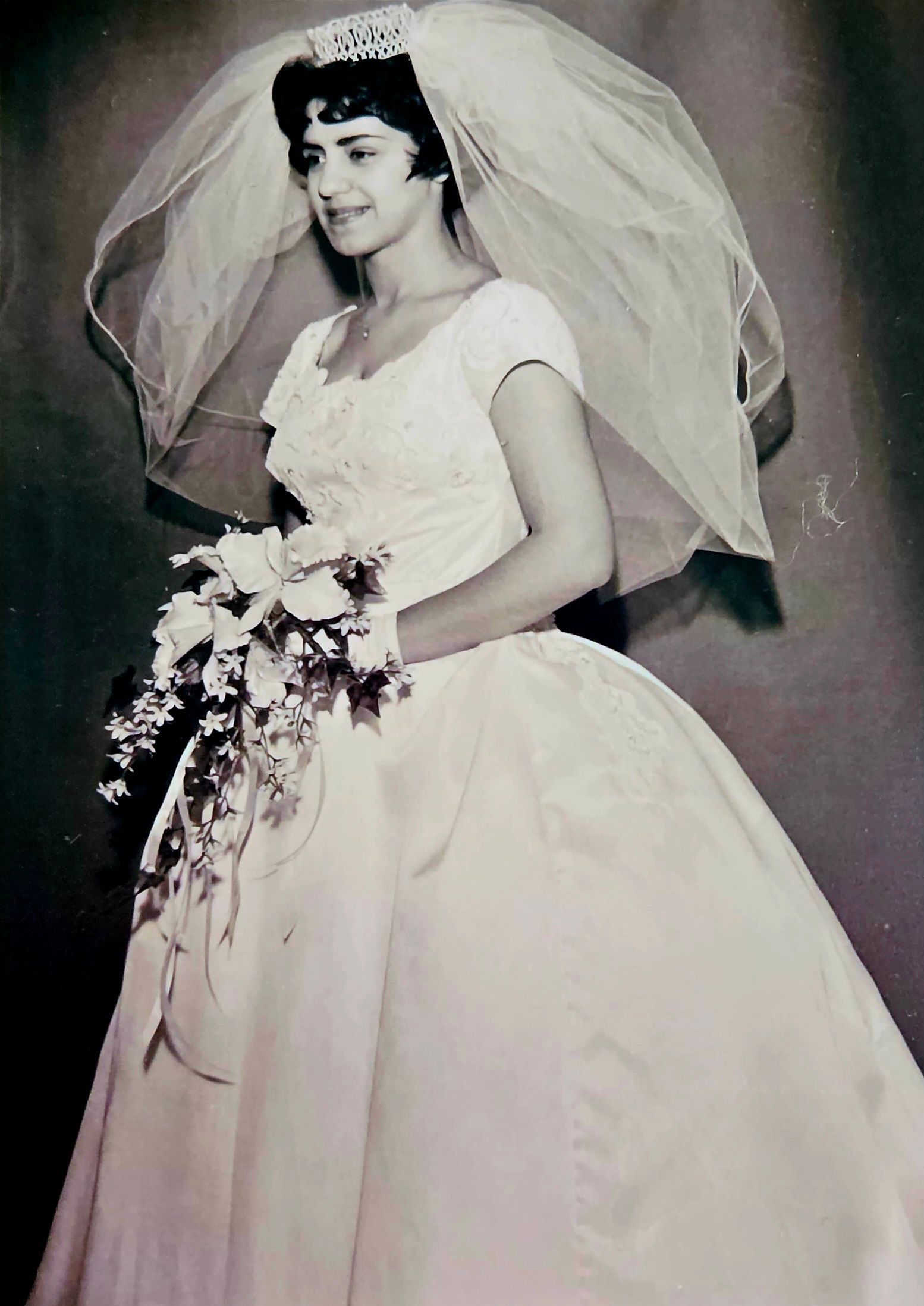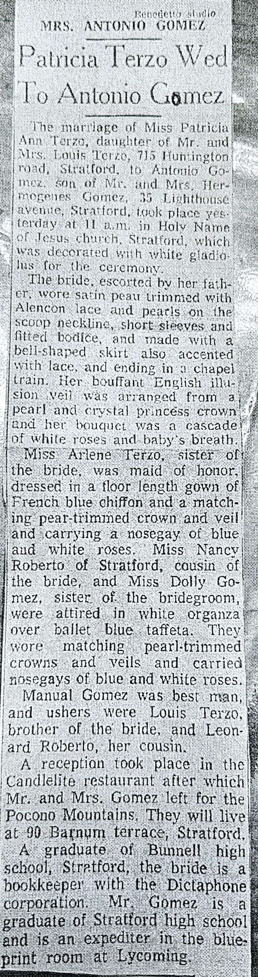 The wedding dress and veil of Patricia Ana Tergo Gomez of Stratford, CT, who married Antonio Gomez, also of Stratford, in 1963. The dress was made by Joelle Bridals of 1385 Broadway, NYC, and fitted by Marie's Bridals of 140 Frank Street, Bridgeport, CT. Patricia was a graduate of Bunnell High School in Stratford, and at the time of her wedding worked as a bookkeeper with the Dictaphone Corporation. Antonio also graduated from Bunnell, and worked as an expediter in the blueprint room at Lycoming. The dress was donated by Kathy Winkler, the daughter of Patricia and Antonio.Collection