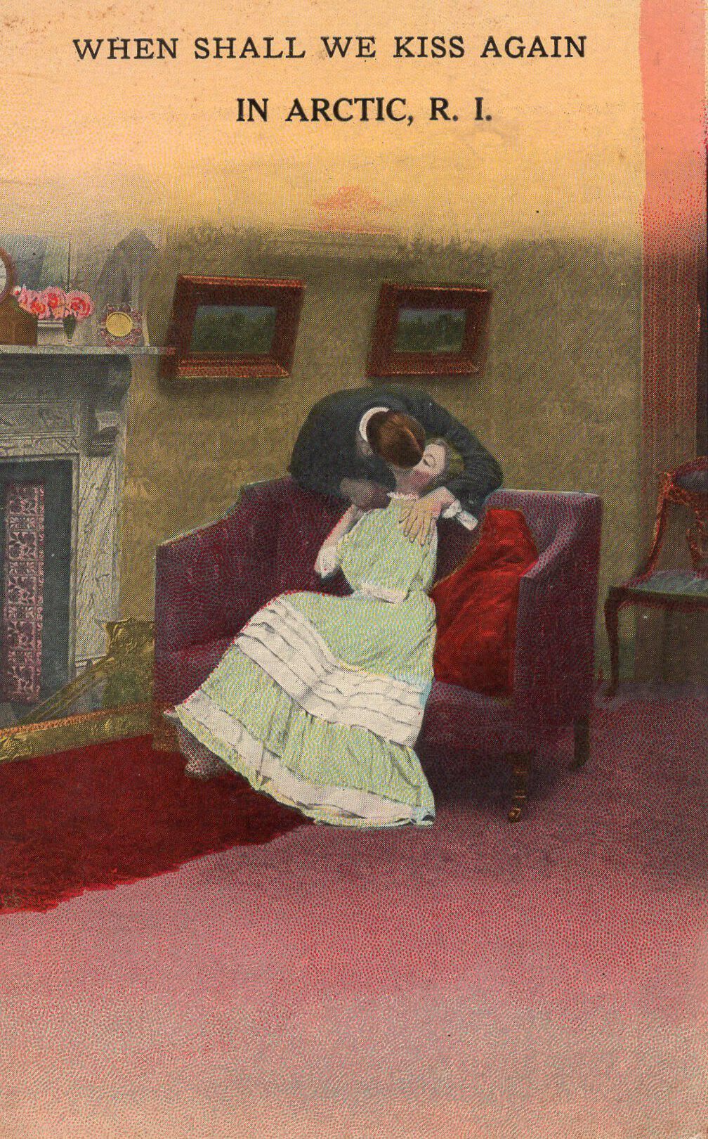 A postcard of a couple with the words When Shall we Kiss Again, in Arctic, R.I. printed on the card.Condition