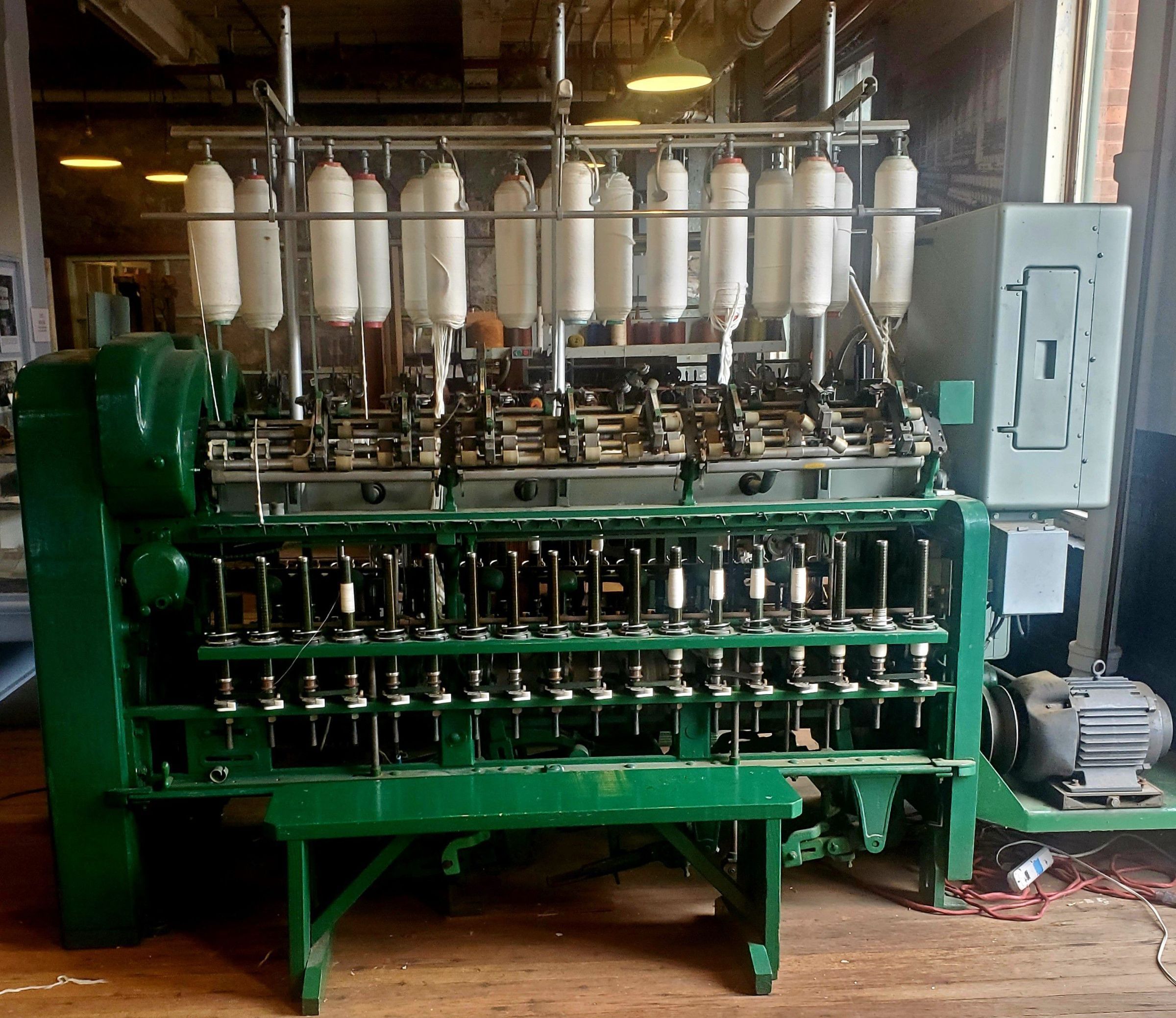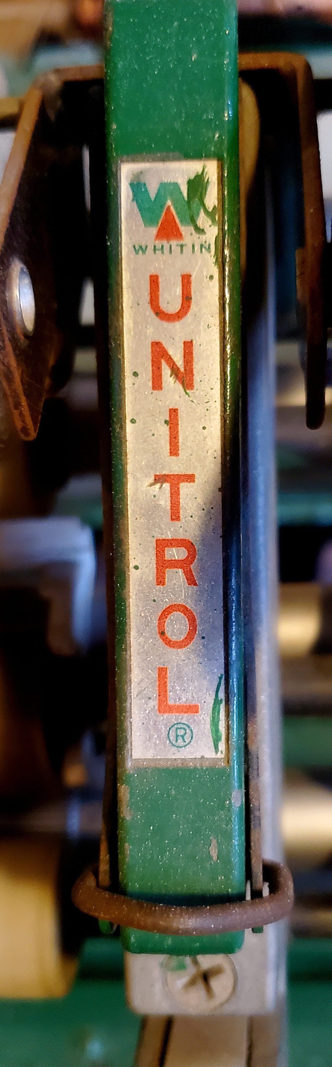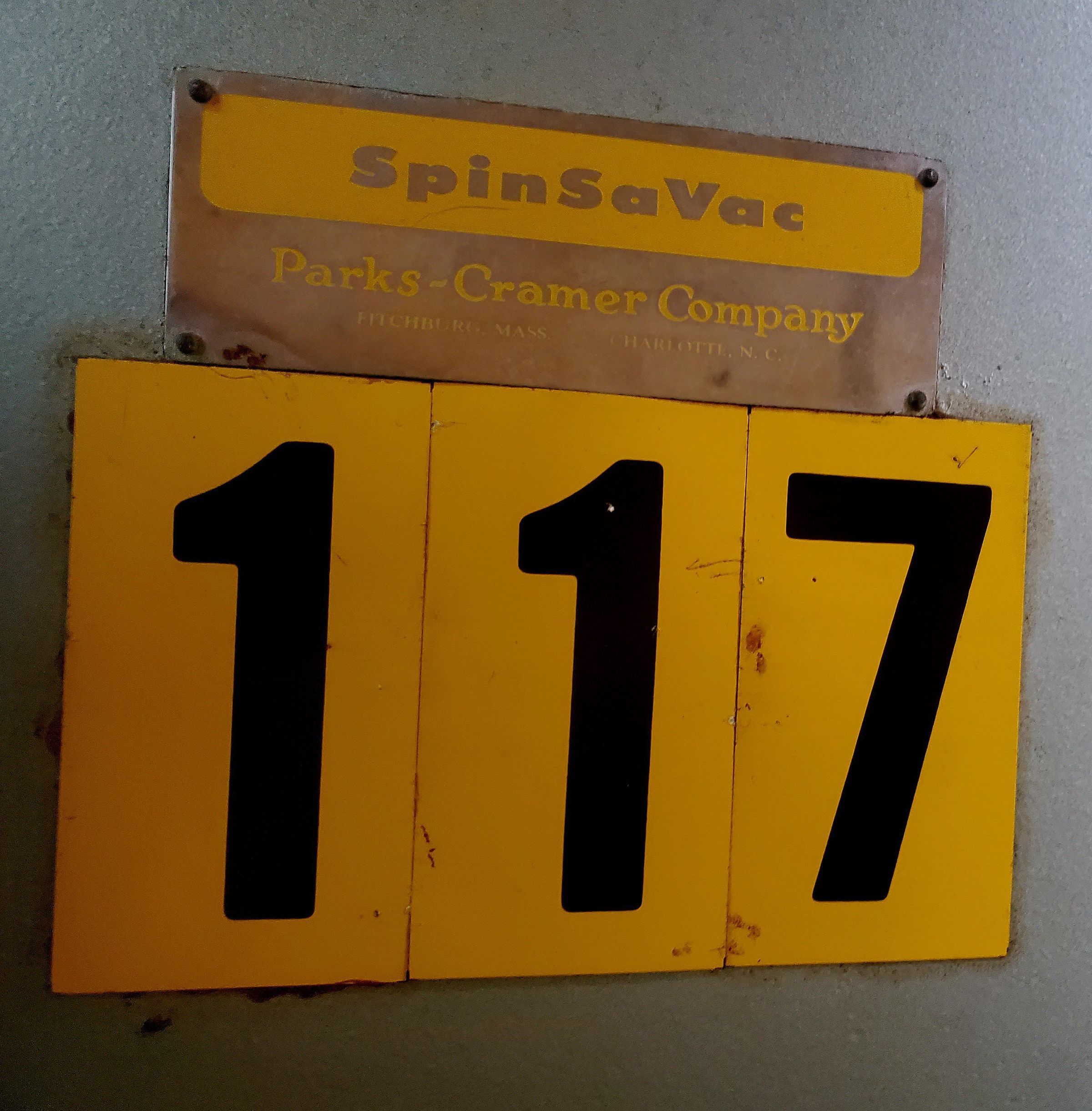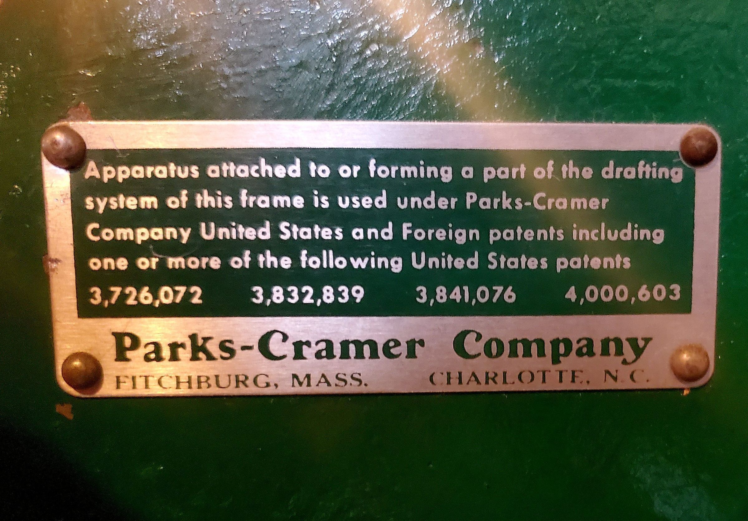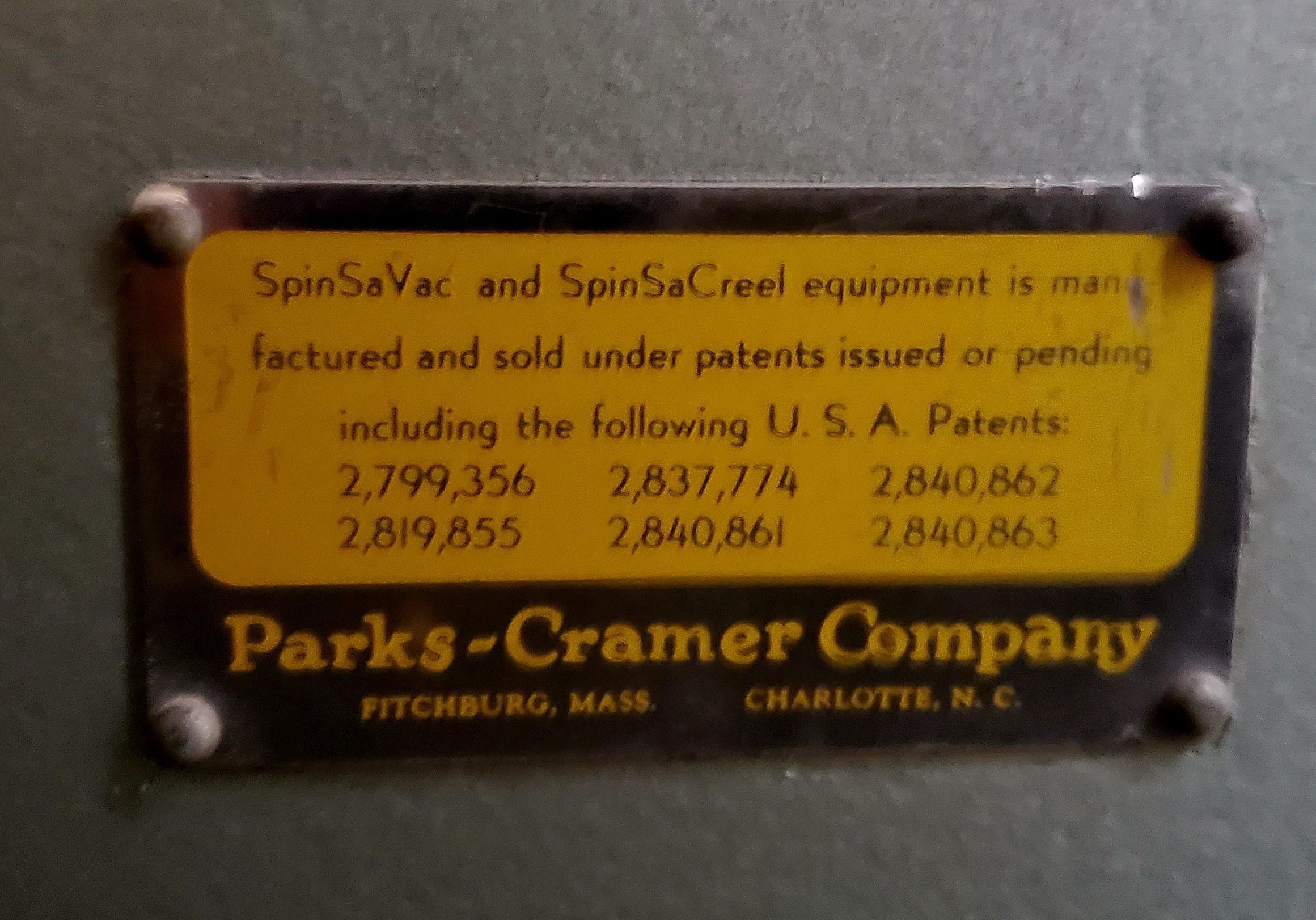 Whitin ring spinning frame. 36 spindles. Manufactured c. 1955 by the Whitin Machine Works in Whitinsville, MA. The Whitin Company began operations as a cotton mill in 1809, but began manufacturing mill machinery in 1847. Belt driven, powered by an electric motor manufactured by General Electric (General Electric Control, #79296). Attached is a SpinSaVac vacuum ("suction end-catcher") that suctions about 90% of the loose fibers created in the spinning process, a safety feature protecting workers from "white lung disease." The SpinSaVac was manufactured by the Parks-Cramer Company of Fitchburg, MA and Charlotte, NC, patent numbers 3,726,072; 3,832,839; 3,841,076; and 4,000,603. Parks-Cramer was formed in 1919 by the merger of the G. M. Parks Co. of Fitchburg, MA and the Stuart Warren Cramer Co. of Charlotte, NC. It specialized in AC for textile mills. SpinSaVac was a spin-off corporation. The SpinSaVac suction end-catcher was patented and trademarked in 1955. The patent expired in 1997.