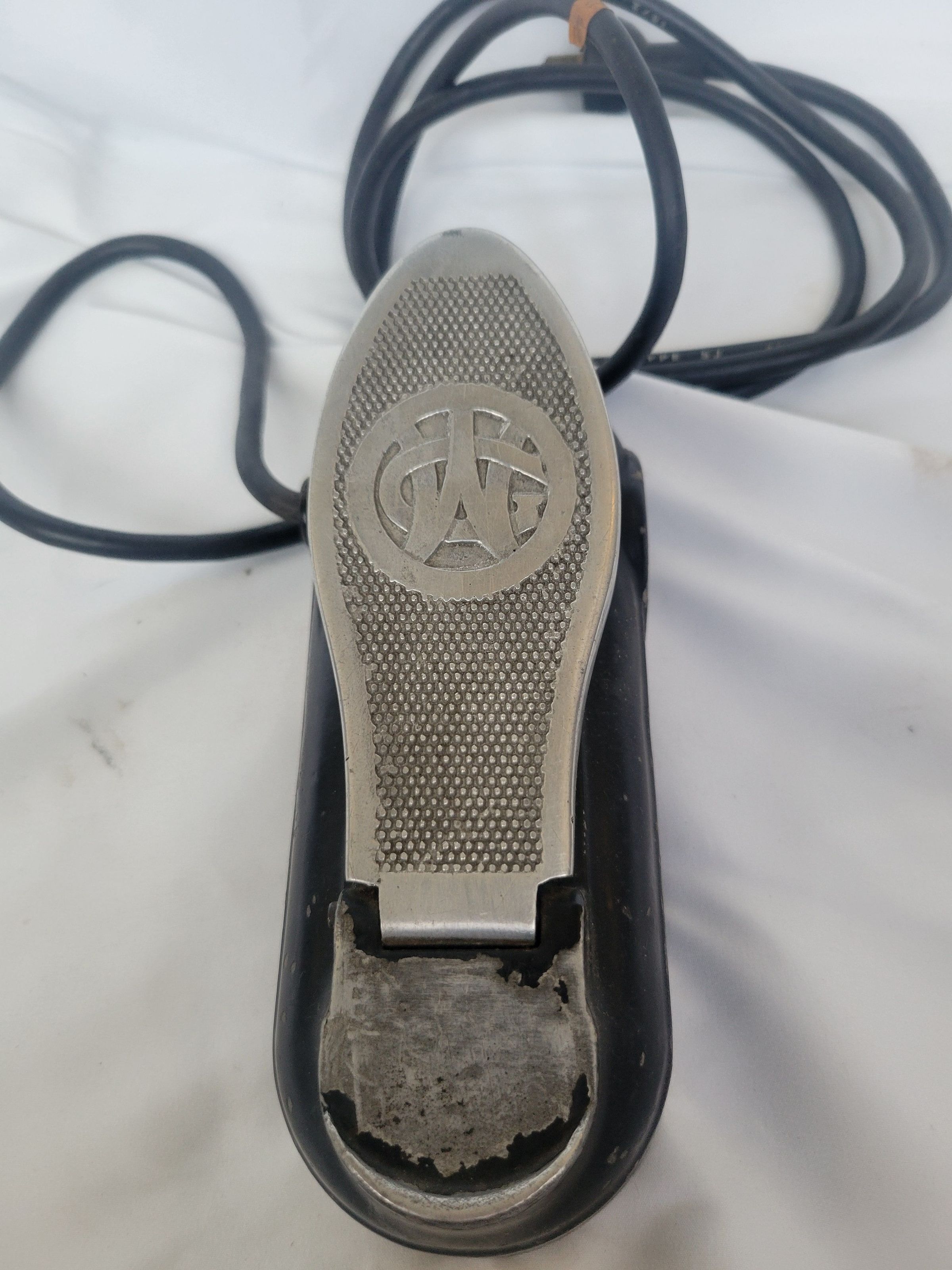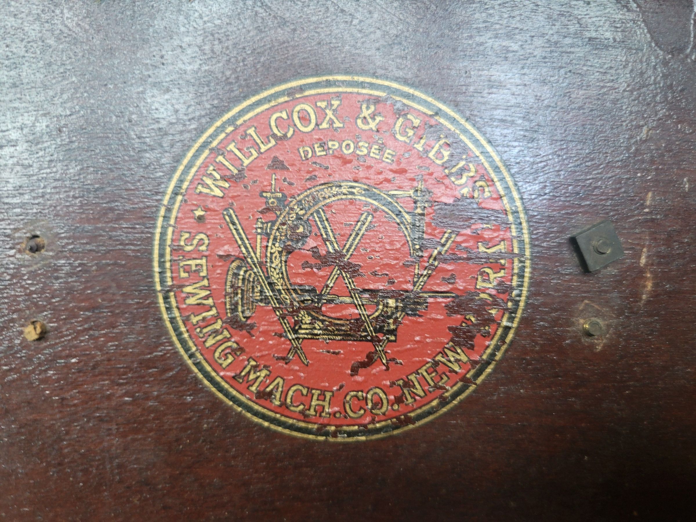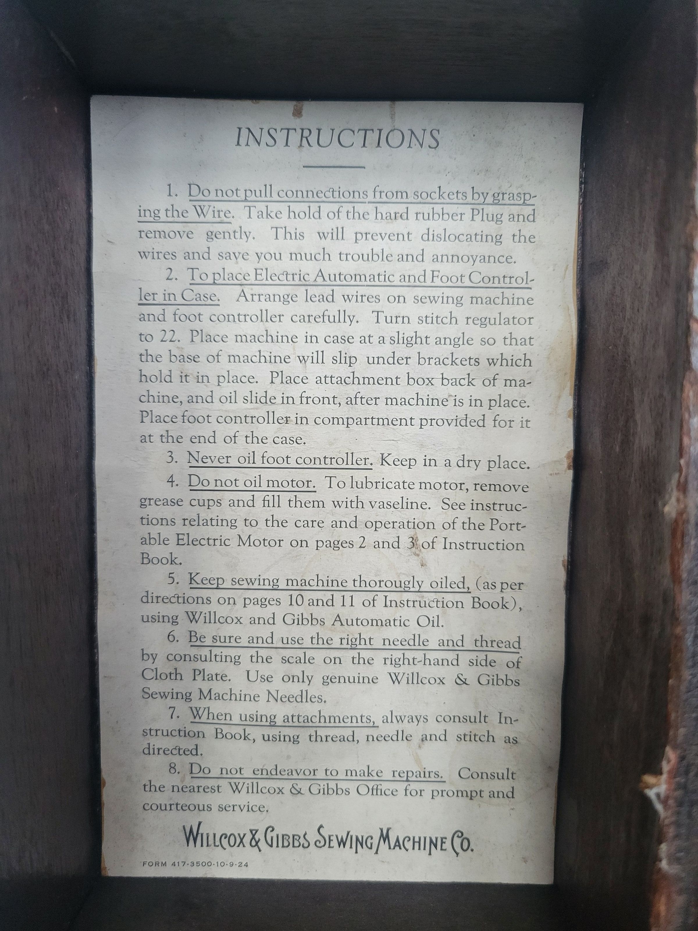 Willcox and Gibbs electric sewing machine with case. Included are the sewing machine and foot pedal with appropriate cords attached. The case is wooden with cradles built in to support the machine in transit. Inside the lid is a list of instructions for the operation and maintenance of the machine. It also features the red and gold Willcox and Gibbs logo, a sewing machine with needles crossed in front. The Willcox and Gibbs company began making sewing machines in 1858, operating out of a factory in Providence, RI. Their machines featured a simple design and were cheaper than their largest competitor, Singer, which allowed them to flourish.Collection