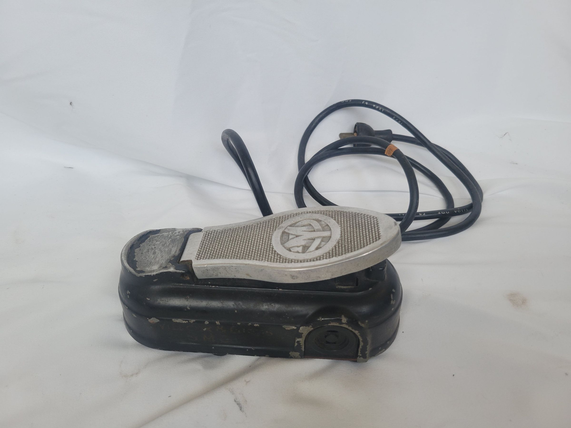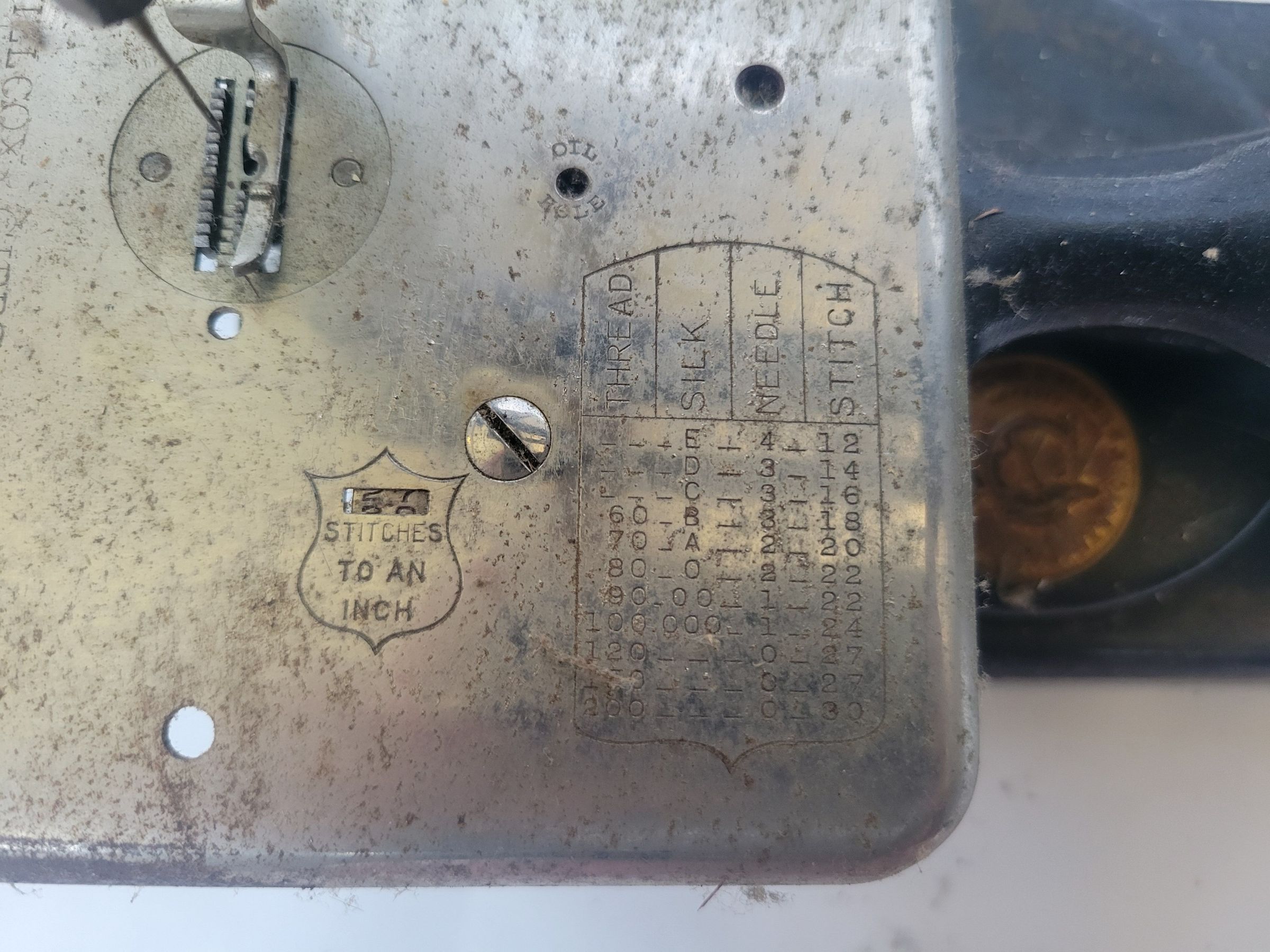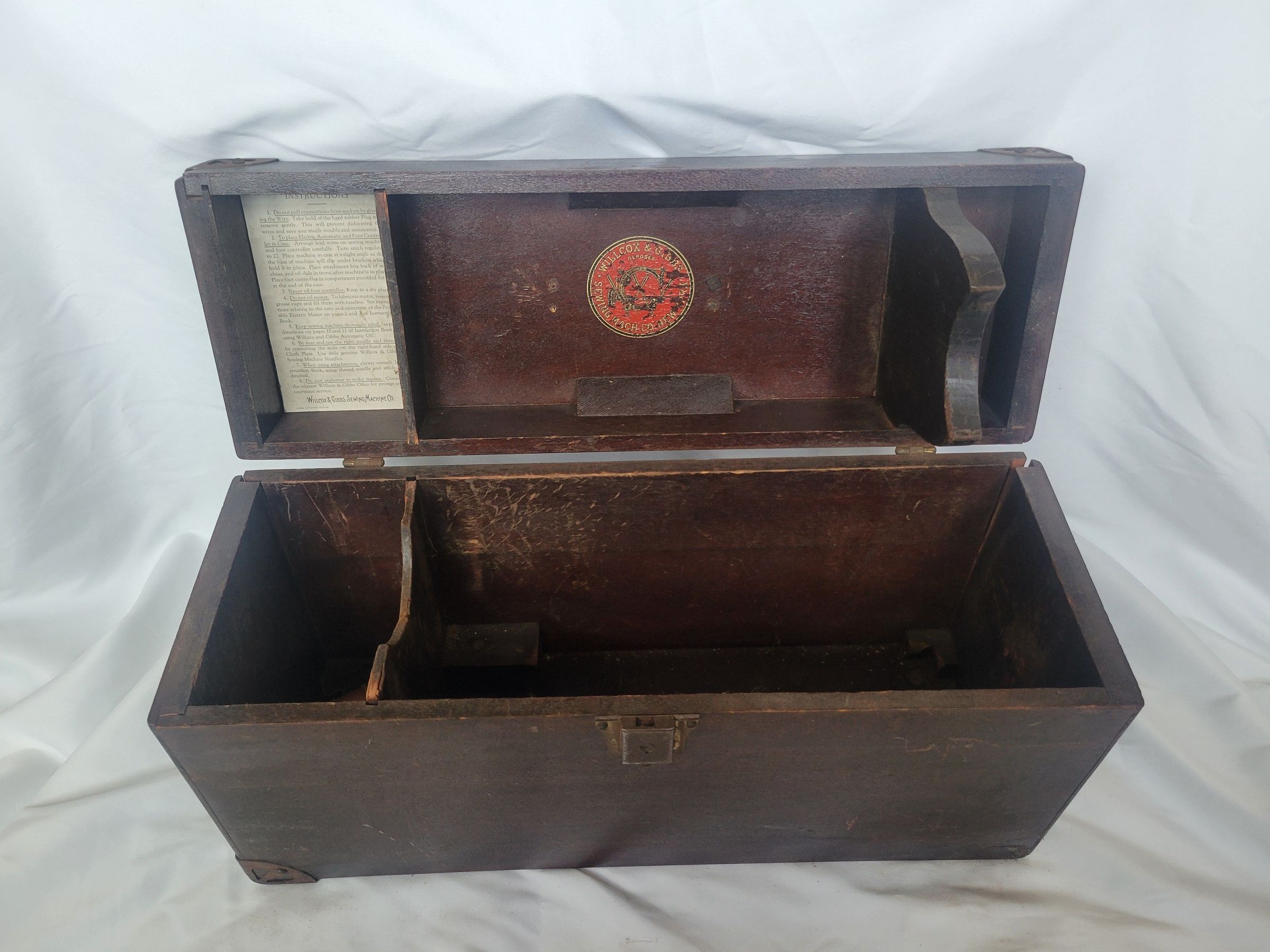 Willcox and Gibbs electric sewing machine with case. Included are the sewing machine and foot pedal with appropriate cords attached. The case is wooden with cradles built in to support the machine in transit. Inside the lid is a list of instructions for the operation and maintenance of the machine. It also features the red and gold Willcox and Gibbs logo, a sewing machine with needles crossed in front. The Willcox and Gibbs company began making sewing machines in 1858, operating out of a factory in Providence, RI. Their machines featured a simple design and were cheaper than their largest competitor, Singer, which allowed them to flourish.Collection