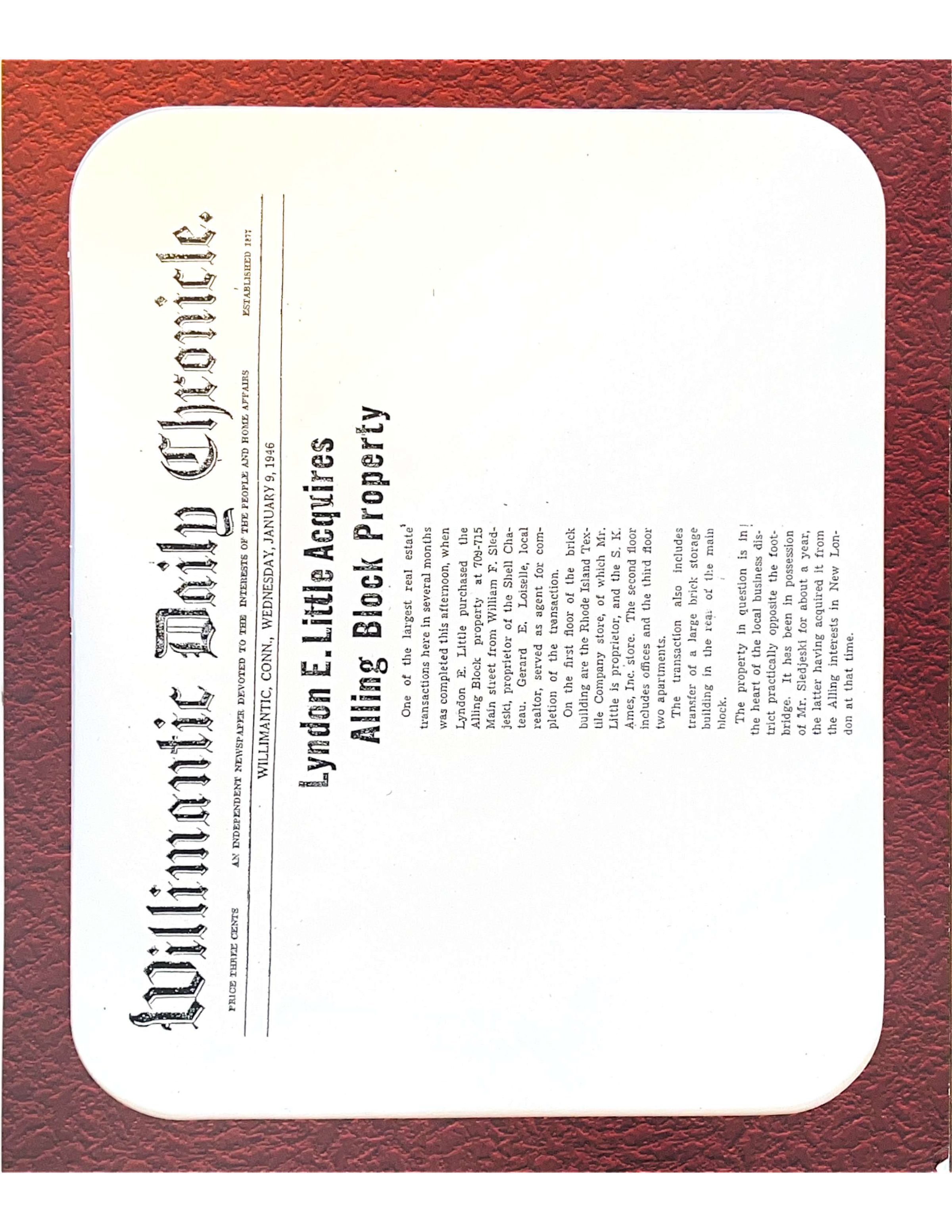The article reads, " One of the largest real estate transactions here in several months was completed this afternoon when Lyndon E. Little purchased the Alling Block property at 709-715 Main Street from William F. Sledjeski, proprietor of the Shell Chateau. Gerard E. Loiselle, a local realtor, served as an agent for the completion of the transaction. On the first floor of the brick building are the Rhode Island Textile Company store, of which Mr. Little is the proprietor, and the S. K. Ames, Inc. store. The second floor includes offices and the third floor two apartments. The transaction also includes the transfer of a large brick storage building in the rear or the main block. The property in question is in the heart of the local business district practically opposite the footbridge. It has been in possession of Mr. Sledjeski for about a year, the latter having acquired it from the Alling interests in New London at that time."