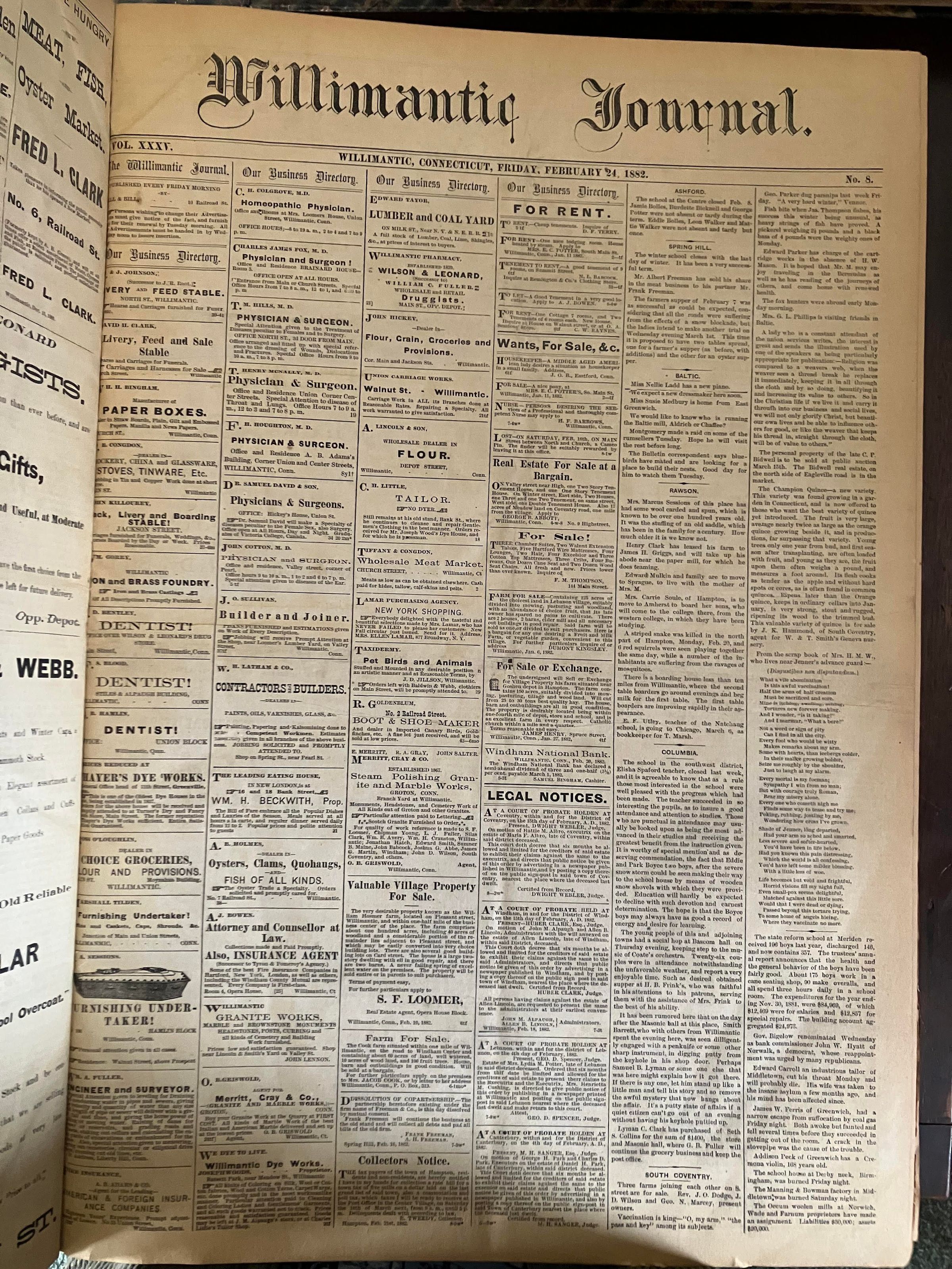 A collection of newspapers from the Willimantic Journal from December 16th 1881 to December 28th 1883. This collection also includes a Newspaper from the New York Weekly Herald from December 9th 1882.Context