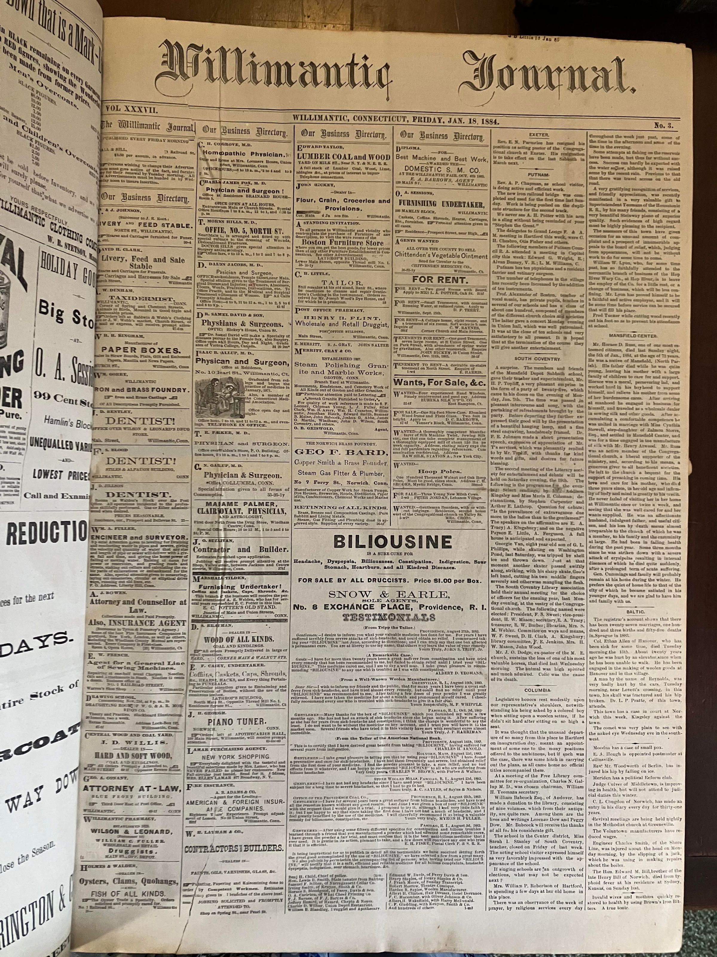 A collection of newspapers from the Willimantic Journal from January 4th, 1884 to December 25th, 1885.Context