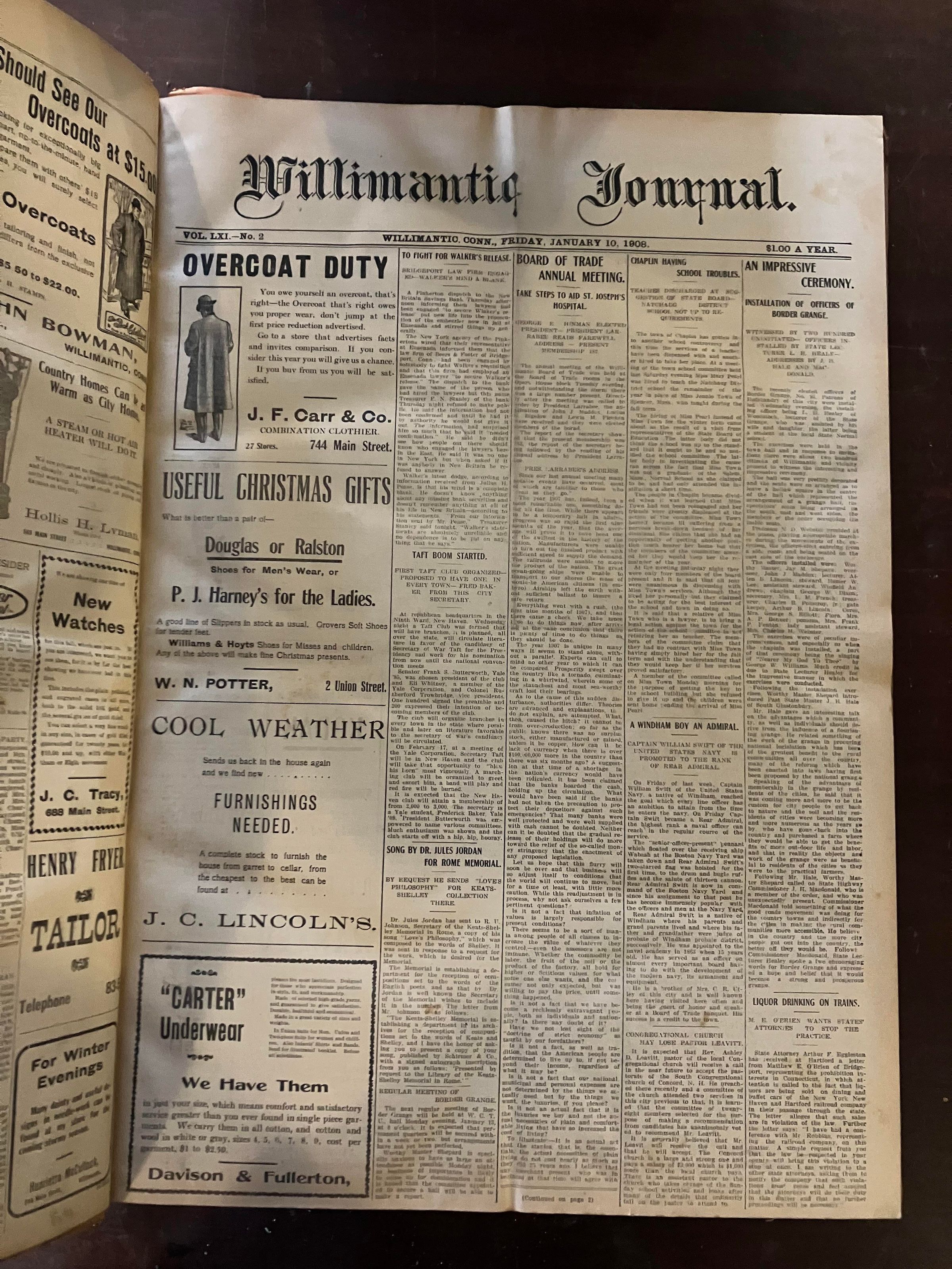 A collection of newspapers from the Willimantic Journal from January 1908 to December 1908.Context