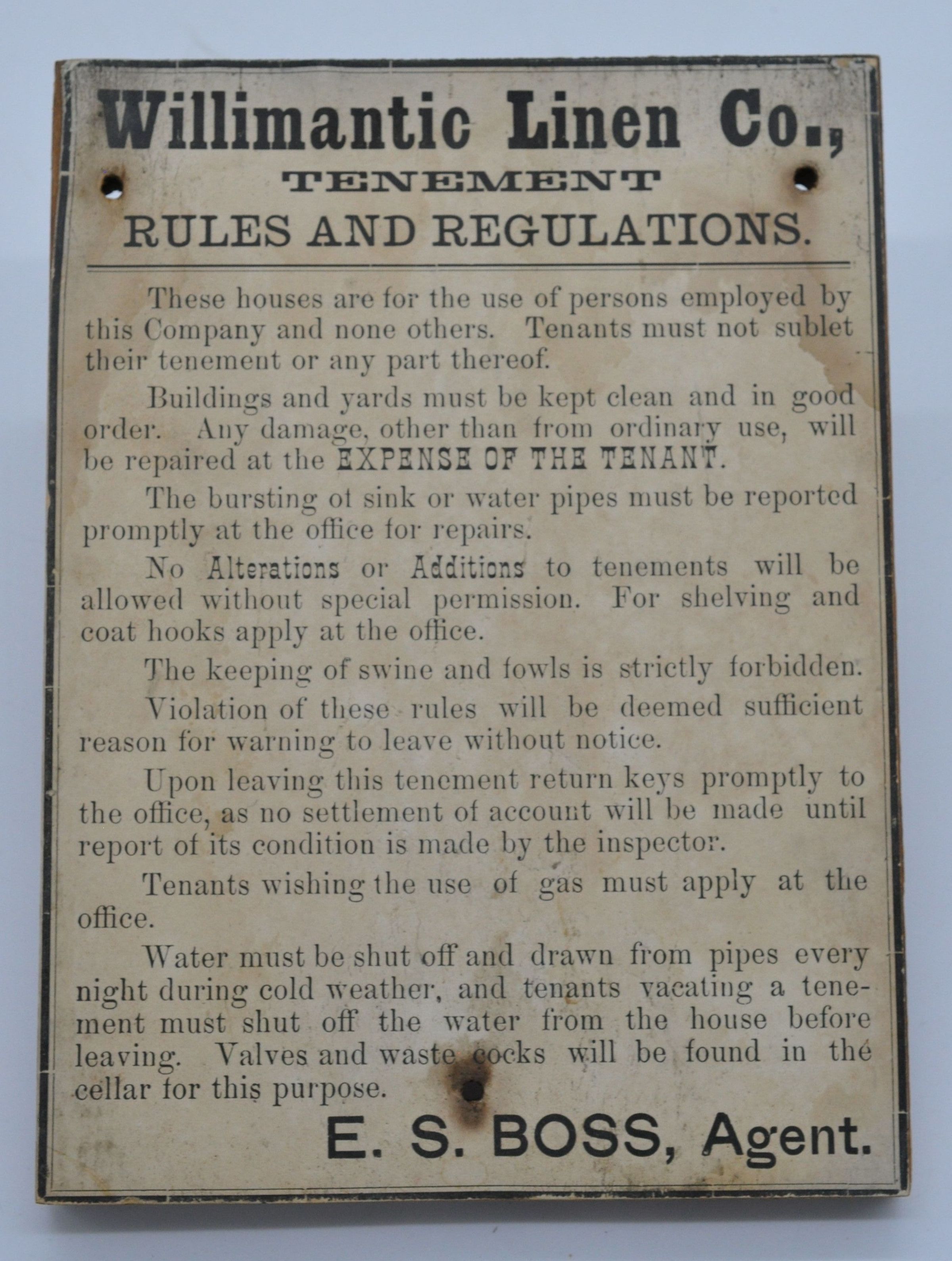 A list of rules posted by the Willimantic Linen Co. in their tenement buildings. They specify that tenants are not allowed to sublet the tenements, that they may not make alterations, and that they may not keep livestock, among other things. It is signed off by E.S. Boss, Agent. Eugene S. Boss was an agent of the Willimantic Linen Co. and then later the American Thread Company. He worked his way up from middle management to chief executive of the Willimantic Mills. The rules are printed on paper and then adhered to a half inch thick block of wood of the same size.Collection