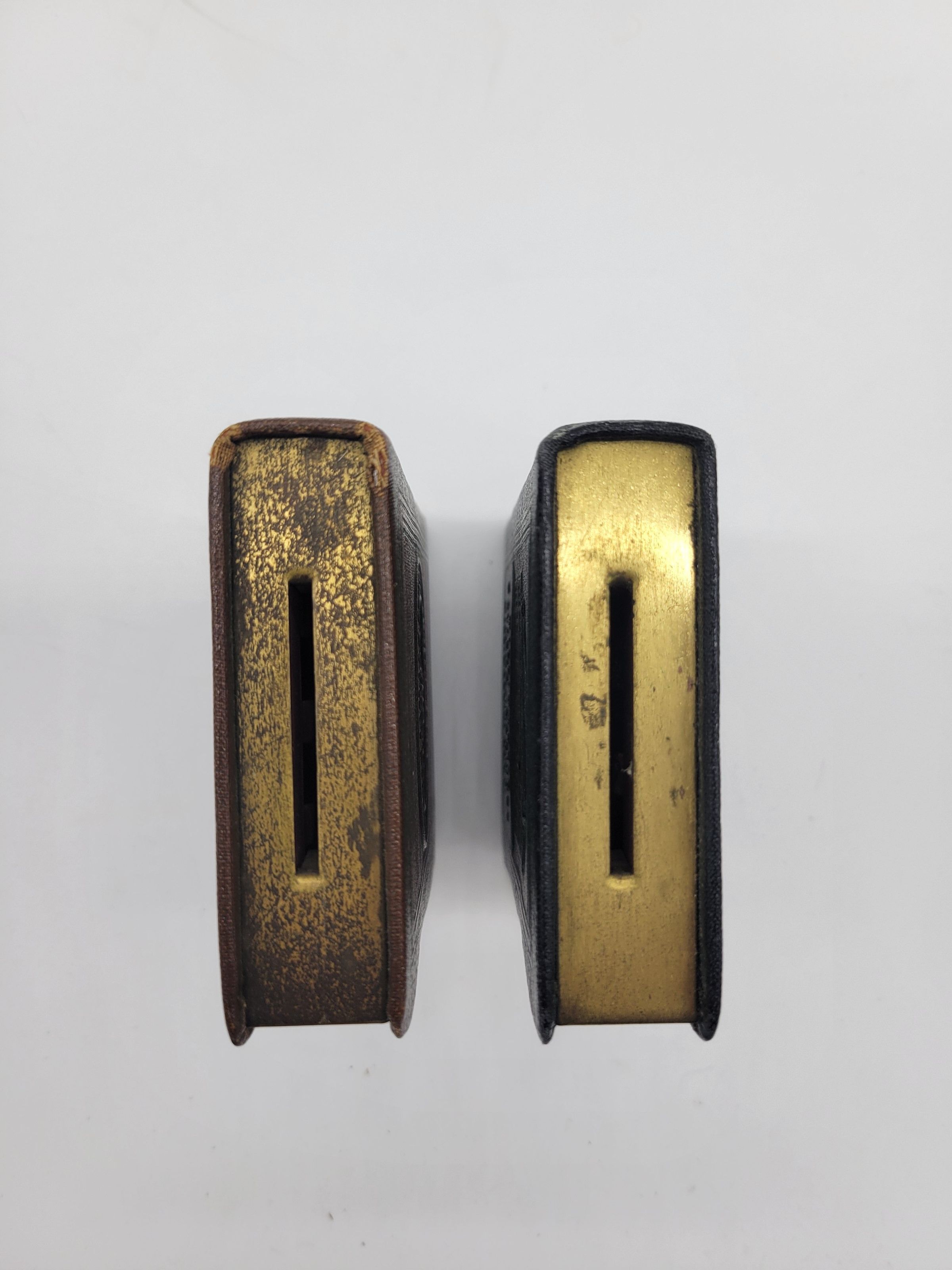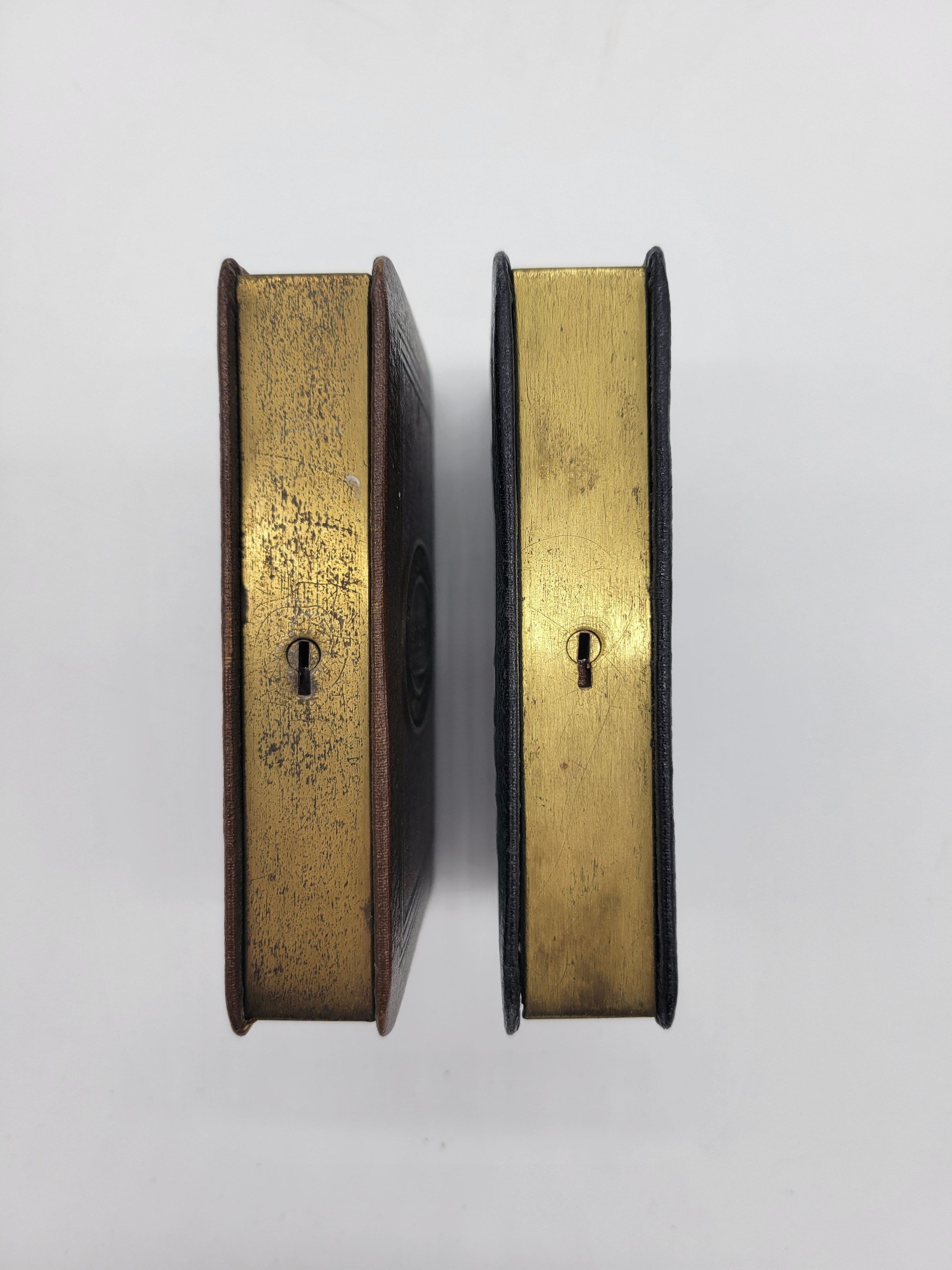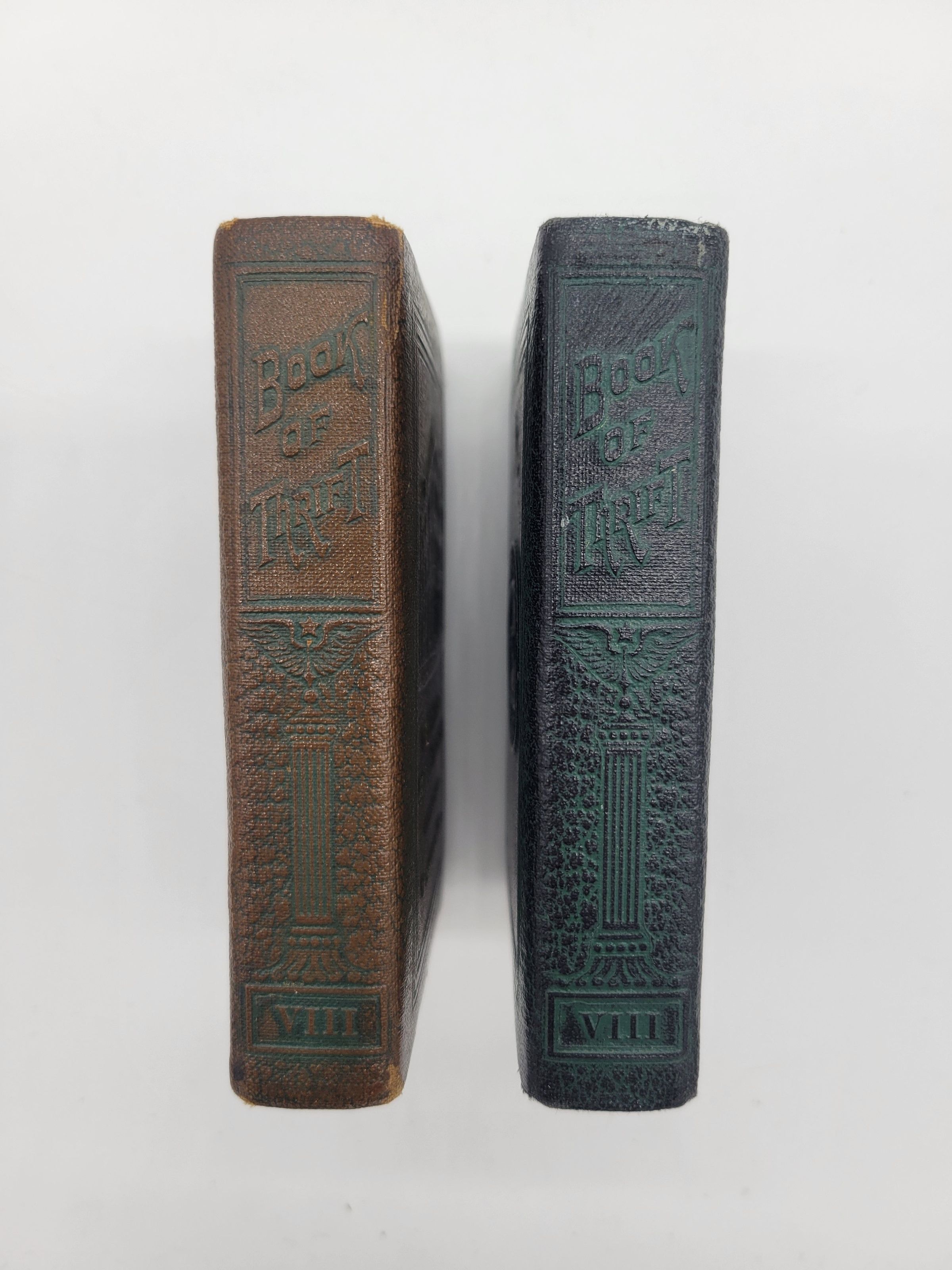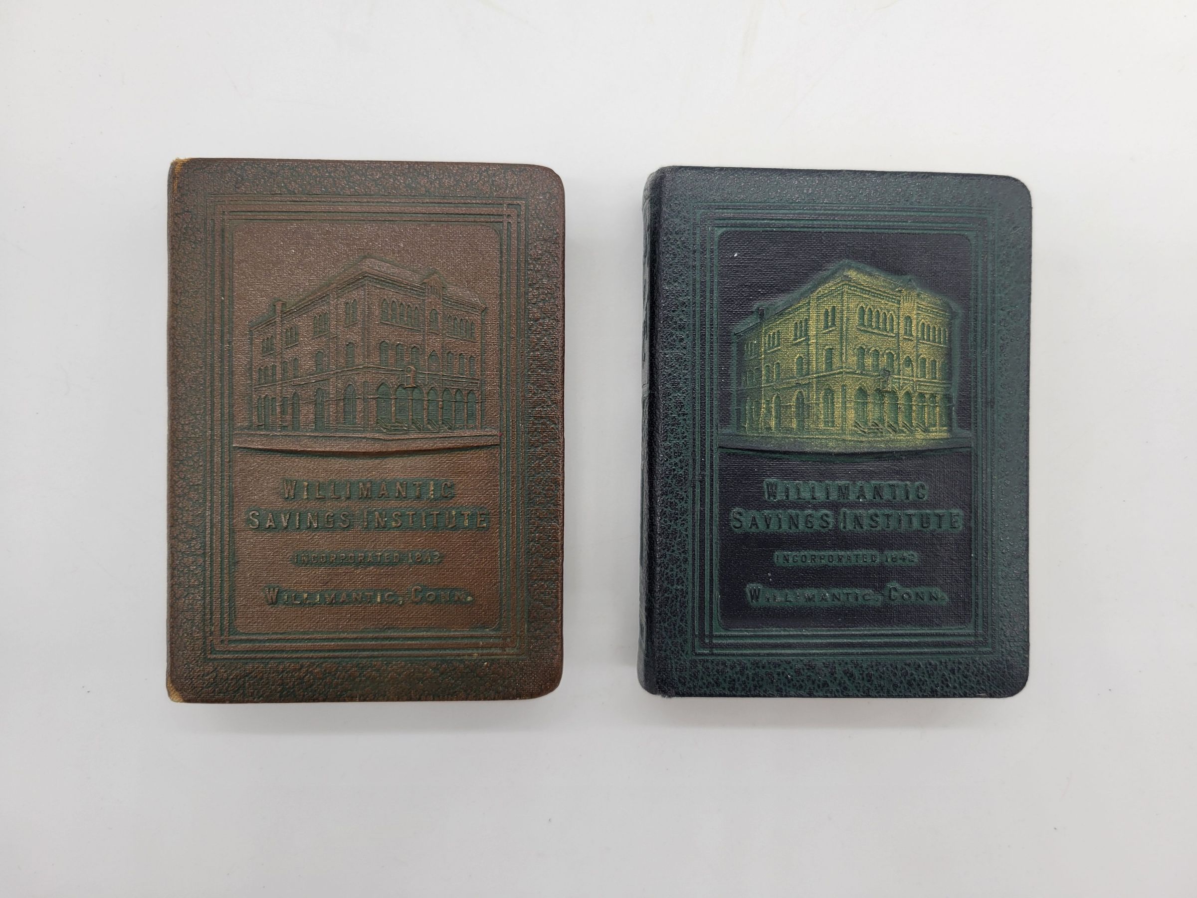 Two brass leather covered coin banks from the Willimantic Savings Institute of Willimantic, CT; one is brown with green detail, the other is dark blue with green and gold detail. Two two books are embossed identically with a picture of the bank and "WILLIMANTIC SAVINGS INSTITUTE/ INCORPORATED 1842/ WILLIMANTIC, CONN." on the front. the leather covered edge says "BOOK of THRIFT" and features a column with wings at the top, and the roman numeral VIII at the bottom. The other edges are plain brass, the top with a slot for coins and notes, the side with a keyhole for opening, and on the bottom is written "BANKERS UTILITIES CO./ SAN FRANCISCO/ U.S.A./ PATENTED/ JULY, 3, 1923"Use