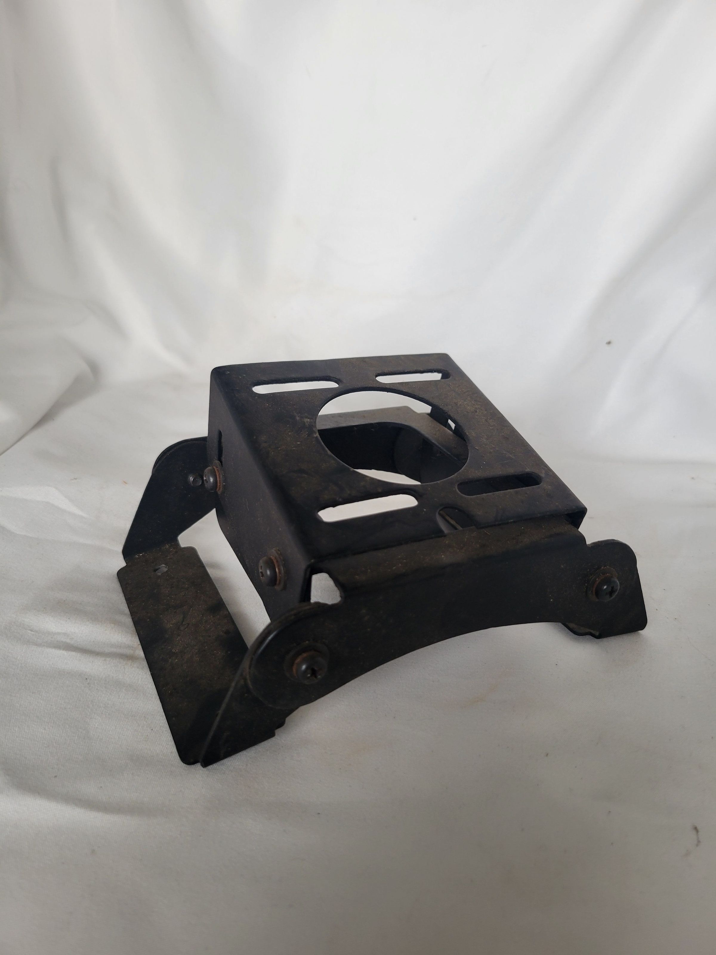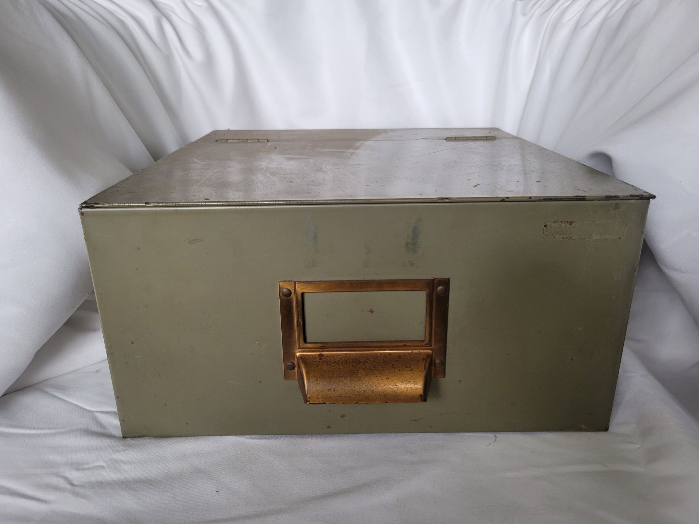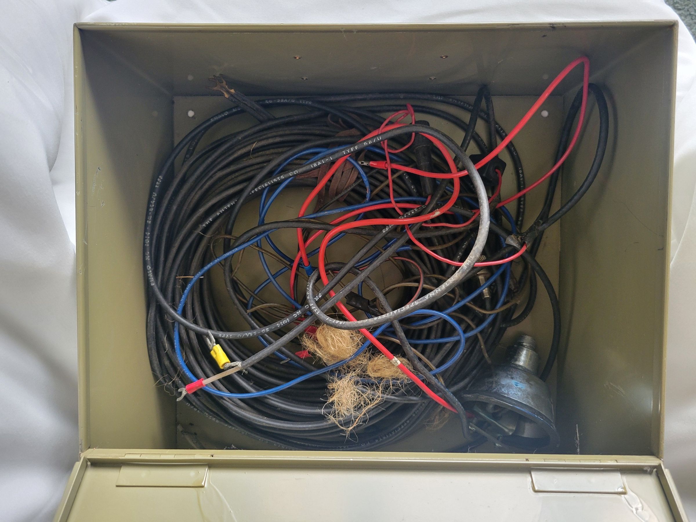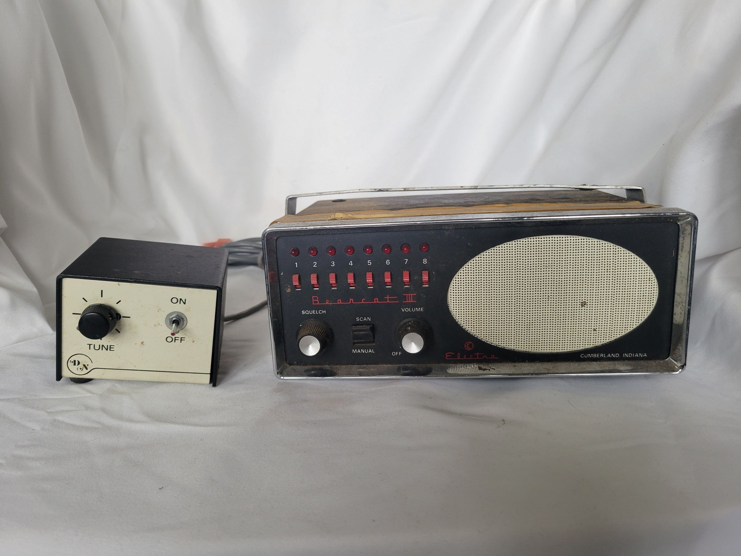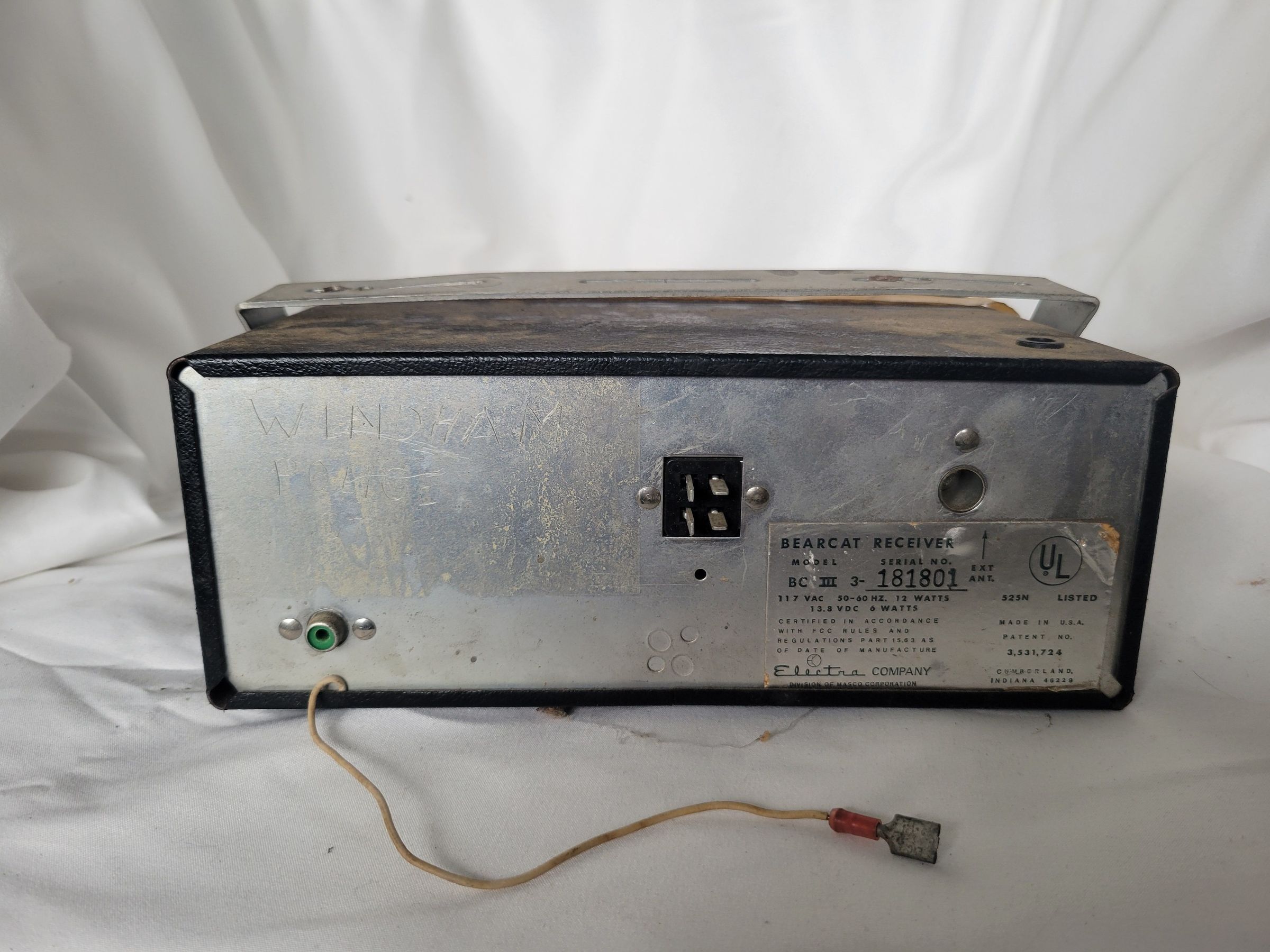 An Electra Bearcat III radio scanner and accessories which were used by the Windham CT police department in the 1970s. The scanner itself is dusty but seems in good condition, on the back is a plate with the manufacturer's information, and scratched into the blank metal beside it is "WINDHAM POLICE CT." The tuner and hump mount are also dusty but in good condition. Some of the accompanying wires have spots where the insulation has worn through. The scanner and its accessories are contained in a grey-green metal box. Radio scanners are used to scan a wide range of radio frequencies for any kind of broadcast, to which it can then be tuned. Police departments use them for a variety of reasons though they can also be used by the average citizen.Context