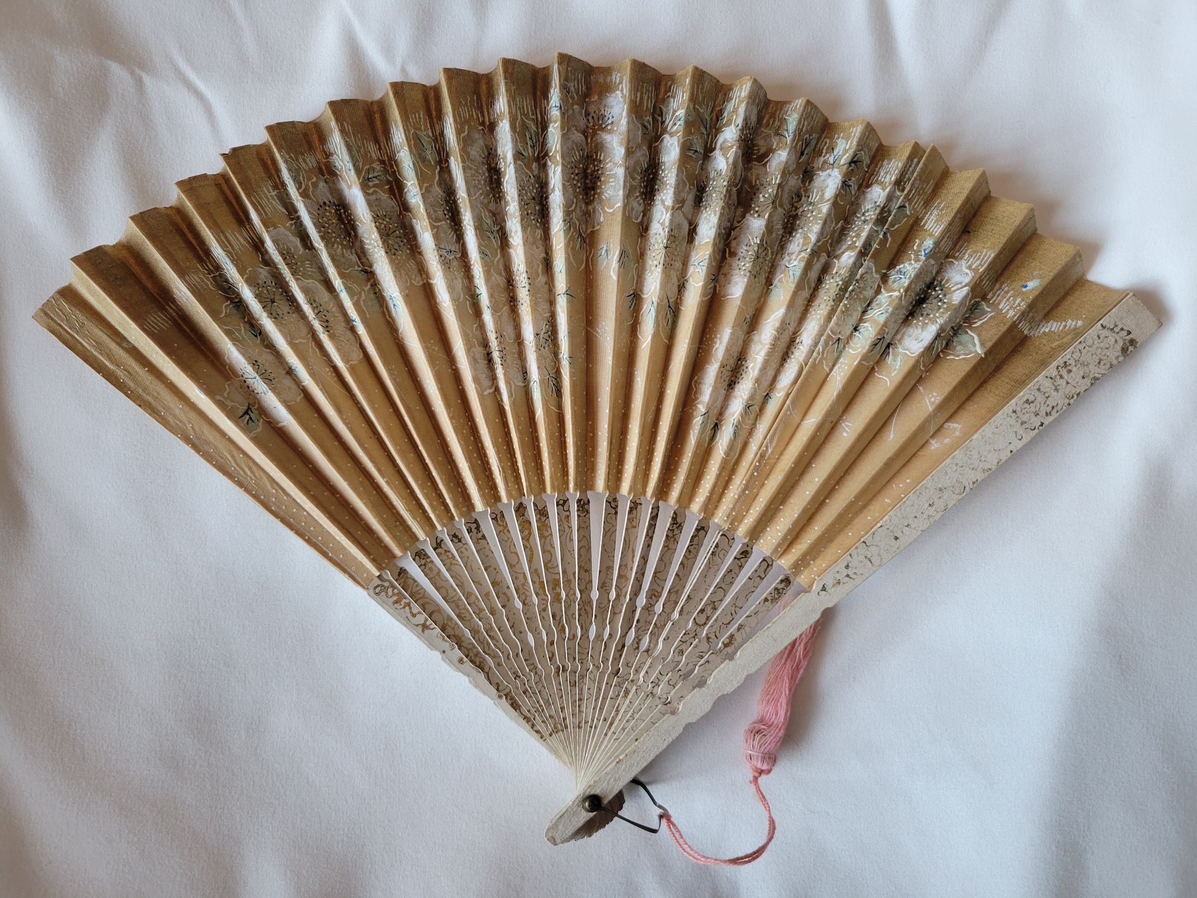 A hand fan with thin wooden spines and painted paper leaf. The sticks of this fan are stamped with a gold pattern and the leaf features a dot pattern at the base with flowers toward the edge. It also features a pink tassel attached to the hook. It is in very good condition, the paper of the leaf is stiff, indicating it was probably not used frequently.Collection