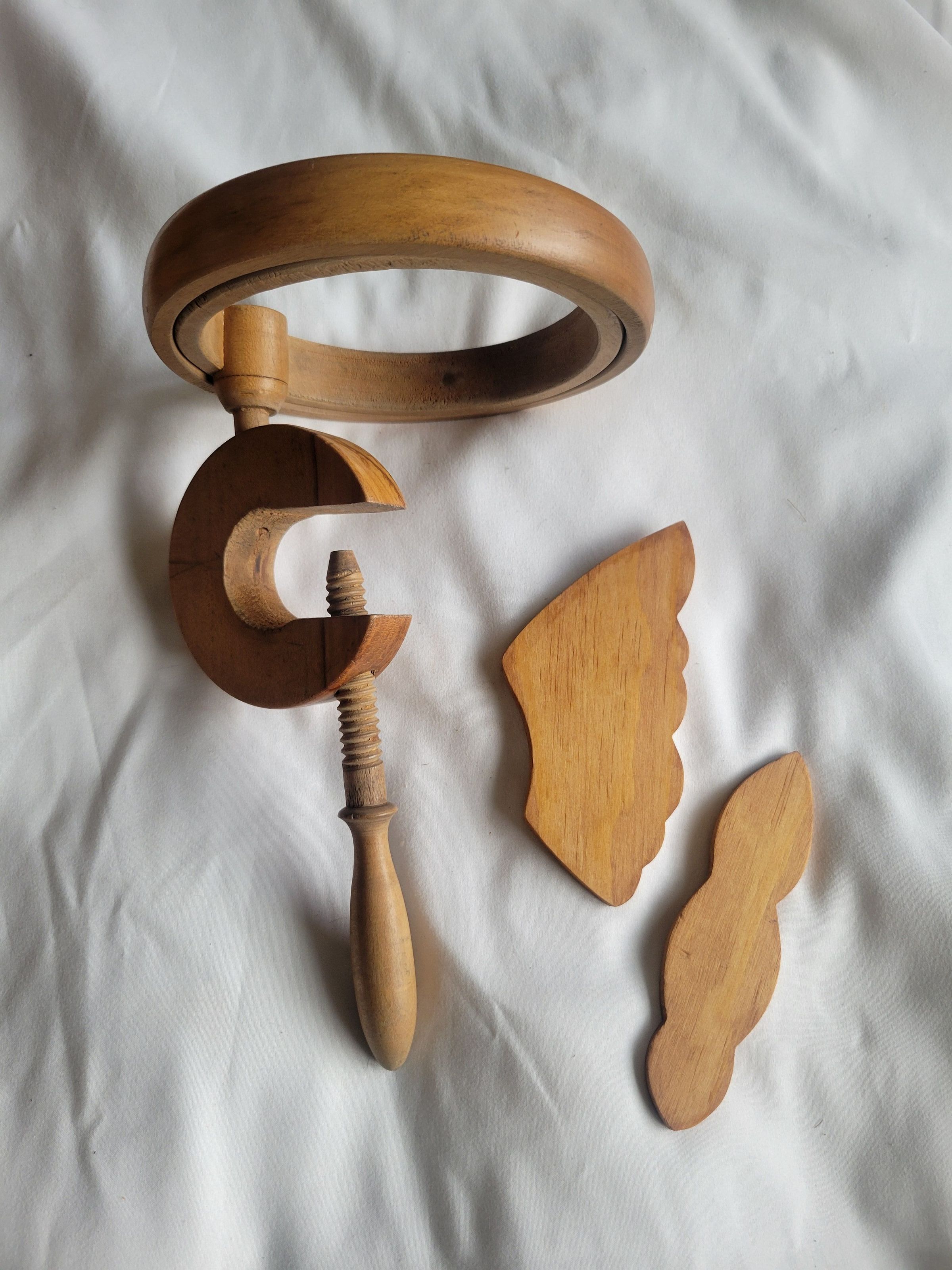 A late 19th century wooden table clamp with detachable embroidery hoop. Used with the hoop, the clamp would be secured to the edge of a table and the hoop rotated to face away from the table. At that point the fabric would be inserted between the two hoops as normal and could be worked on without the person needing to hold the hoop itself. Without the hoop the clamp might be used to secure large pieces of fabric onto a table while marking, cutting, or sewing. The additional flat pieces of wood could have been used to diffuse the pressure of the clamp on the fabric, meaning less chance of damage or imprints.Collection