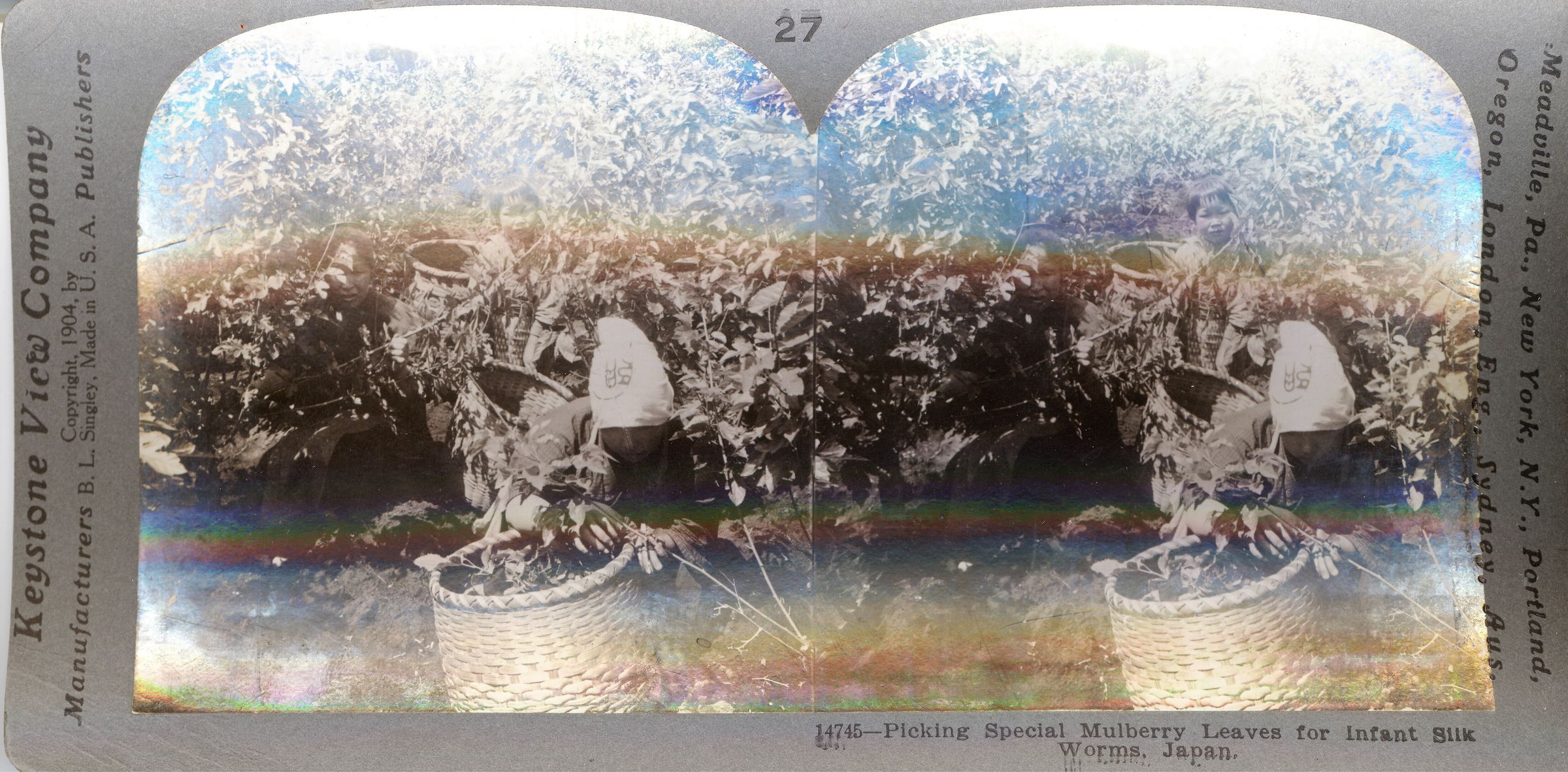 Stereograph of workers picking mulberry leaves for silk worms, Japan. 1904. Card is warped.Photograph Details