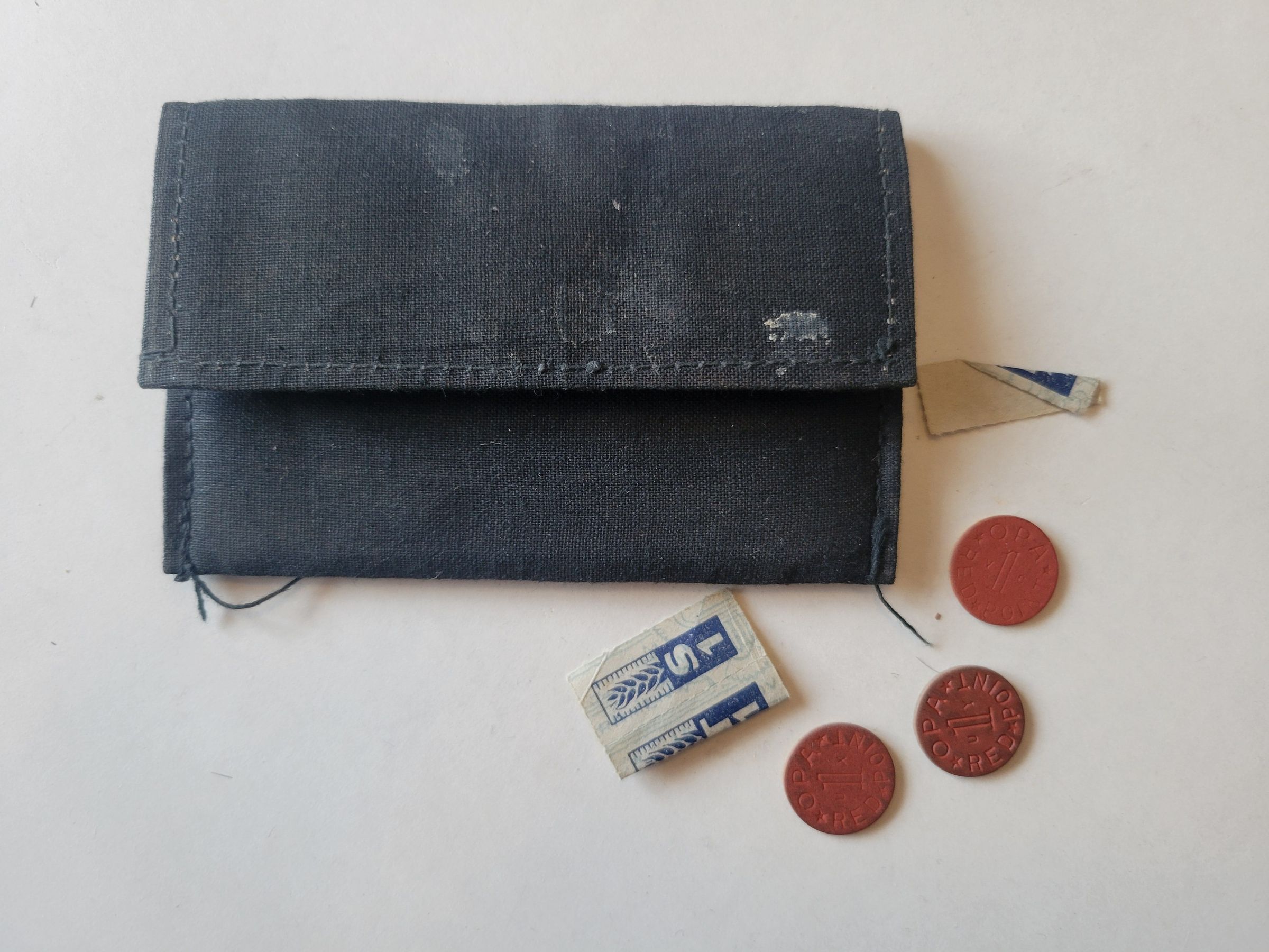 A black cloth pouch, possibly homemade, with three unused blue ration stamps and three celluloid one red point coins. The stamps likely fell out of their book and were saved, though some retailers did not accept stamps that they didn't tear out themselves because of the prevalence of black market stamps. The coins were issued to retailers to use as change for stamp transactions.Collection
