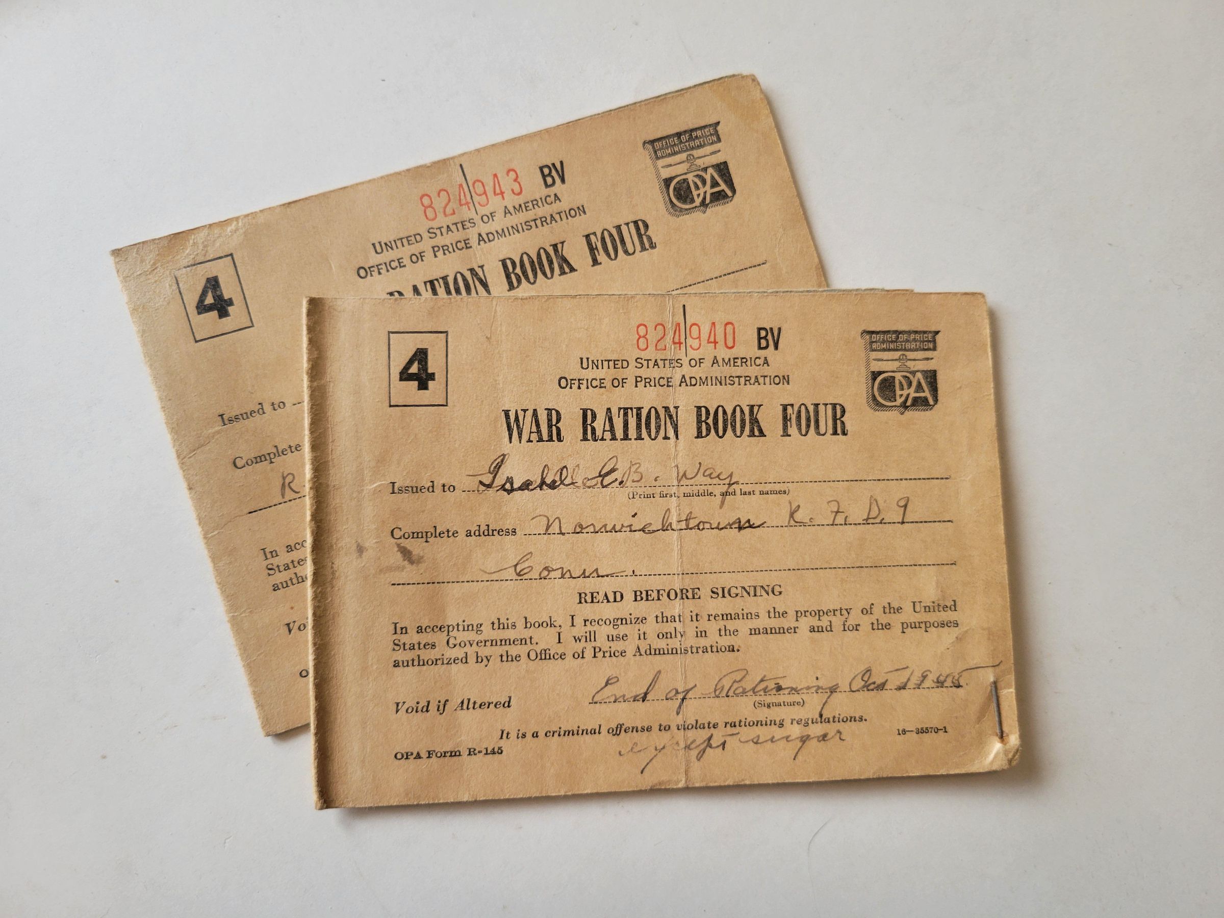 War Ration Book Four, issued from the OPA to Francis and Isabel Way. The name and address of the holder is handwritten in black on the front, as well as "End of Rationing Oct 1945/ except sugar" at the bottom. These are folded beige cardstock with sheets of stamps inside in various states of use. They are mostly full. Isabel's book has a straight pin stuck into the front cover.Context
