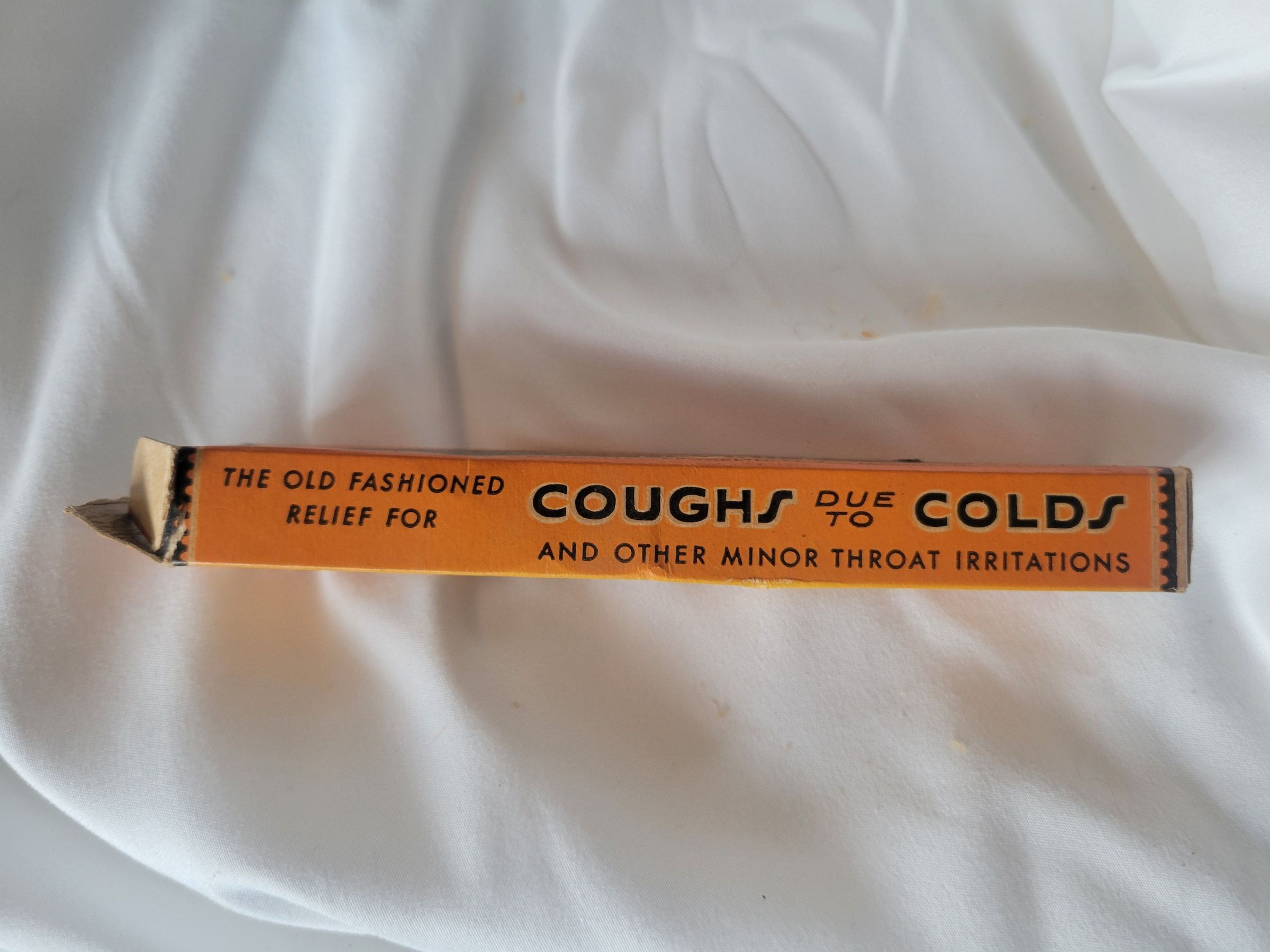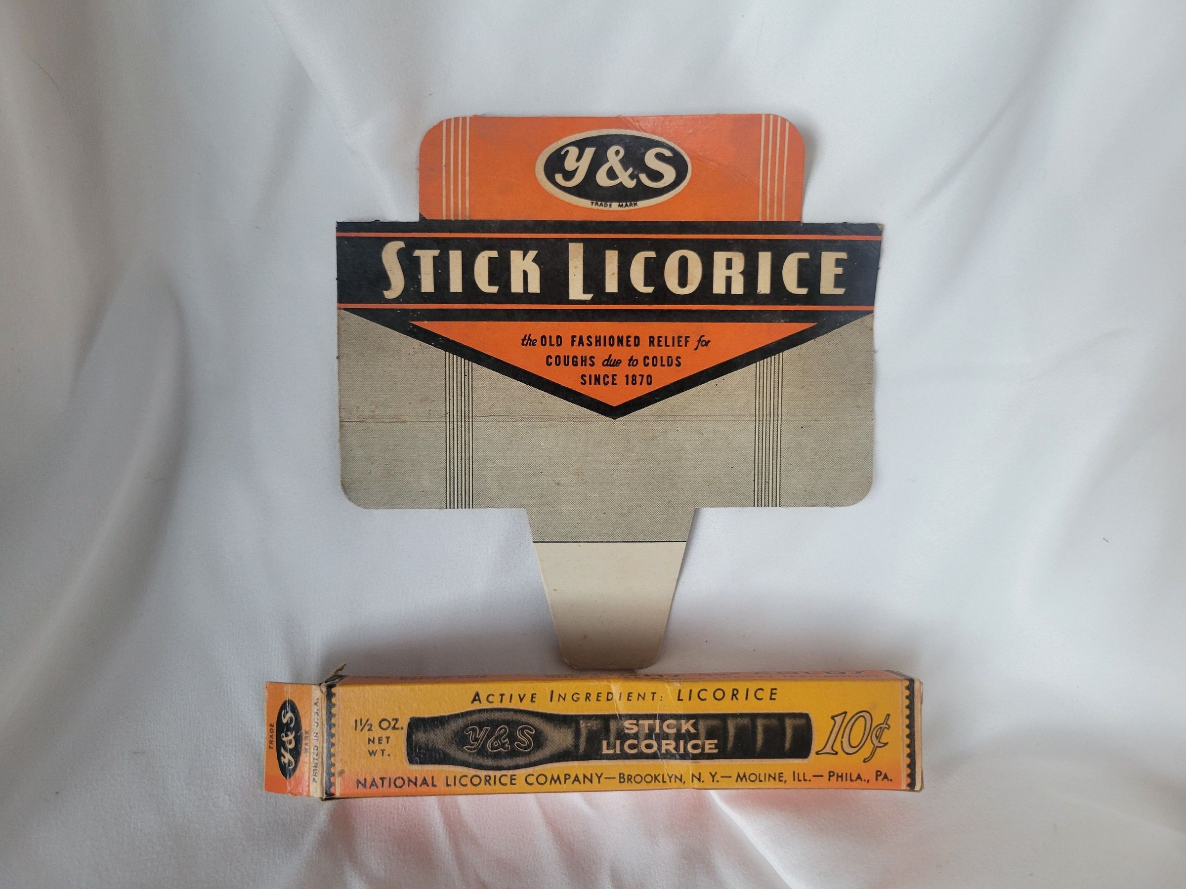 Y&S Stick Licorice display and individual box. The display would have stuck out the top of a large container of individual boxes for sale. The box itself held one stick of black licorice embossed with the Y&S logo. As the text on the box indicates the stated purpose of the licorice was to alleviate coughs and throat discomfort due to colds. Y&S was a division of the National Licorice Company which was founded in 1902 and eventually sold to the Hershey Company in 1977.Collection