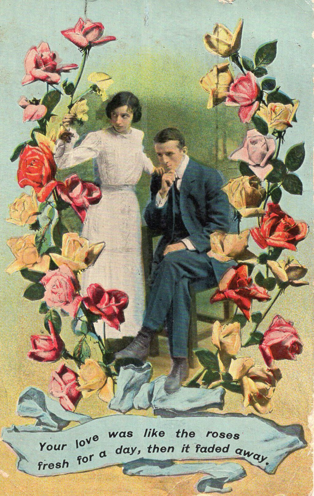 A postcard of a couple surrounded by roses with the words "Your love was like the roses fresh for a day, then it faded away" printed on it.Condition