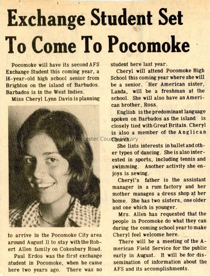 Newspaper clipping, “Exchange Student Set To Come To Pocomoke” (Cheryl Davis), 1976Entry/Object ID