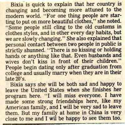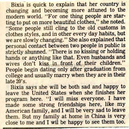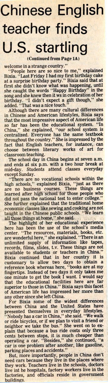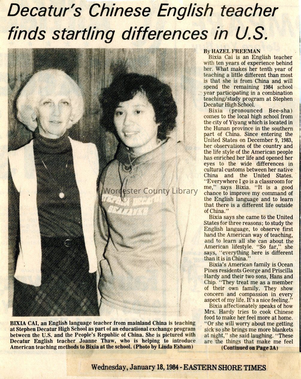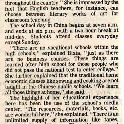 Newspaper clipping, “Decatur’s Chinese English teacher finds startling differences in U.S.,” Jan. 18, 1984Entry/Object ID