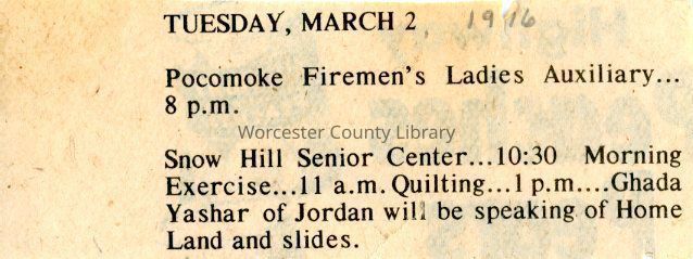 Newspaper clipping, Ghada Yashar speaking at Snow Hill Senior Center, Mar. 1976Entry/Object ID