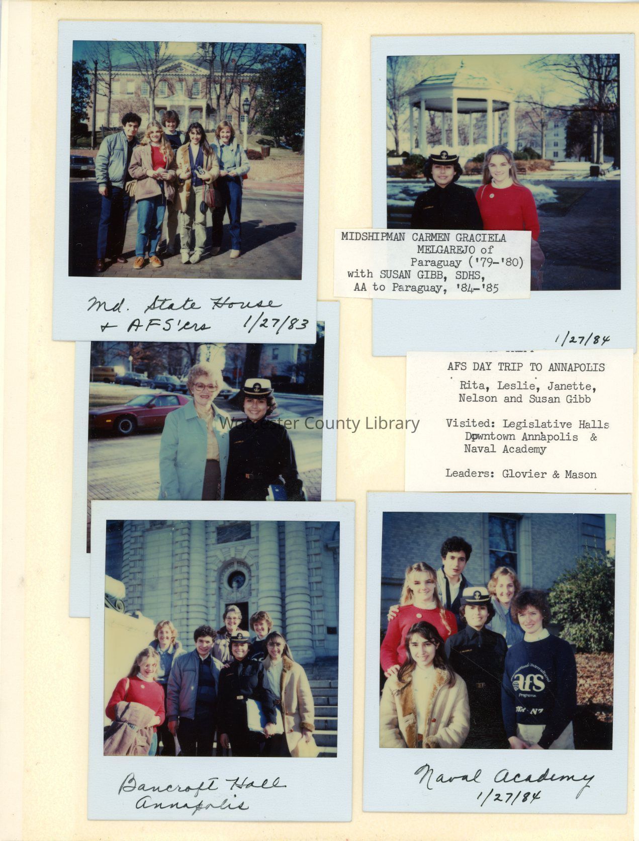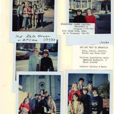 Photograph of Rita Barchetti, Leslie Murray, Janette, Nelson Hincatie, Susan Gibb, Carmen Graciela Melgarejo, Joanne Mason and in front of Bancroft Hall in Annapolis, Jan 1984Entry/Object ID