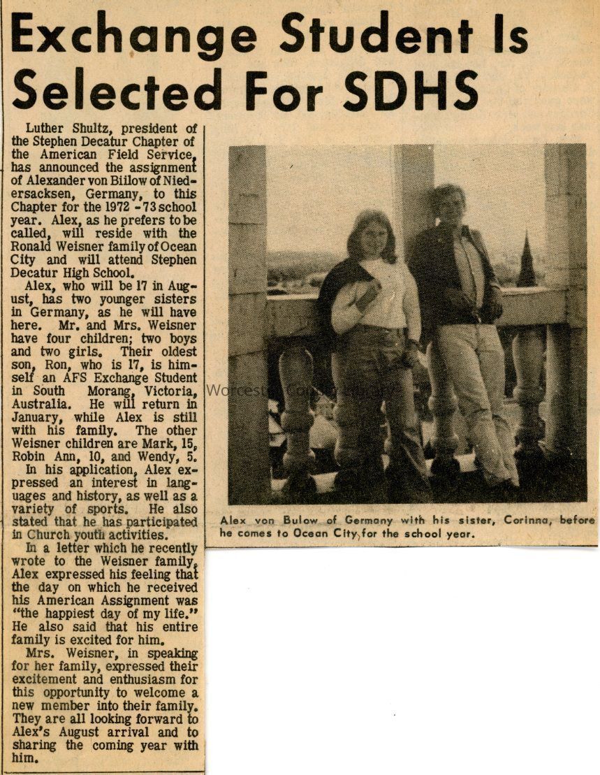 Luther Shultz, president of the Stephen Decatur Chapter of the American Field Service, has announced the assignment of Alexander von Biilow of Niedersacksen, Germany, to this Chapter for the 1972-73 school year. Alex, as he prefers to be called, will reside with the Ronald Weisner family of Ocean City and will attend Stephen Decatur High School.