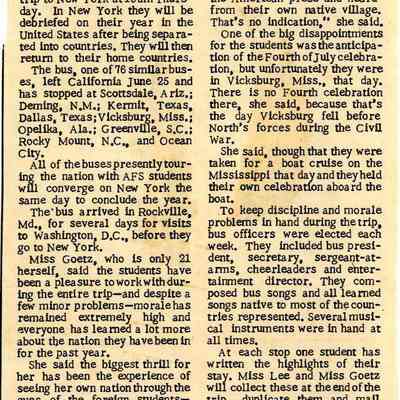 Miss Goetz pointed out, too, that the program is non-political and non-religious. Among the students on the bus were those from Israel, the United Arab Republic and Viet Nam. "Some places we stopped they were asked to comment on the situations in their home country,' said Miss Goetz, "but they don't know anymore than we do- all they know is what they've read in the American press and heard from their own native village. That's no indication," she said.