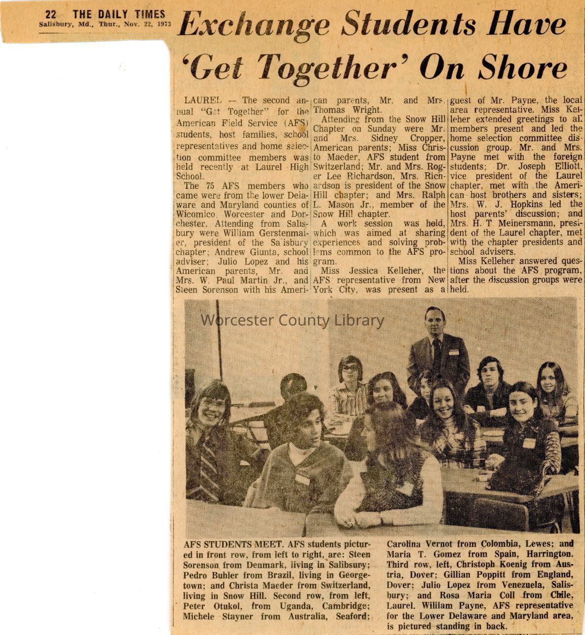 Pedro E. Buhler, Rosa Maria Coll, Mabel Eloise Parker Cropper, Sewell Sidney Cropper, Dr. Joseph Elliott, William Gerstenmaier, Andrew Giunta, Maria T. Gomez, Mrs. W. J. Hopkins, Jessica Kelleher, Christoph Koenig, Julio Lopez, Christa Mader, William Paul Martin, Jr., Geraldine B. Hall Martin, Joanne Dickerson Mason, Mrs. H. T. Meinersmann, Peter A. Otukol, William Payne, Mrs. William Payne, Gillian A. Poppitt, Fay Richardson, Roger Lee Richardson, Steen K. Sorensen, Michele L. Stayner, Carolina Vernot, Thomas Wright, Mrs. Thomas Wright, American Field Service, Laurel High School, Snow Hill High School