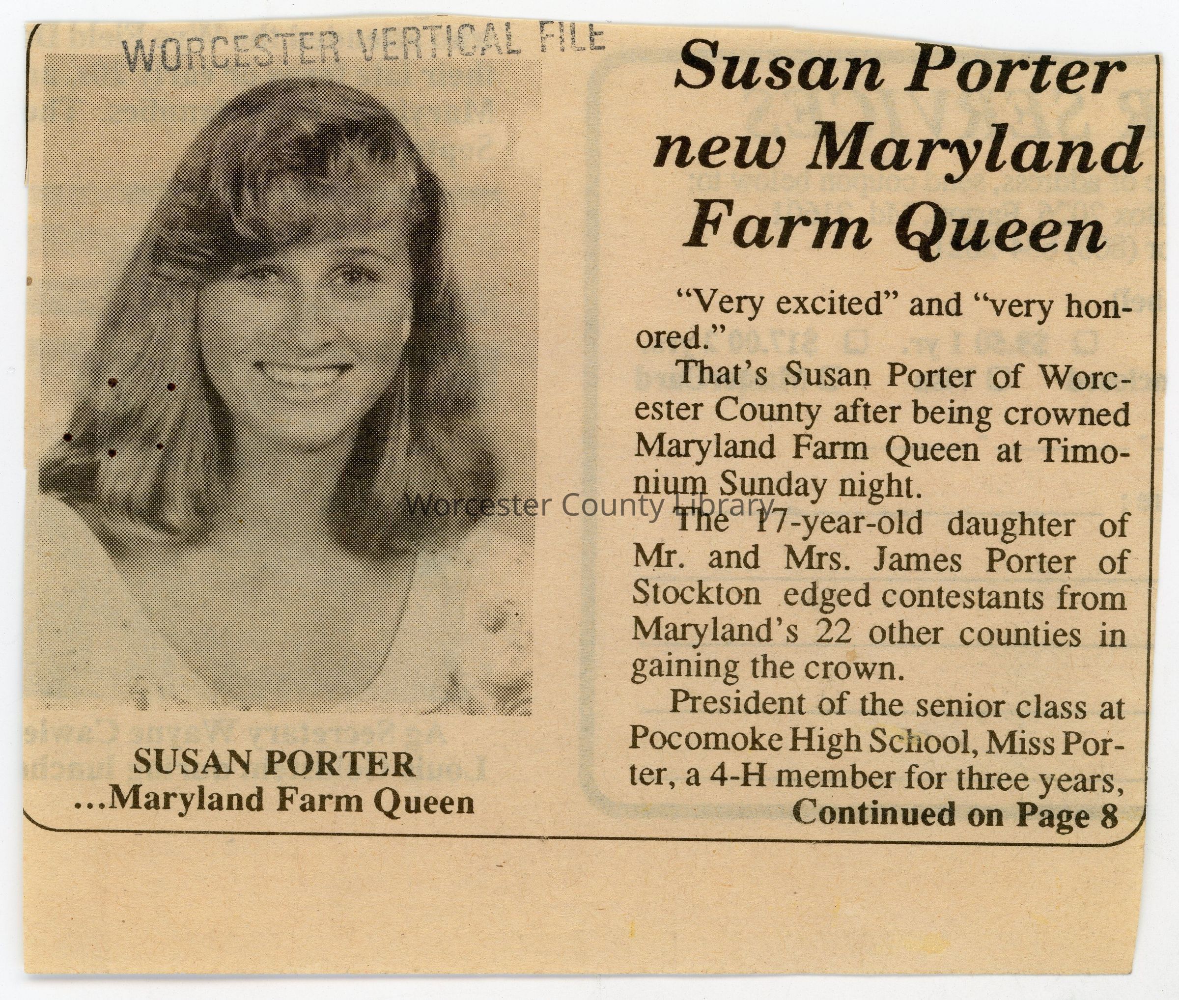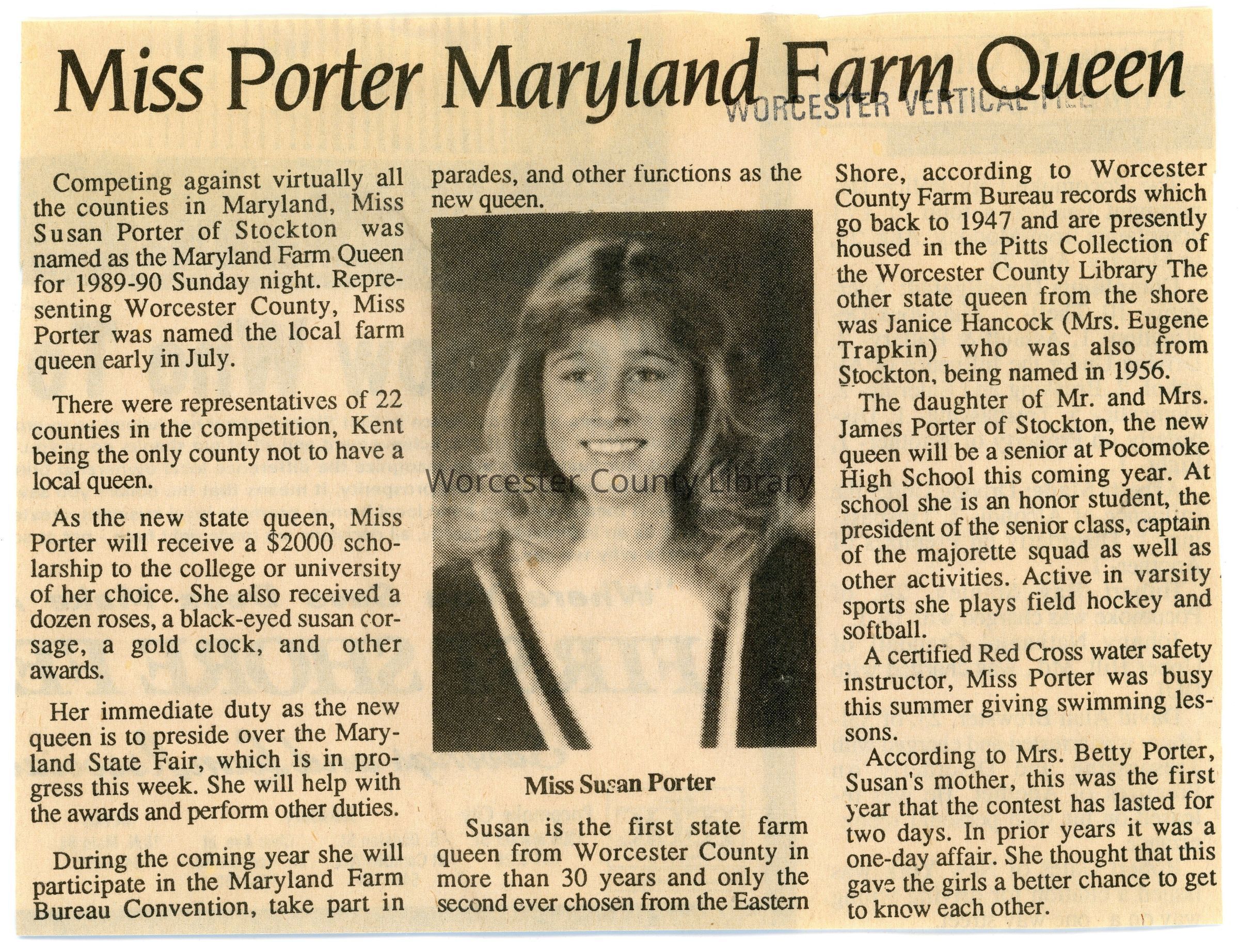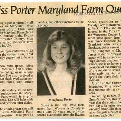 Newspaper clipping, "Susan Porter new Maryland Farm Queen," 1989Entry/Object ID