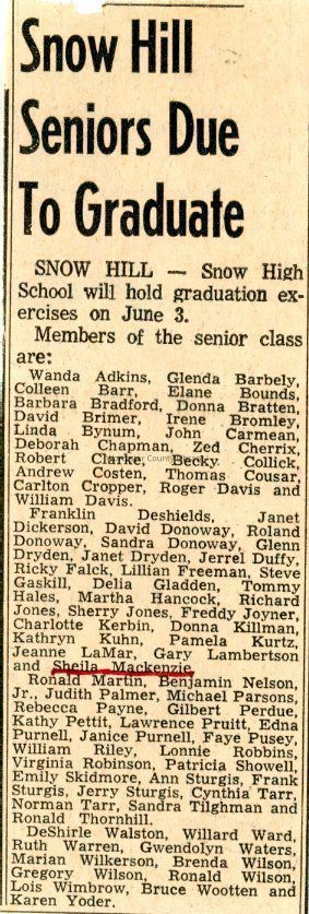 Wanda Adkins, Glenda Barbely, Colleen Louise Barr, Barbara Bradford, Donna Bratten, David Brimer, Irene Linda Bromley, Linda Kaye Bynum, John Carmean, Deborah Ann Chapman, Zadok Henry Cherrix IV, Robert George Clarke, Yvonne Becky Collick, Andrew Costen, Thomas Cousar, Carlton Cropper, Roger Davis, William Davis, Franklin Deshields, Janet Dickerson, David Donoway, Sandra Donoway, Glenn Dryden, Jerrel Duffy, Ricky Falck, Lillian Freeman, Steve Gaskill, Thomas Paul Hales III, Martha Payne Hancock, Richard Jones, Sherry Ann Jones, Frederick Humphreys Joyner, Donna Marie Killman, Kathryn Erna Kuhn, Pamela Elizabeth Kurtz, Jeanne Lynette LaMar Hood, Gary Dale Lambertson, Ronald Dale Martin, Benjamin Wilbern Nelson, Jr., Judith Marie Palmer, Michael Thomas Parsons, Gilbert Fooks Perdue, Jr., Kathy Jean Pettit, Lawrence Odell Pruitt, Jr., Edna Verline Purnell, Janice Faye Purnell Schuler, Sarah Faye Pusey, William Mitchell Riley, Lonnie Roscellus Robbins, Virginia Louise Robinson, Patricia Ann Showell, Emily Elizabeth Skidmore, Ann Bishop Sturgis Coates, Frank Wayne Sturgis, Jerry Neil Sturgis, Cynthia Anne Tarr, Norman Henry Tarr, Jr., Ronald Rubin Thornhill, Sandra Lee Tilghman, Willard Walter Ward, Gwendolyn Faye Waters, Brenda Helen Wilson, Norman Gregory Wilson, Ronald Mitchell Wilson, Lois Ann Wimbrow Rogers, Robert Bruce Wootten, Karen Arlene Yoder, Janet Dryden Pusey Rayne, Anna Elane Bounds Frick, Sheila Margaret Mackenzie Emslie, Delia Mae Gladden, Rebecca Lee Payne Hauck, Charlotte Morgan Kerbin Cathell, Deshirle Novella Walston, Ruth Joyce Warren, Marian Elizabeth Wilkerson Lowe