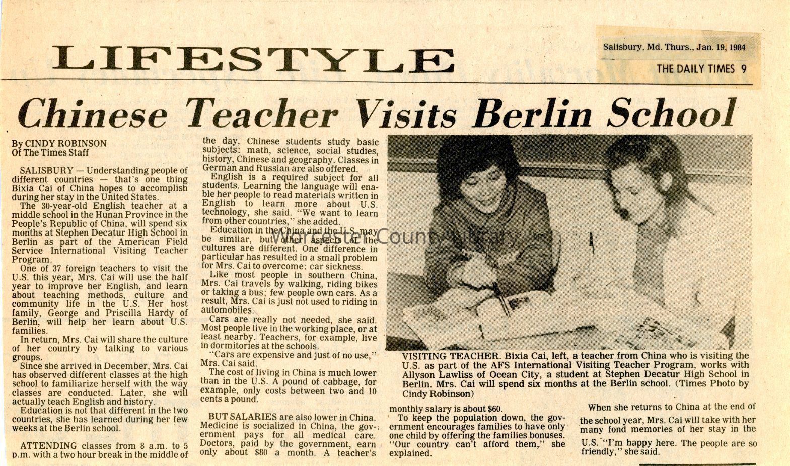 Newspaper clipping, “Chinese Teacher Visits Berlin School,” Jan. 19, 1984Entry/Object ID